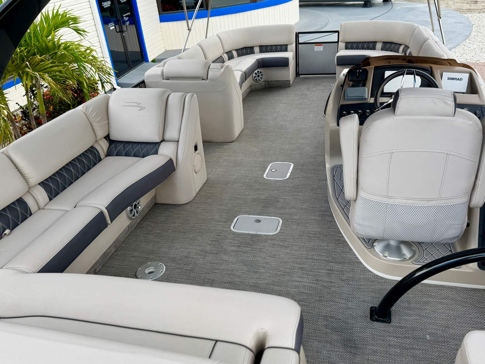 The Bennington 28 QSRFBX1 3T is thoughtfully designed to enhance your boating experience with a range of features and specifications that cater to both comfort and convenience. The spacious deck layout provides plenty of room for seating, entertaining, and relaxing, while the high-quality construction ensures durability and longevity. The pontoon’s generous length of over 28 feet allows for a versatile arrangement of seating and amenities, making it ideal for hosting gatherings or enjoying quiet moments on the water.With its modern styling and attention to detail, this Bennington pontoon boat offers a premium boating experience. The ergonomic helm station provides easy access to controls and instrumentation, allowing the captain to navigate with confidence and ease. The plush seating and ample storage options ensure that everyone on board can relax in comfort, while keeping personal items and gear organized and out of the way.