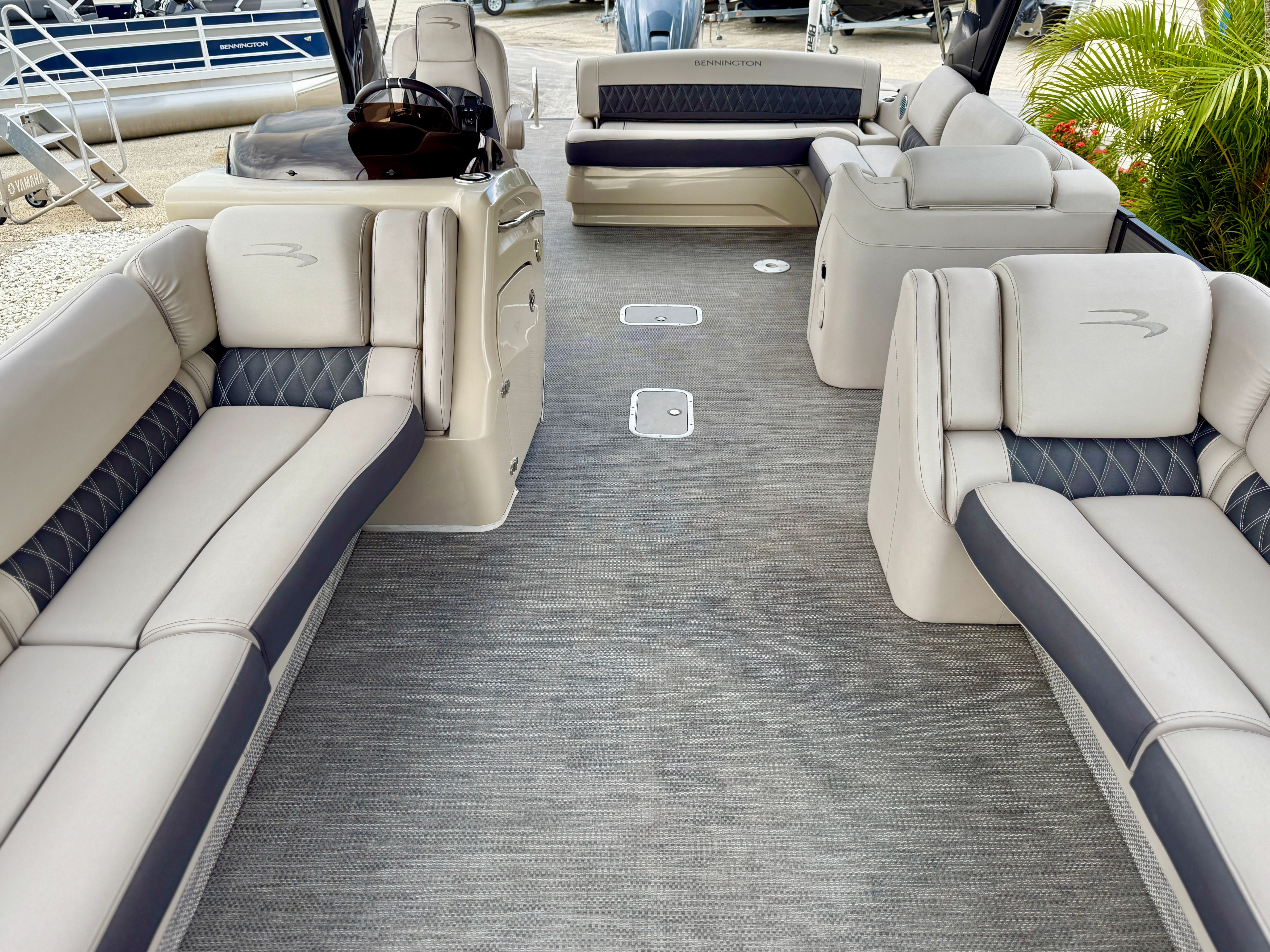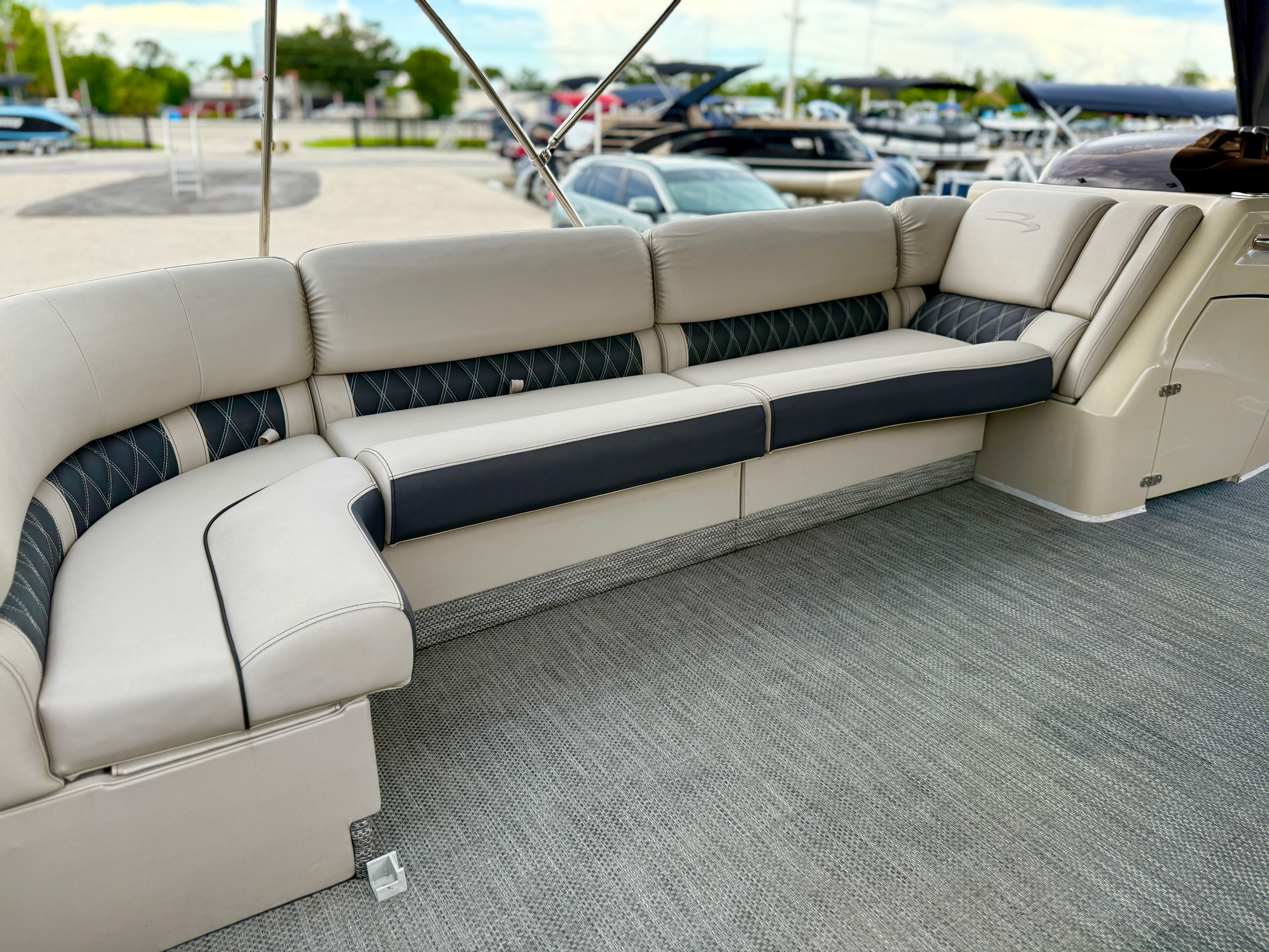 This Bennington 28 QSRFBX1 3T pontoon boat is perfectly suited for a wide range of activities and occasions. Imagine hosting a sunset cruise with friends, where everyone can relax in comfort and style as you glide across the water. Family outings become unforgettable adventures, with plenty of space for kids to play and adults to unwind. The powerful engine makes it easy to tow water toys or explore new destinations, while the spacious deck is ideal for picnics, sunbathing, or simply enjoying the view.For those who love fishing, the stable platform and ample seating provide a comfortable and convenient base for casting lines and reeling in the catch of the day. The versatility of this pontoon boat means it can adapt to your needs, whether you are seeking excitement, relaxation, or a bit of both.