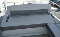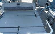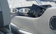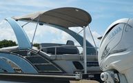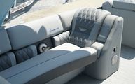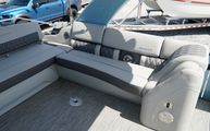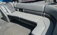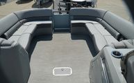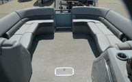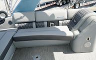 This model features Bennington’s Quad Bench layout, maximizing passenger space with wraparound, pillowtop diamond-stitched seating. Plush loungers at both ends offer ample room to kick back in comfort, while the Fastback rear seating with built-in Kicker speakers delivers front-row sound and style for those anchored out at the sandbar. The Power Folding Sport Arch adds a sporty profile and houses additional speakers, ideal for both function and flair.
