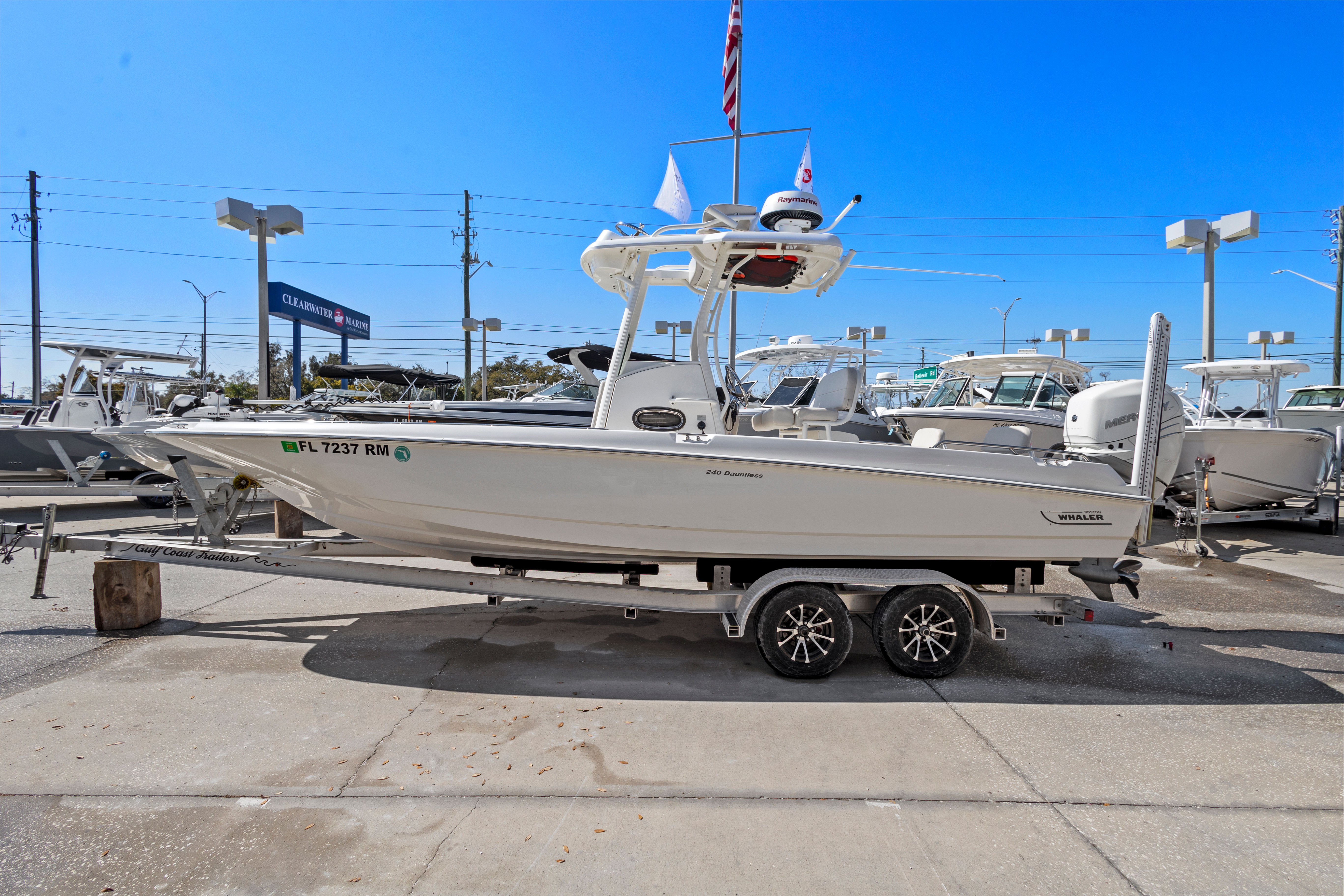 The Boston Whaler 240 Dauntless Pro is designed with features that enhance both leisure and functionality. Its Bowrider configuration offers a spacious and comfortable seating arrangement, perfect for socializing and enjoying panoramic views. The open bow area invites passengers to relax and soak up the sun, while the ergonomic layout ensures everyone has plenty of room to move about. The boat’s durable construction and thoughtful design elements reflect Boston Whaler’s commitment to safety and quality, giving you peace of mind as you explore new waters.Special features of the 240 Dauntless Pro include advanced hull design for a smooth and stable ride, ample storage compartments for gear and personal items, and a versatile deck layout that accommodates both fishing and recreational activities. The intuitive helm station puts all controls within easy reach, allowing for effortless navigation and operation. With its combination of comfort, convenience, and performance, this Bowrider is equipped to handle a wide range of boating adventures.