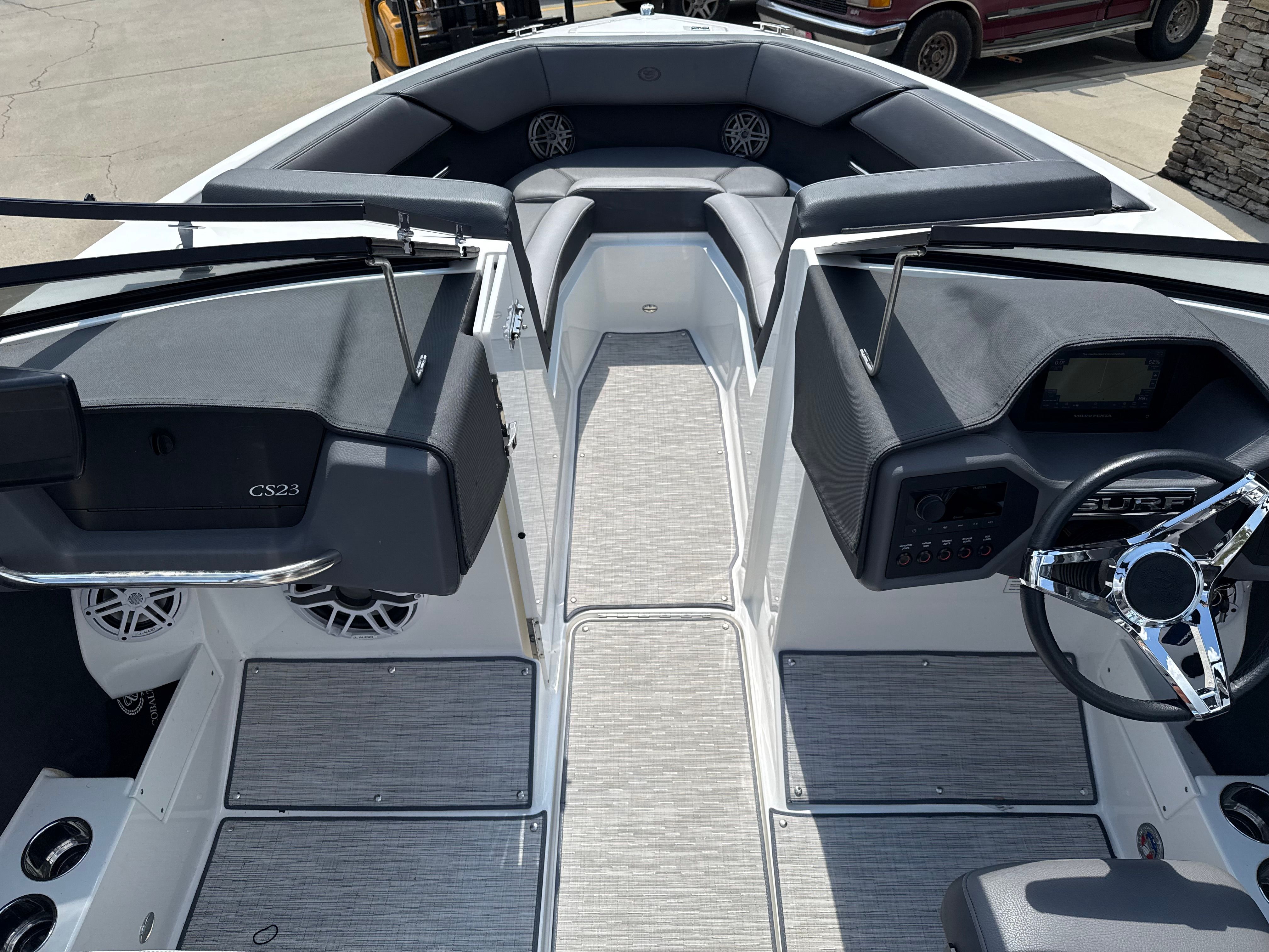 The 2024 Cobalt CS23 Surf is packed with features that enhance both its performance and comfort. As a bowrider, it offers an open and inviting layout, with plush seating in the bow and cockpit areas, allowing guests to relax and socialize with ease. The boat’s 23.4-foot length provides plenty of room for family and friends, making it perfect for group outings.Special features on the CS23 Surf include a surf-specific hull design that creates ideal wakes for wake surfing and other water sports. The intuitive controls and surf system allow you to customize the wave shape and size, ensuring a tailored experience for riders of all skill levels. The high-quality materials and finishes throughout the boat reflect Cobalt’s commitment to luxury and durability, while the ergonomic helm station puts all controls within easy reach for the captain.With its stylish lines, premium upholstery, and attention to detail, the CS23 Surf is as visually impressive as it is functional. The open bow area is perfect for sunbathing or enjoying the breeze, while the spacious cockpit provides a comfortable gathering spot for conversation and refreshments.