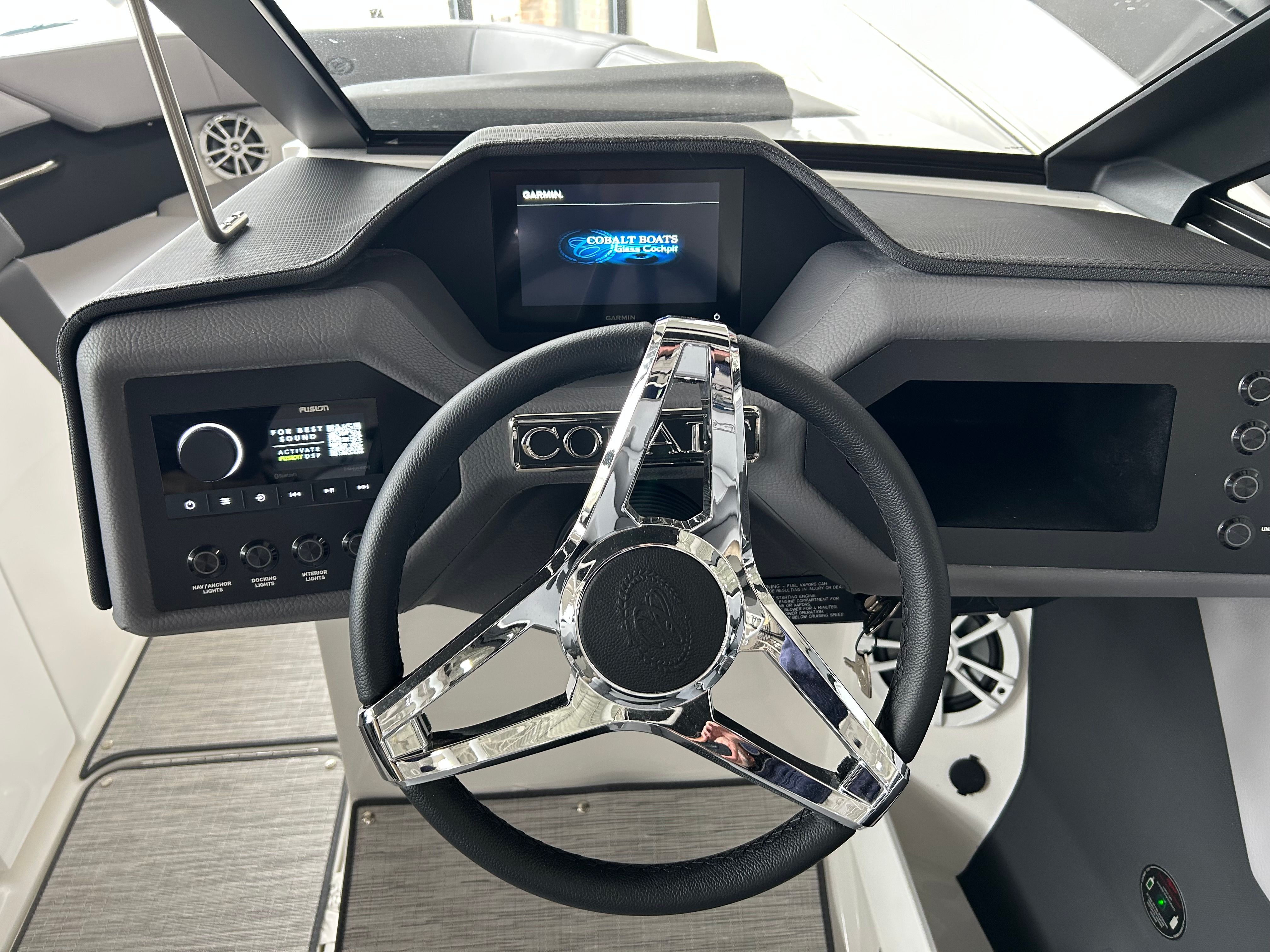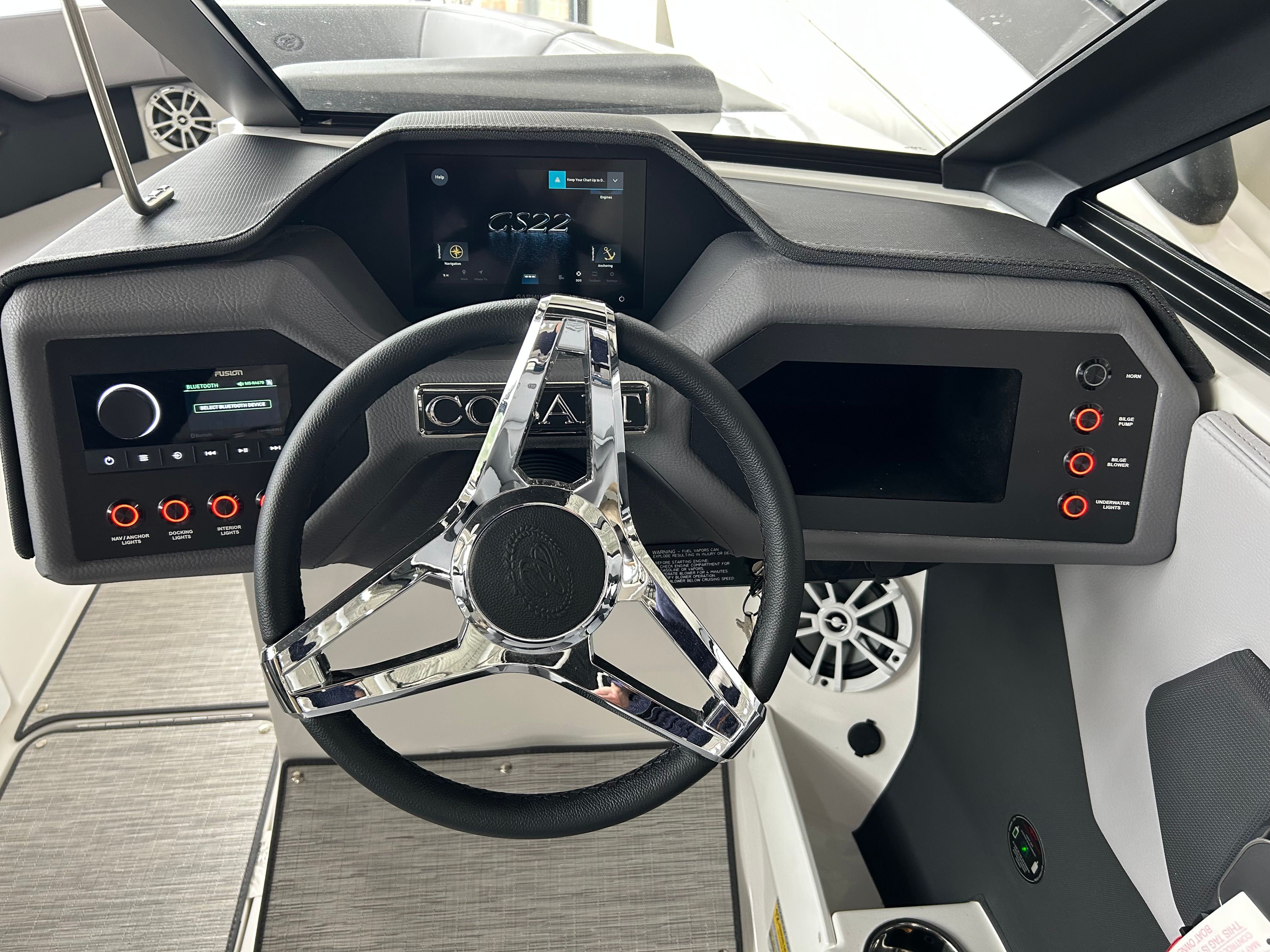 Practicality is at the core of the Cobalt CS23’s design. The boat’s manageable length makes it easy to dock, trailer, and store, while the folding tower allows for convenient storage in garages or boat houses with height restrictions. The Silver Ash seagrass flooring is both stylish and functional, offering a slip-resistant surface that is easy to clean after a day of fun. The depth and water/air temperature gauge package provides valuable information for safe navigation and optimal enjoyment, whether you are fishing, swimming, or simply exploring new waters.The CS23’s layout is designed for versatility, with plenty of storage compartments to keep your gear organized and out of the way. The manual adjustable seat ensures that drivers of all sizes can find a comfortable position, making long days on the water more enjoyable. The automatic fire extinguisher system adds an extra layer of safety, giving you confidence as you embark on new adventures.