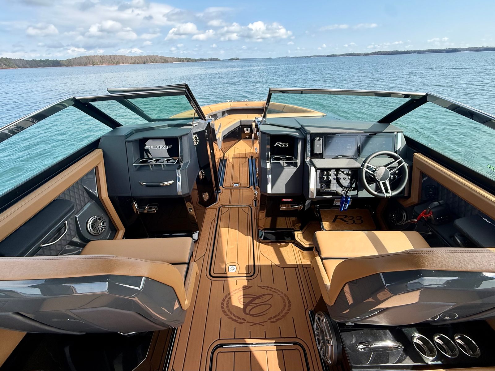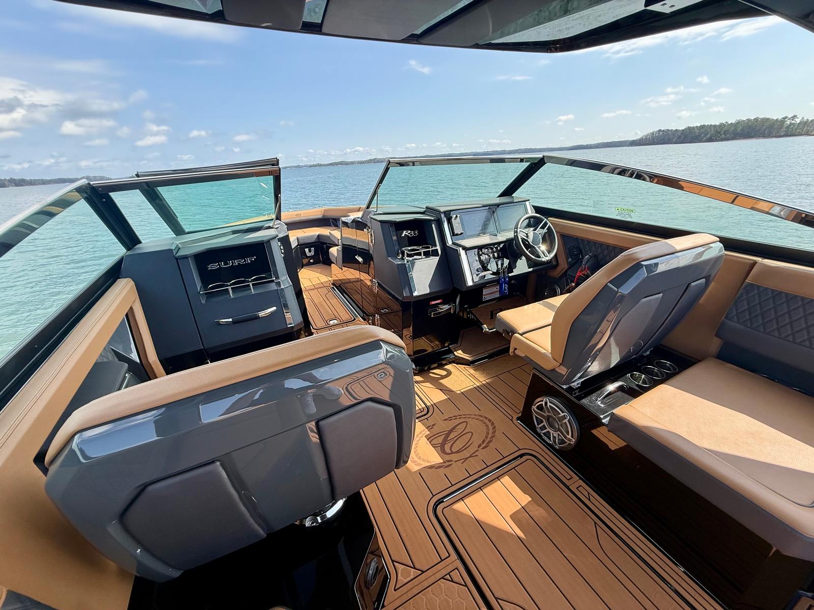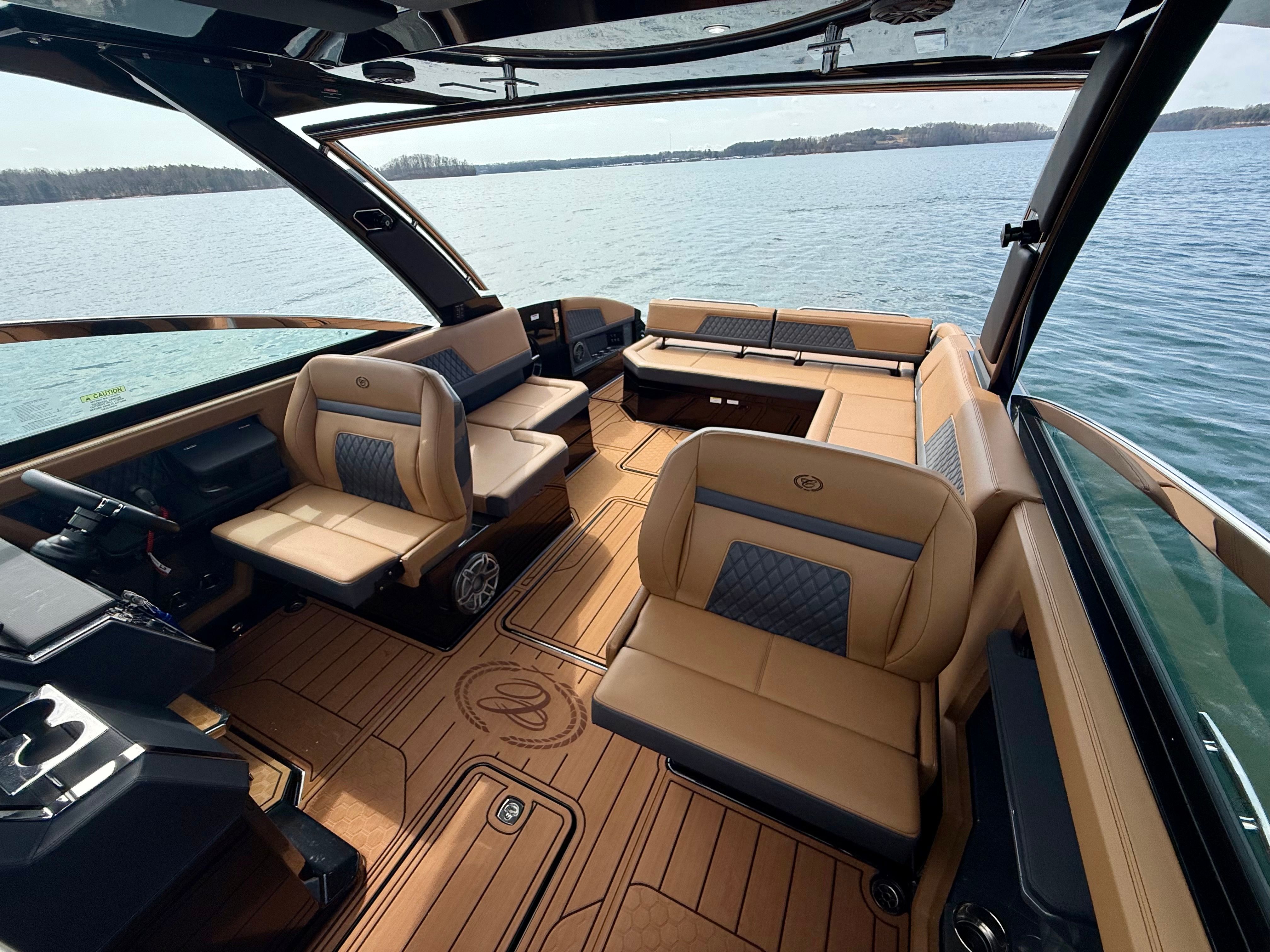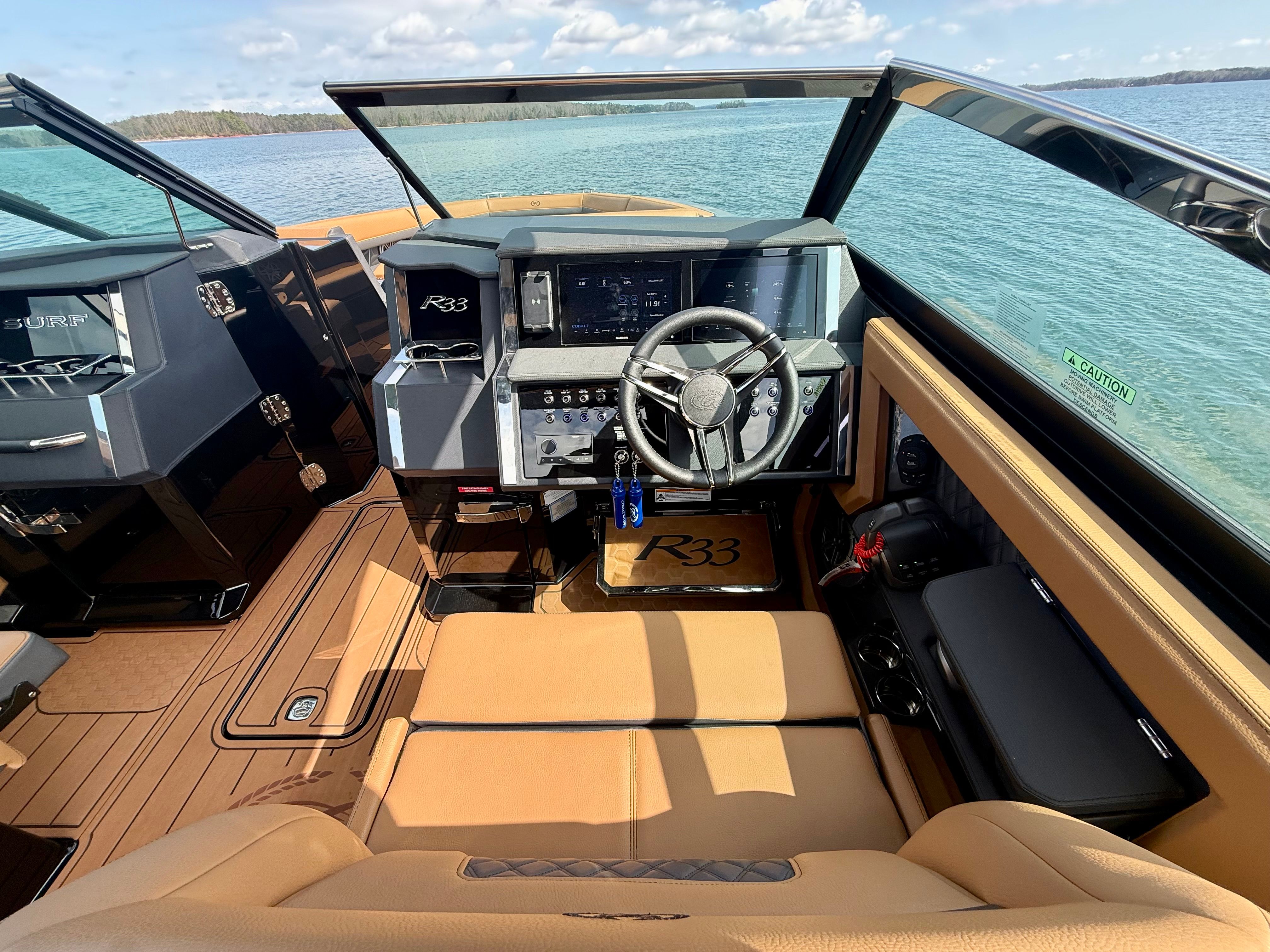 The Cobalt R33 Surf is packed with premium features that elevate your boating experience. The arch with hard top provides both style and functionality, offering shade and protection from the elements while maintaining an open and airy feel. The electric awning in sleek black extends effortlessly, creating a comfortable space for relaxation or entertaining guests. The aft walk-thru gate and boarding door make it easy to access the water or dock, enhancing safety and convenience for everyone on board.Inside, the cockpit showcases a luxurious interior finished in Caramel, Carbon, and Ebony, creating a sophisticated and inviting atmosphere. The Cobalt letters with flag emblem in black satin add a touch of elegance and brand distinction. For those cooler days on the water, the cockpit heater ensures that everyone stays warm and comfortable, extending your boating season well into the cooler months.Additional features such as the battery maintainer/charger (110V) keep your boat ready for action, while the board rack covers and PTM provide practical solutions for storing and protecting your gear. Every detail of the R33 Surf is designed with the owner’s comfort and convenience in mind.