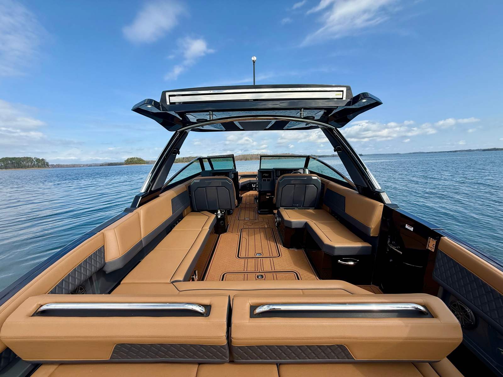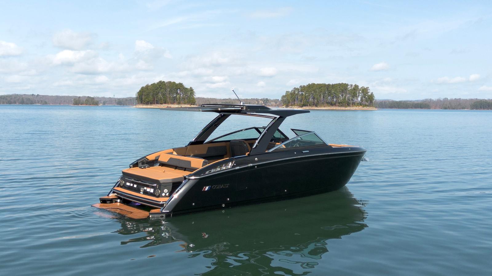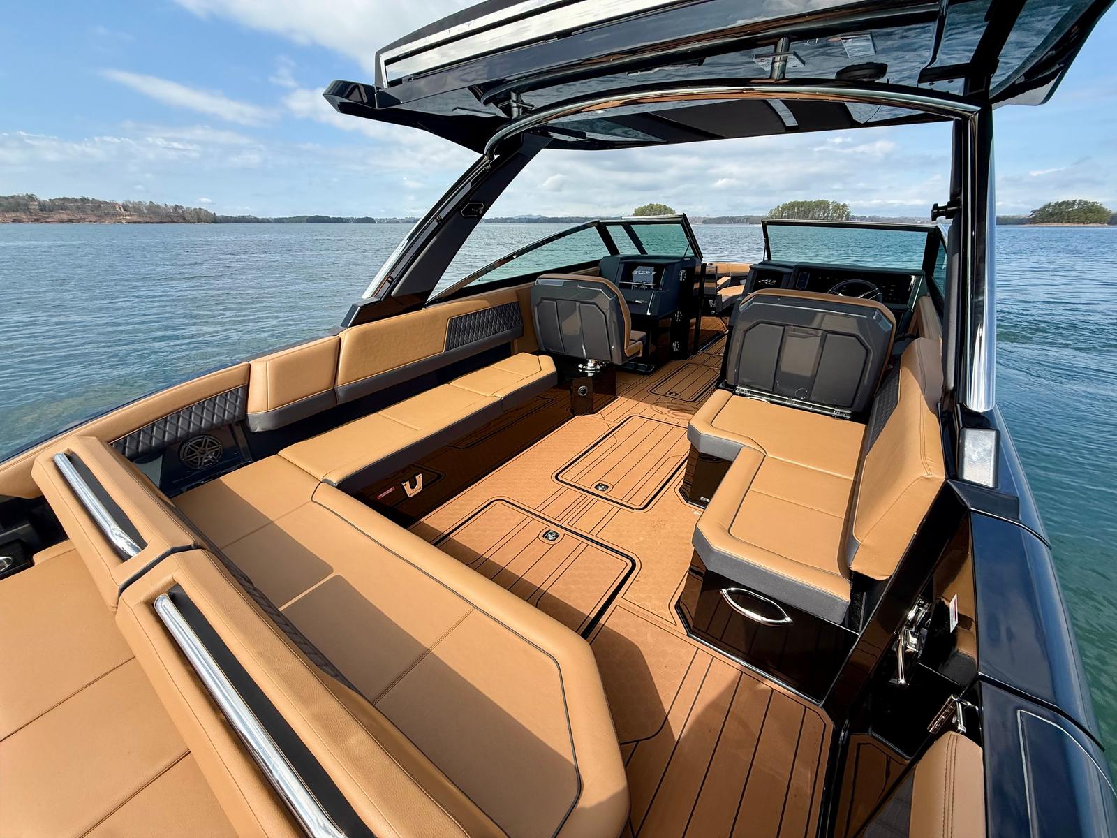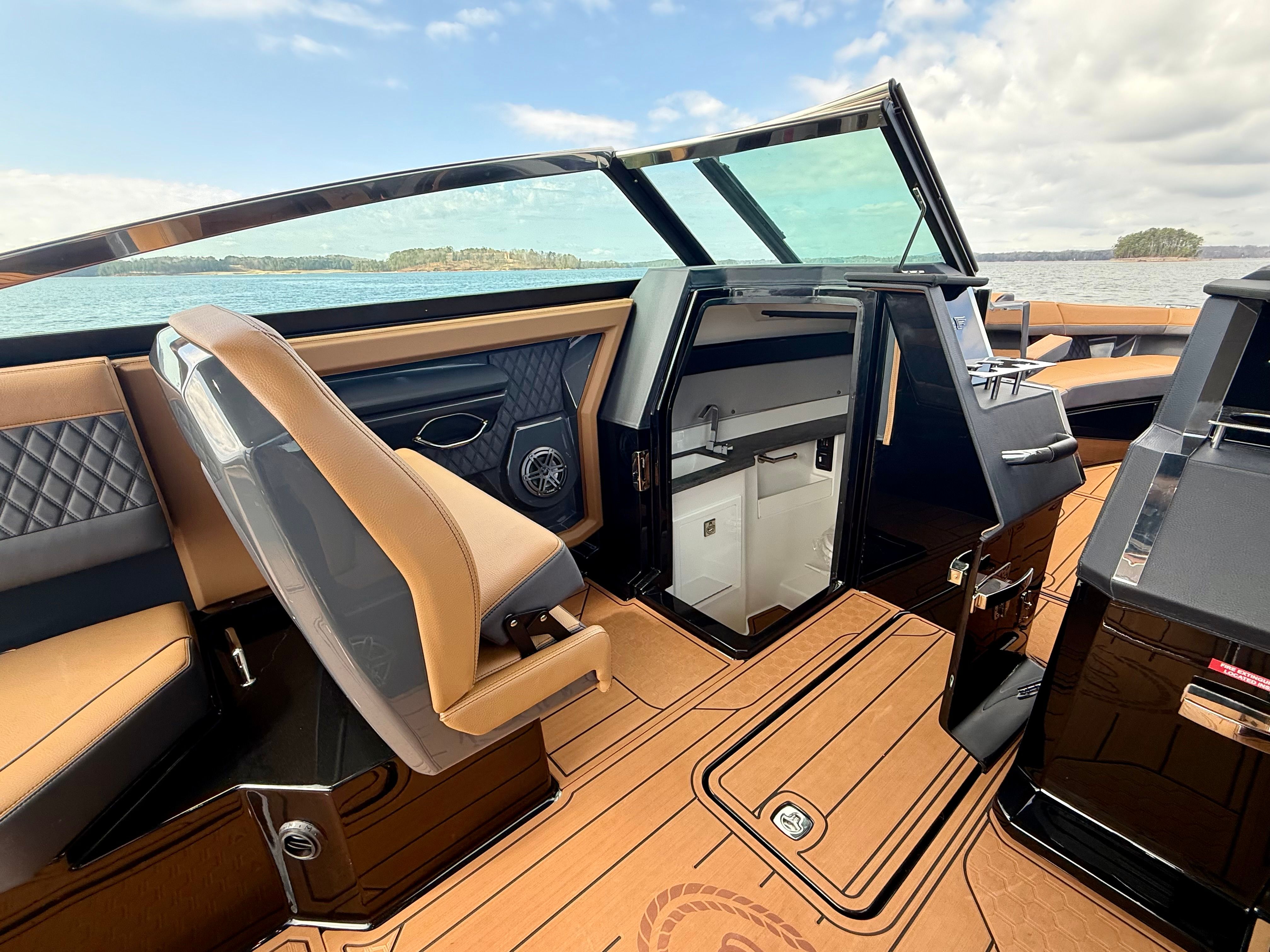 The Cobalt R33 Surf is packed with premium features that elevate your boating experience. The arch with hard top provides both style and functionality, offering shade and protection from the elements while maintaining an open and airy feel. The electric awning in sleek black extends effortlessly, creating a comfortable space for relaxation or entertaining guests. The aft walk-thru gate and boarding door make it easy to access the water or dock, enhancing safety and convenience for everyone on board.Inside, the cockpit showcases a luxurious interior finished in Caramel, Carbon, and Ebony, creating a sophisticated and inviting atmosphere. The Cobalt letters with flag emblem in black satin add a touch of elegance and brand distinction. For those cooler days on the water, the cockpit heater ensures that everyone stays warm and comfortable, extending your boating season well into the cooler months.Additional features such as the battery maintainer/charger (110V) keep your boat ready for action, while the board rack covers and PTM provide practical solutions for storing and protecting your gear. Every detail of the R33 Surf is designed with the owner’s comfort and convenience in mind.