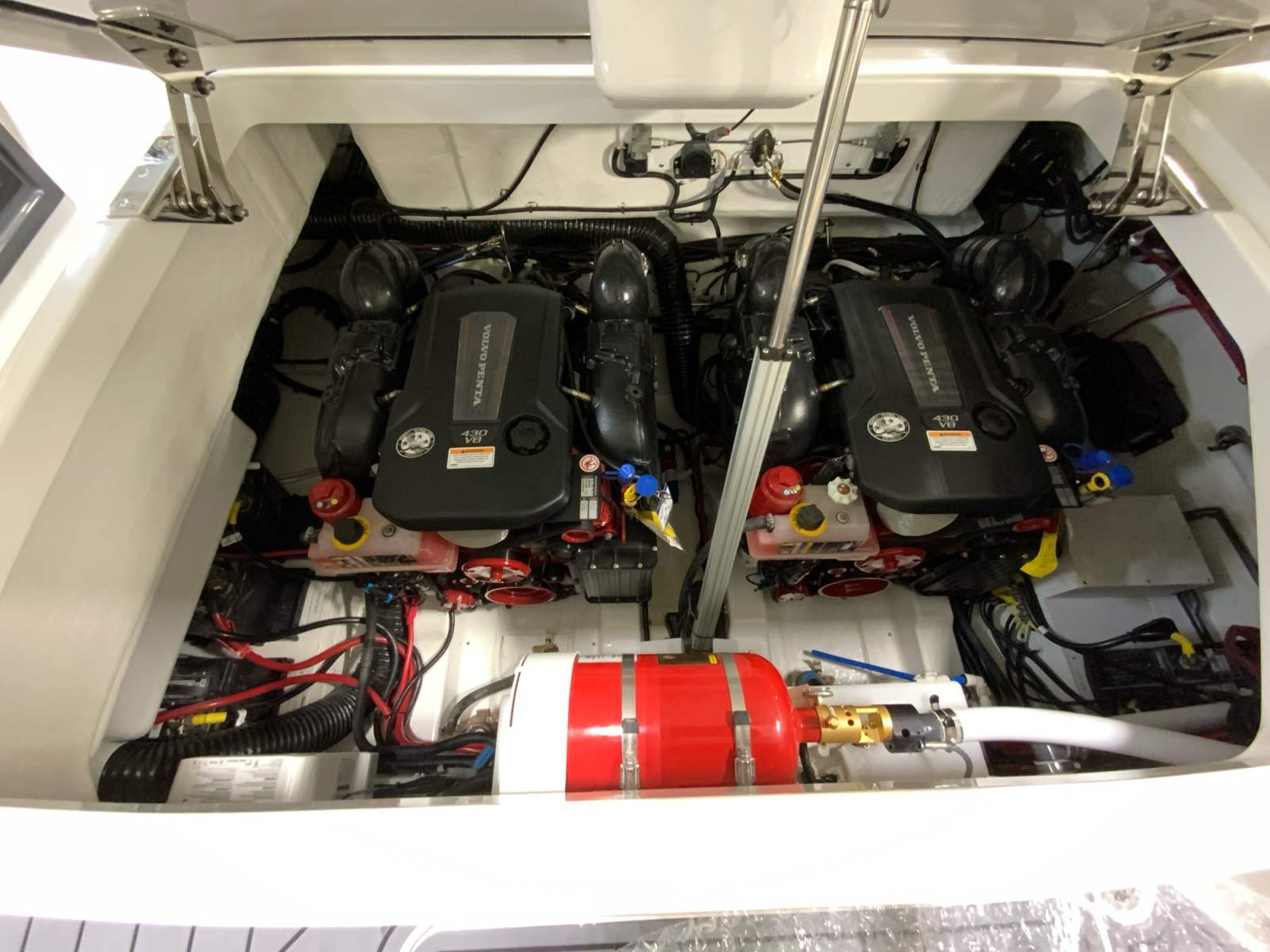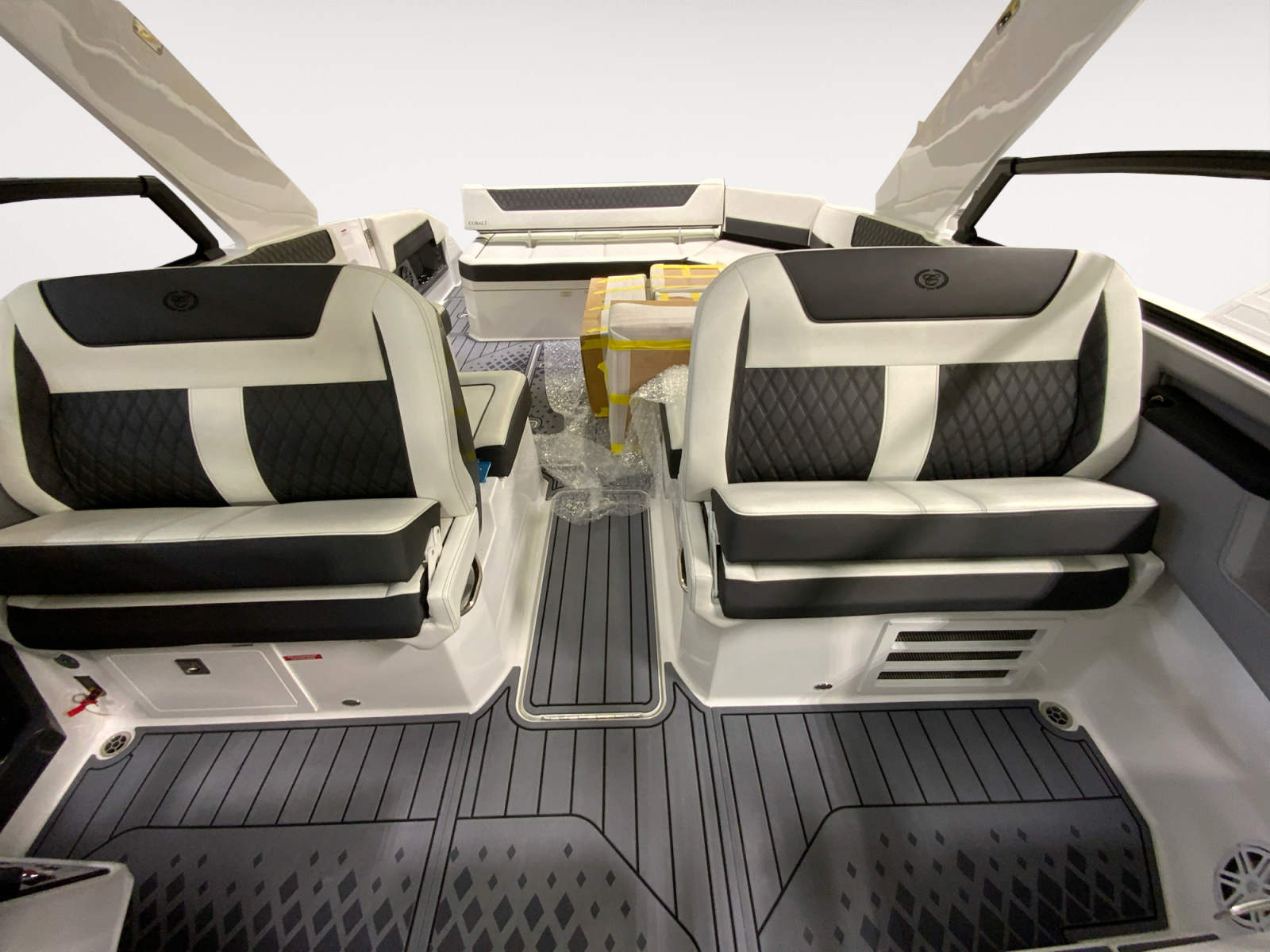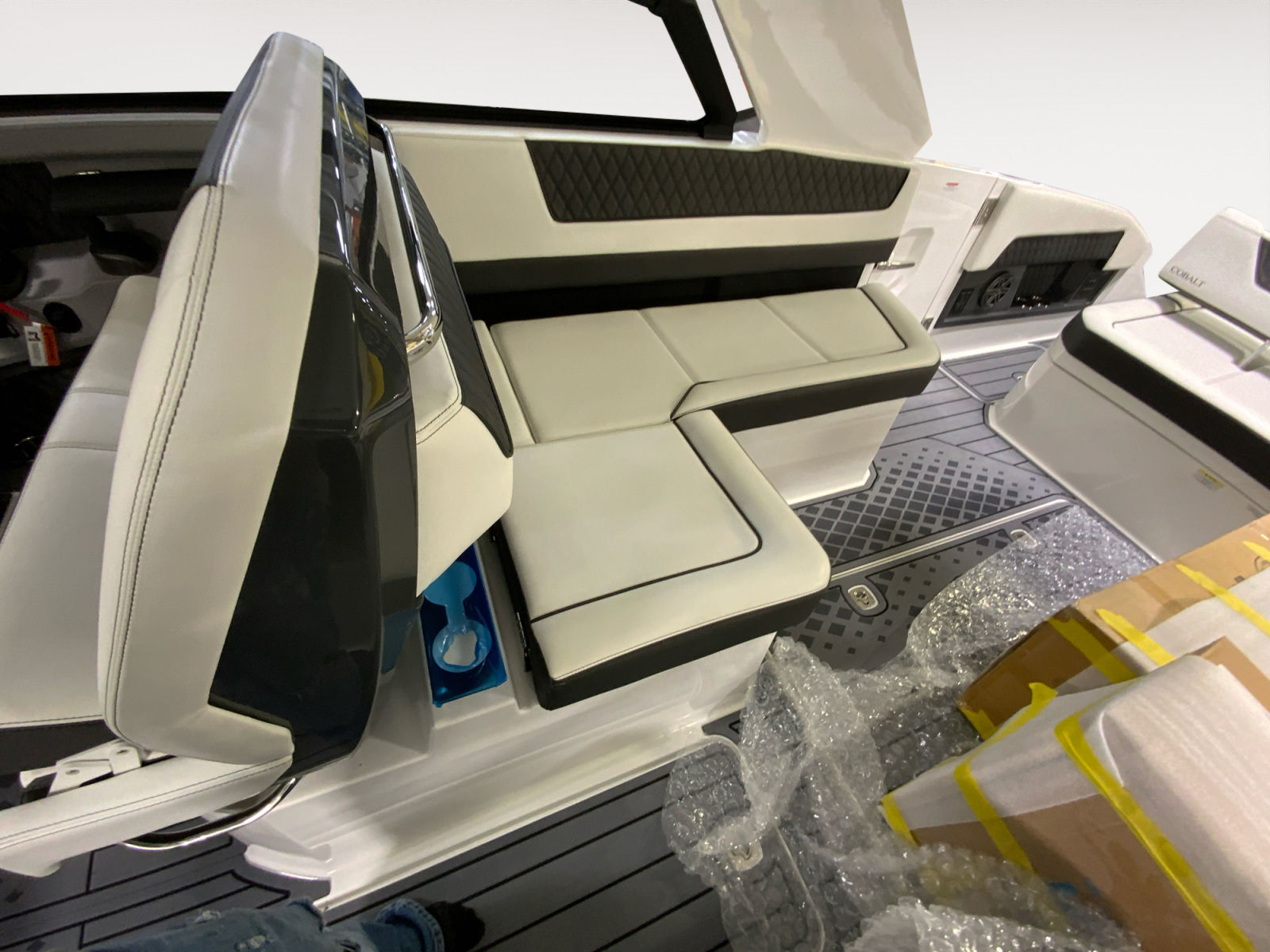Beyond its recreational appeal, the Cobalt R35 Surf offers practical benefits that make ownership a breeze. The ample storage compartments keep your gear organized and out of the way, while the intuitive layout ensures easy movement throughout the boat. Docking is simplified by the responsive handling and advanced propulsion system, giving you confidence in tight spaces.Fuel efficiency is enhanced by the modern Volvo engines, allowing you to spend more time on the water and less time at the pump. The air compressor with holder is a thoughtful addition for inflating towables or paddleboards, adding convenience to your outings. The cockpit galley’s sink, grill, and microwave make it easy to host gatherings or enjoy a meal without leaving the water.