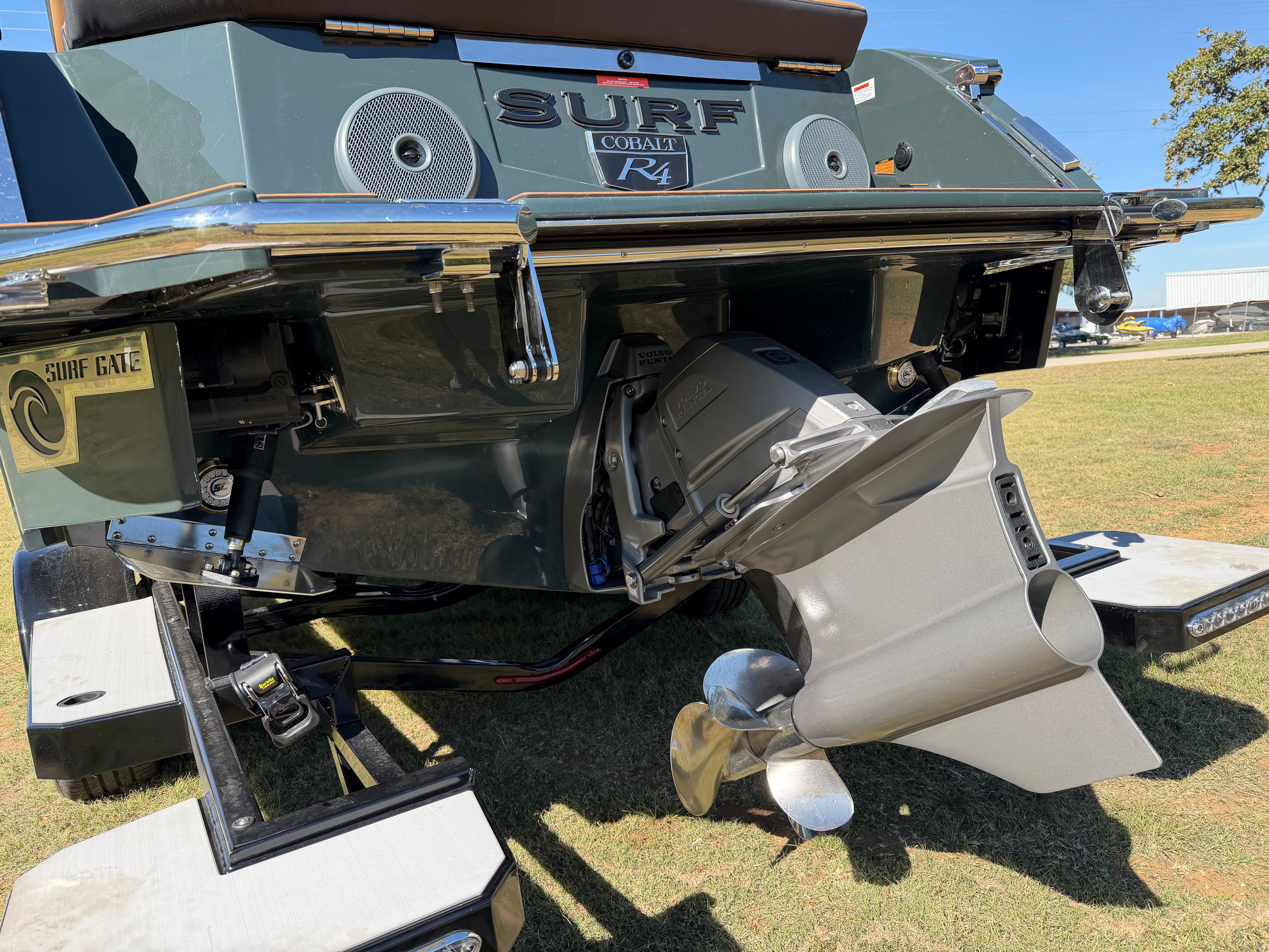 Step aboard the Cobalt R4 Surf and discover a host of premium features designed to enhance every moment on the water. The aft facing rumble seat provides a comfortable spot to relax and take in the scenery, while the aft shade sail in sleek black offers protection from the sun without sacrificing style. The air compressor with holder is perfect for inflating water toys or equipment, adding convenience to your adventures.A battery maintainer/charger (110V) ensures your boat is always ready to go, while bow filler cushions create a versatile lounging area up front. The rear-facing camera adds an extra layer of safety and convenience, making docking and maneuvering a breeze. The caramel, carbon, and ebony interior exudes sophistication, complemented by black satin Cobalt letters for a touch of elegance.Enjoy meals and snacks on the water with the solid teak dinette table, complete with a cockpit receptacle for easy setup. Stainless steel docking lights not only enhance visibility but also add a polished look to the boat’s exterior. Every detail of the R4 Surf is crafted with comfort, style, and functionality in mind, ensuring you get the most out of your time on the water.
