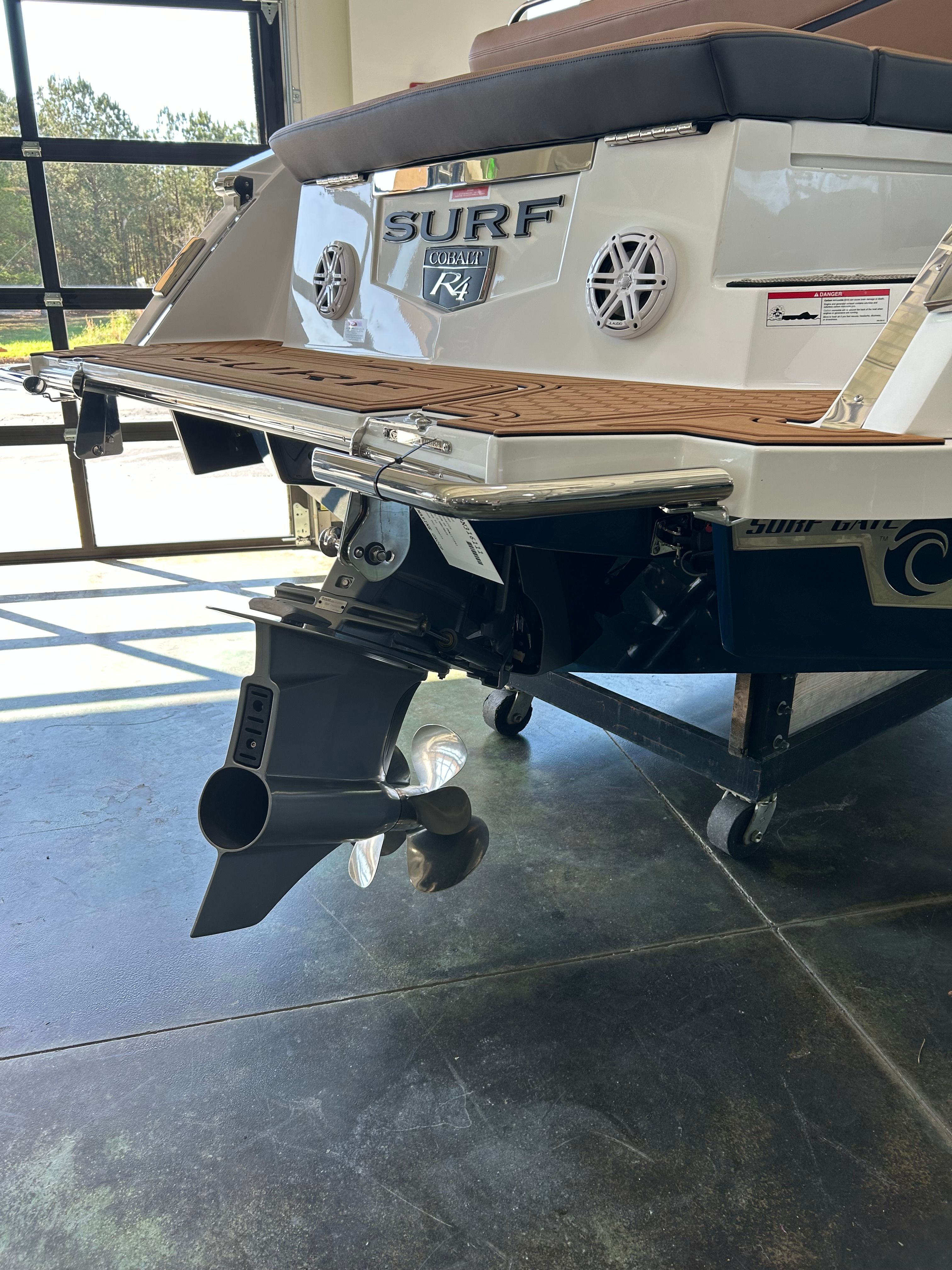 The Cobalt R4 Surf is as practical as it is luxurious. The battery maintainer/charger keeps your systems powered and ready, reducing maintenance hassles and maximizing your time on the water. Fender clips with line simplify the docking process, making it easy to secure your boat quickly and safely. The stainless steel docking lights improve visibility during low-light conditions, adding an extra layer of safety and convenience.The folding electric arch with bimini provides flexible shade options, allowing you to adapt to changing weather conditions with ease. The seagrass floor covering is not only stylish but also easy to clean and maintain, ensuring your boat stays looking its best season after season. The dual Volvo 8610 glass cockpit displays put all essential controls and navigation information at your fingertips, streamlining operation and enhancing your confidence as captain.