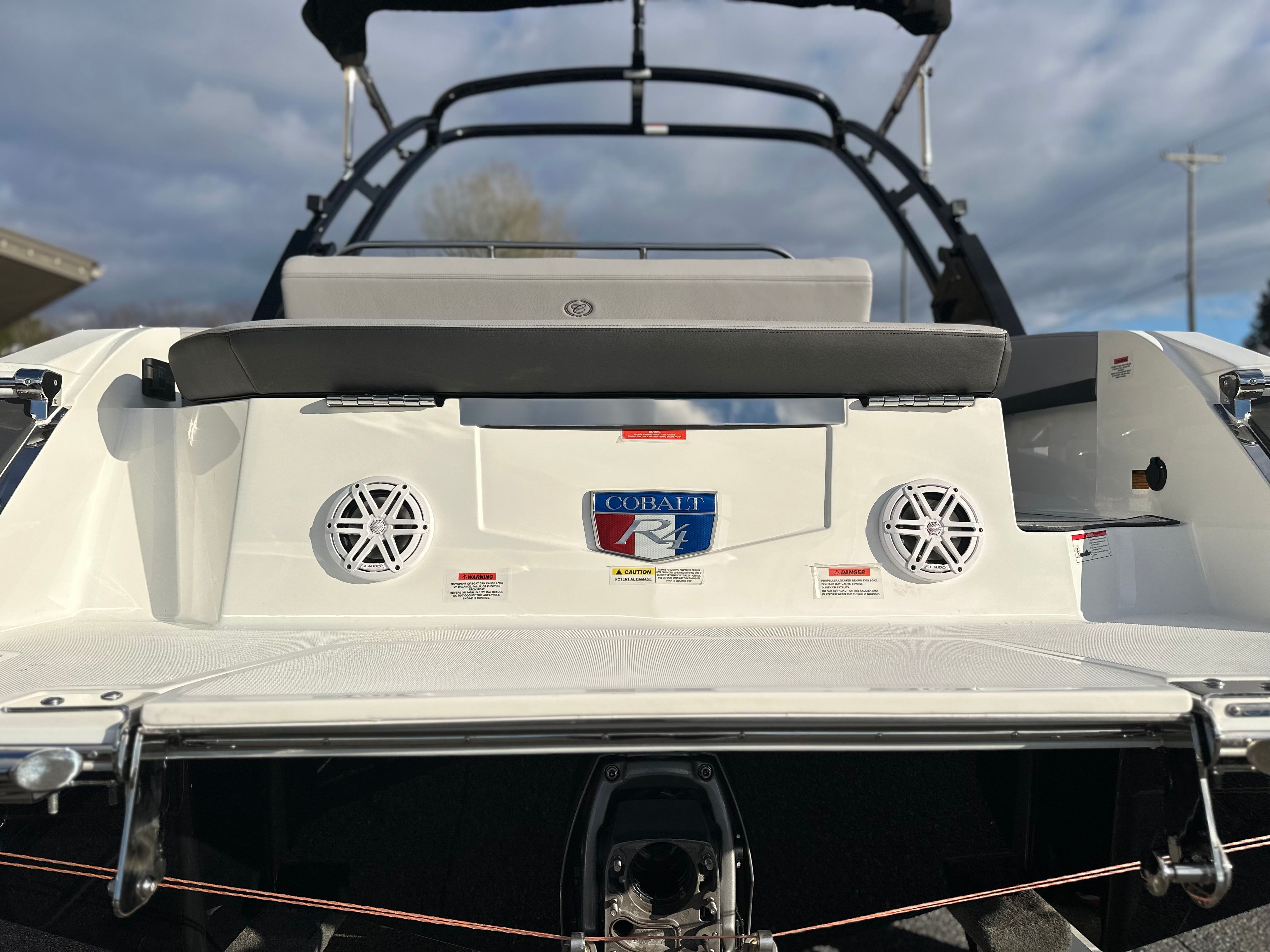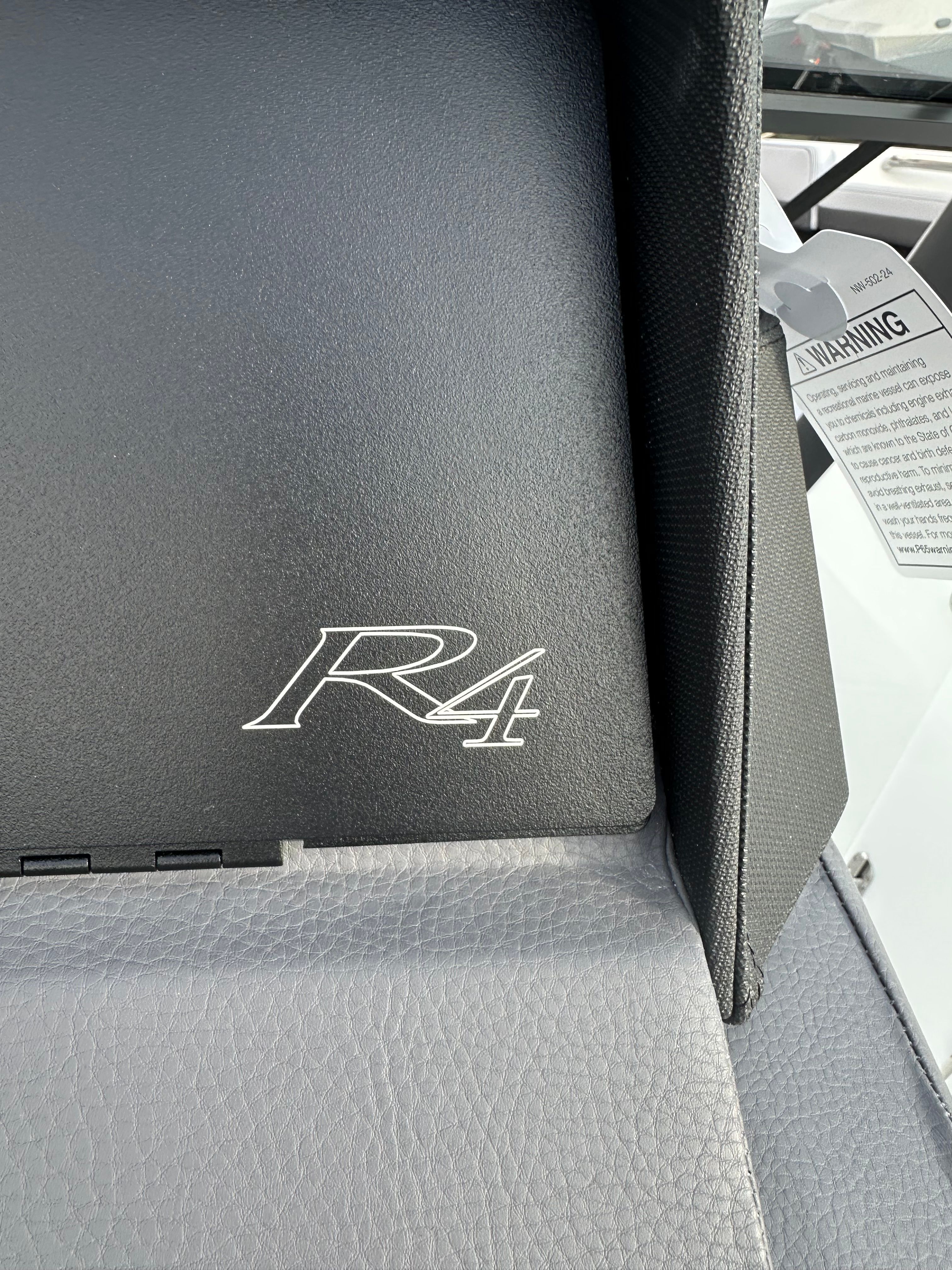 The Cobalt R4 is loaded with special features that enhance both its functionality and its appeal. The aft facing rumble seat offers a unique vantage point for relaxing and socializing, while the black arch, E2 (folding) with ebony bimini provides stylish shade and protection from the sun. The battery maintainer/charger (110V) ensures your boat is always ready for action, and the Cobalt letters in white satin add a touch of elegance to the exterior.For added convenience and safety, the R4 is equipped with stainless steel docking lights and four fender clips with lines, making docking and securing your boat a breeze. The flagpole with flag adds a classic nautical touch, while the floor covering in seagrass, silver ash, creates a comfortable and inviting environment underfoot. The interior, finished in frost and slate, offers a sophisticated and modern aesthetic that is both durable and easy to maintain.
