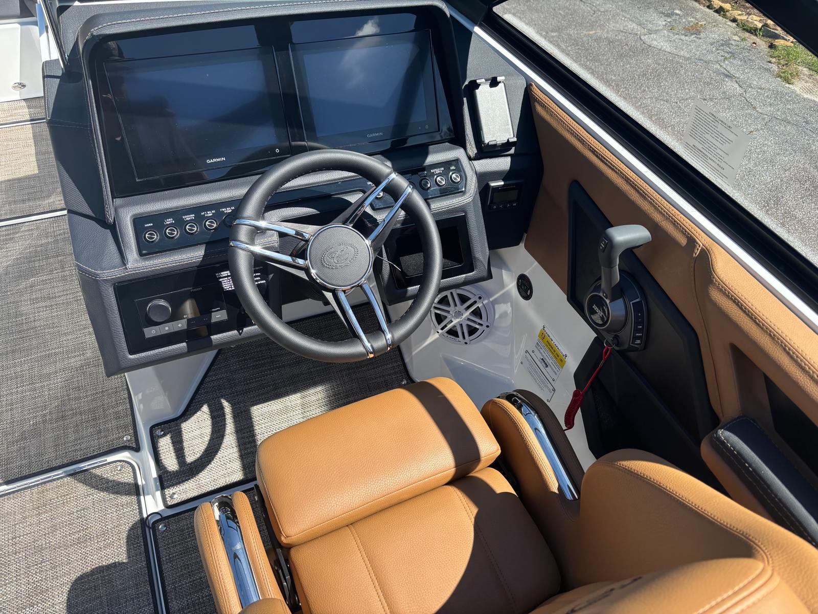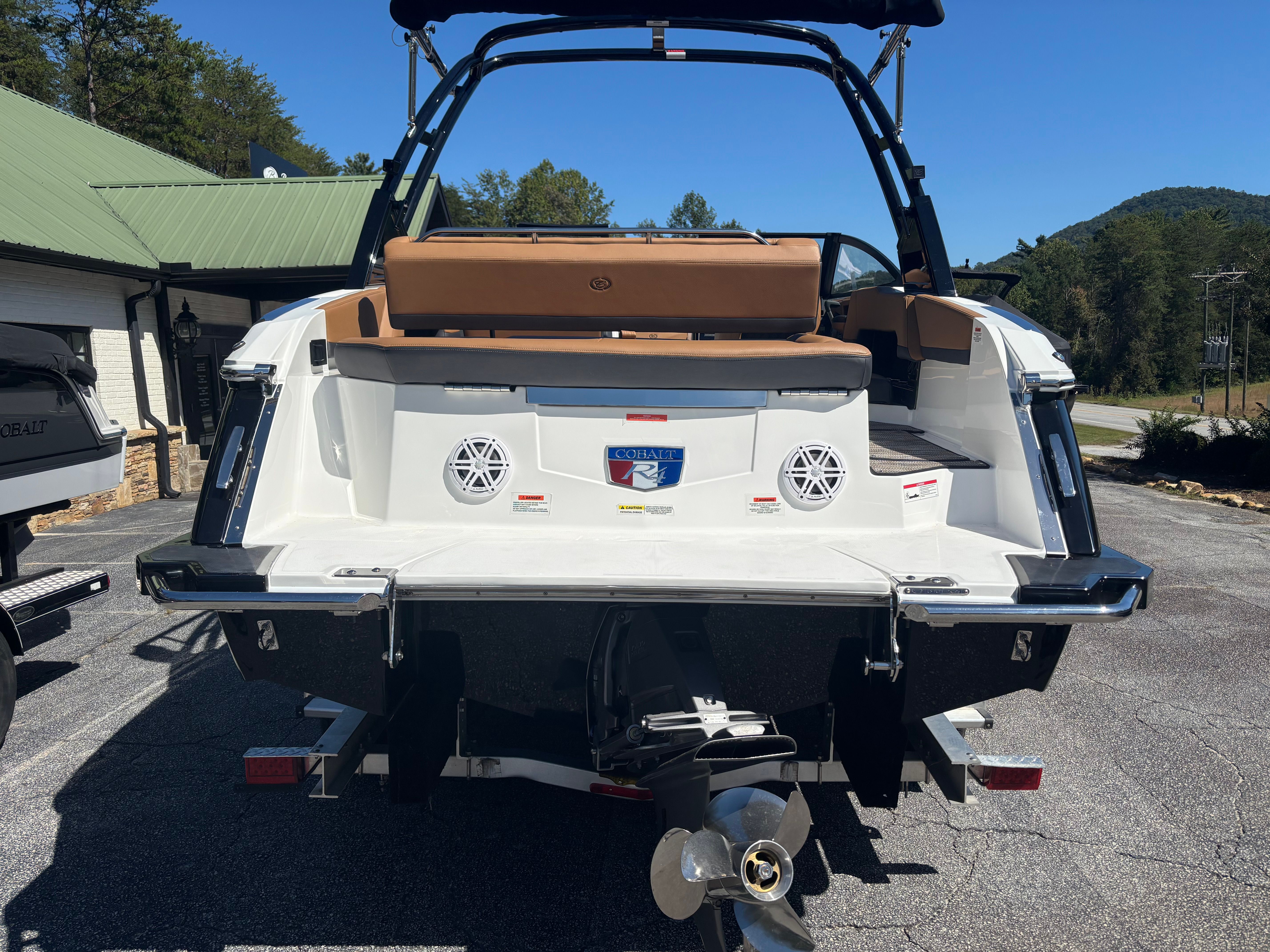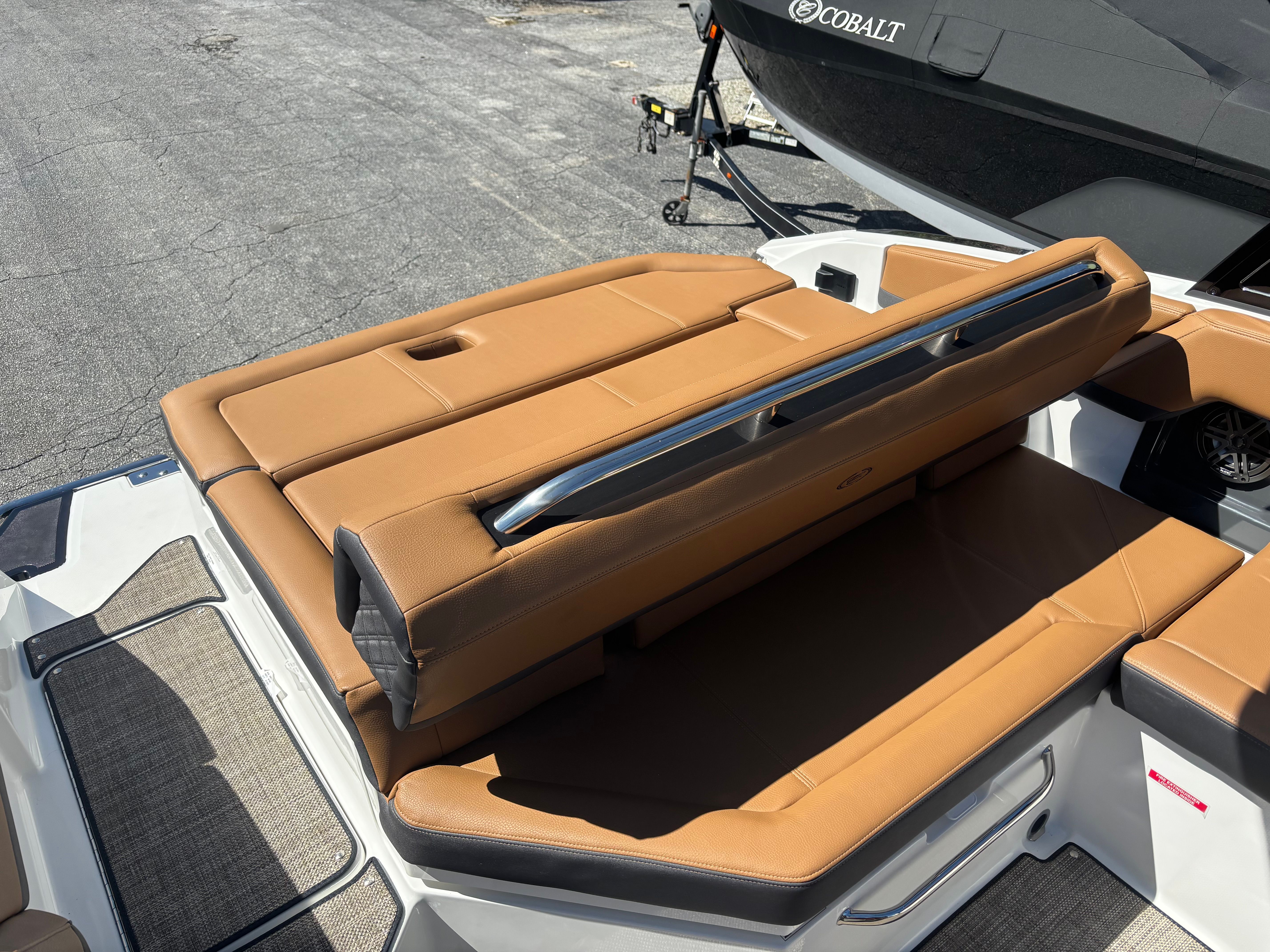 The Cobalt R4 is loaded with premium features that enhance both functionality and enjoyment on the water. Stainless steel docking lights offer superior visibility and safety during low-light conditions, making docking and nighttime navigation a breeze. The automatic fire extinguisher system provides peace of mind, ensuring safety is always a top priority.A standout feature is the Arch, E2, Black (Folding) with Bimini—Ebony, which combines sleek aesthetics with practical sun protection. The folding design allows for easy storage and adaptability, while the Bimini top offers shade on sunny days. The black leather and stainless steel steering wheel adds a touch of sophistication to the helm, complementing the boat’s modern interior.The floor covering, crafted from Seagrass in a Raw Umber finish, delivers both comfort and durability, creating a welcoming environment for barefoot relaxation. The mooring cover protects your investment from the elements, while the folding arch adds versatility for storage and transport. LED interior accent lighting in red, green, and blue creates a customizable ambiance, perfect for evening cruises or entertaining guests.