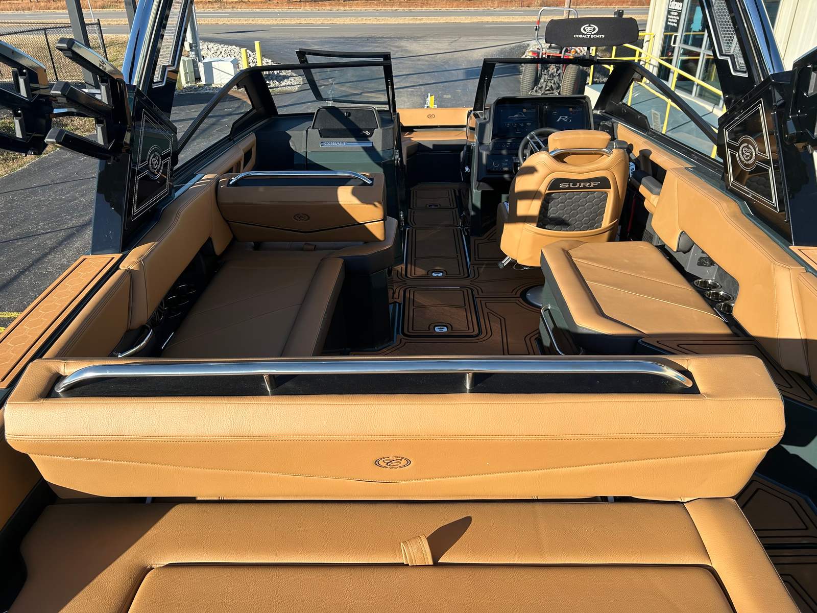 The 2026 Cobalt R6 Surf is a new addition to the Cobalt lineup, measuring an impressive 25.75 feet in length. This spacious bowrider offers ample room for family and friends, ensuring every outing is comfortable and enjoyable. With its sleek lines and modern design, the R6 Surf is as visually striking as it is functional. The boat’s Deep Teal accents and Rich Ebony stripe create a sophisticated look that turns heads at every marina, while the Caramel, Carbon, and Ebony interior provides a luxurious atmosphere for passengers.