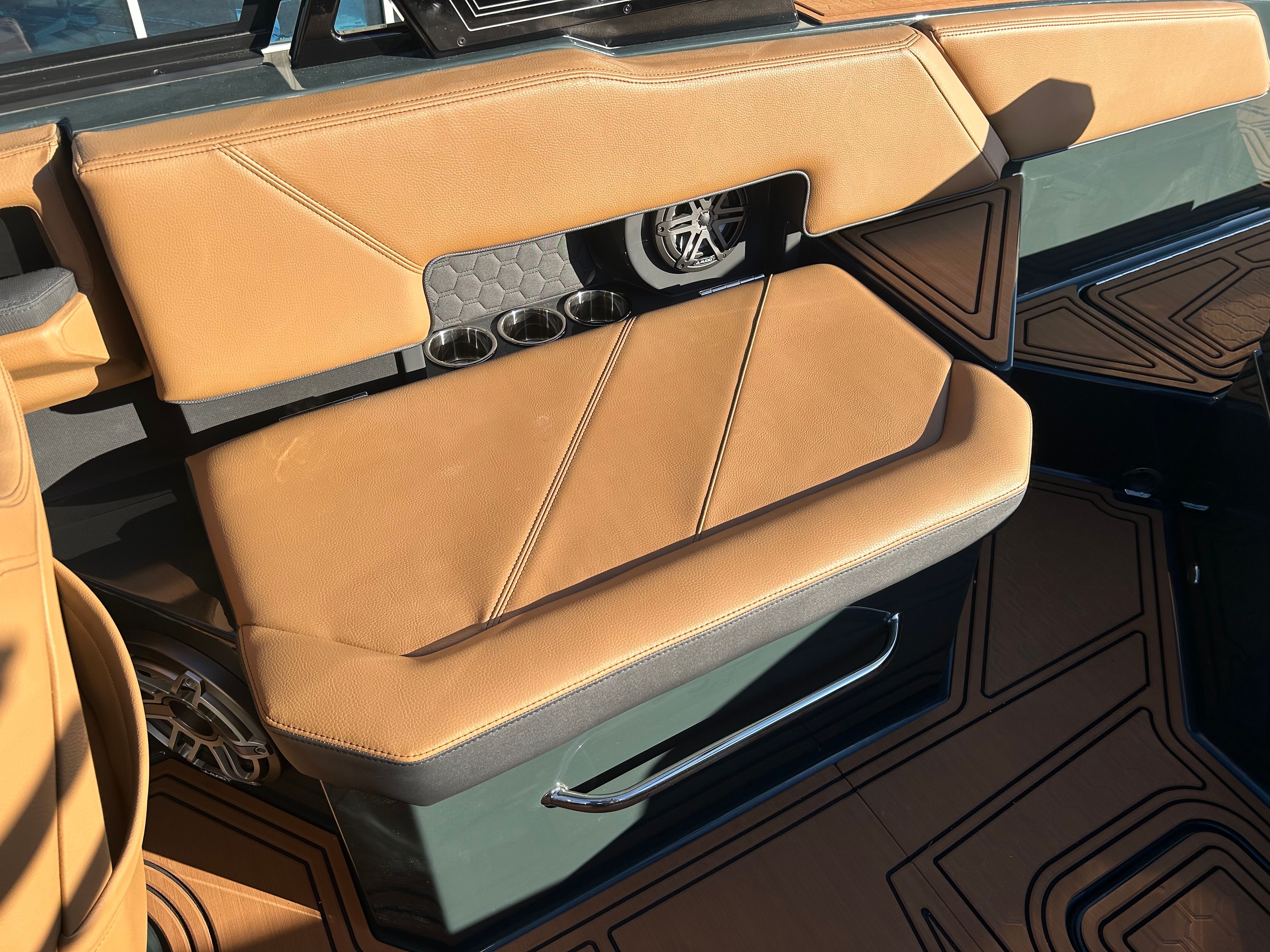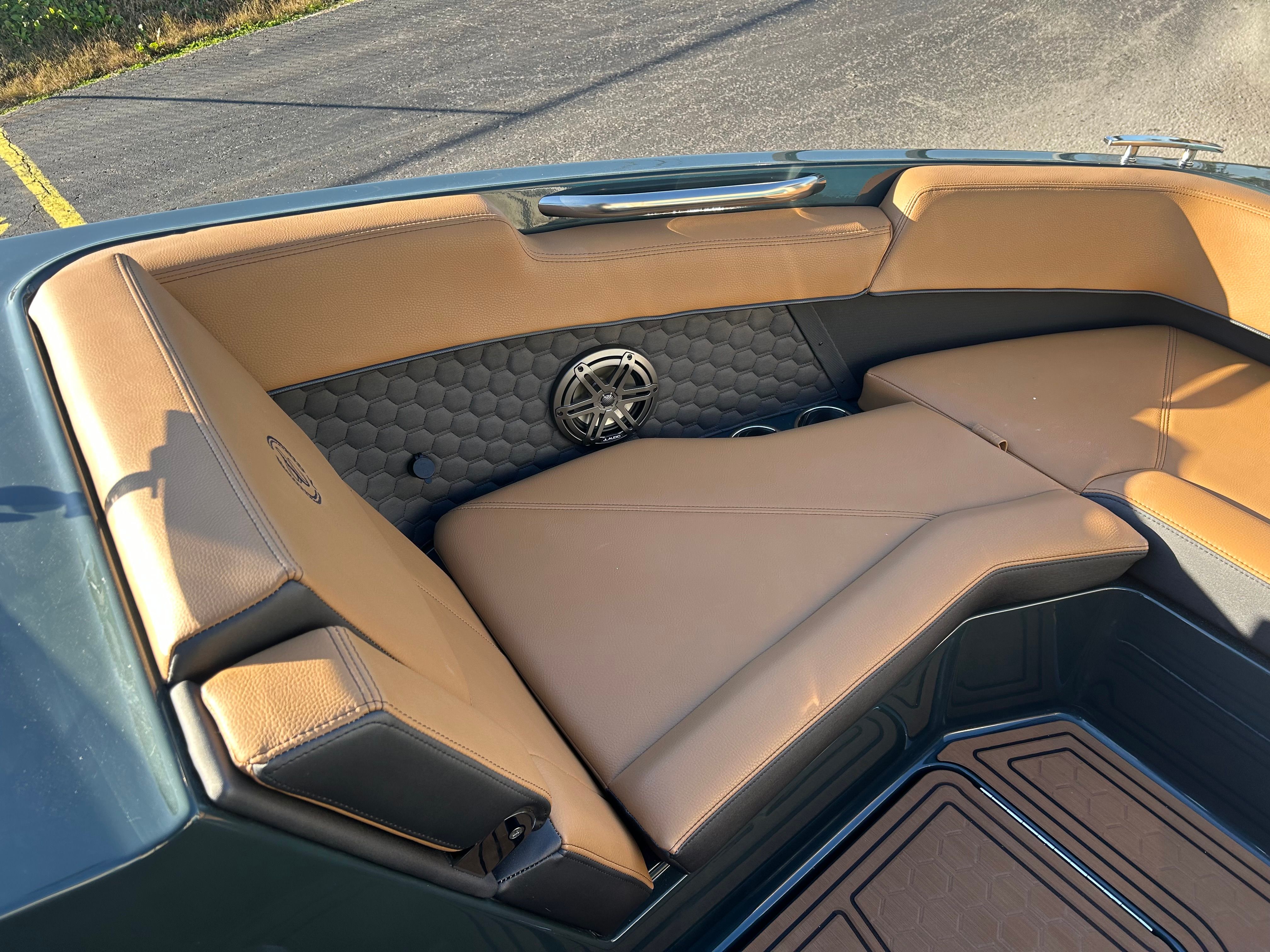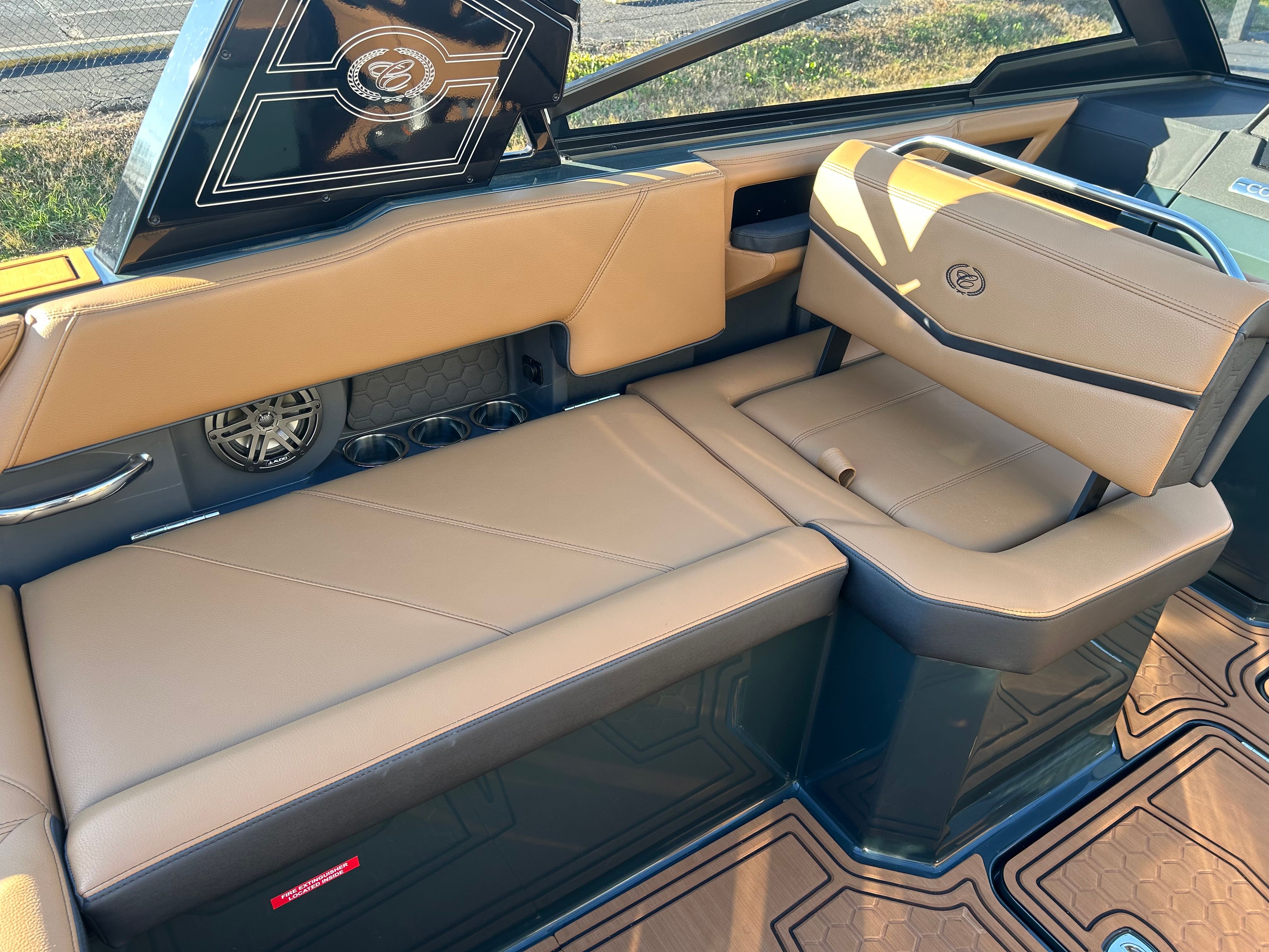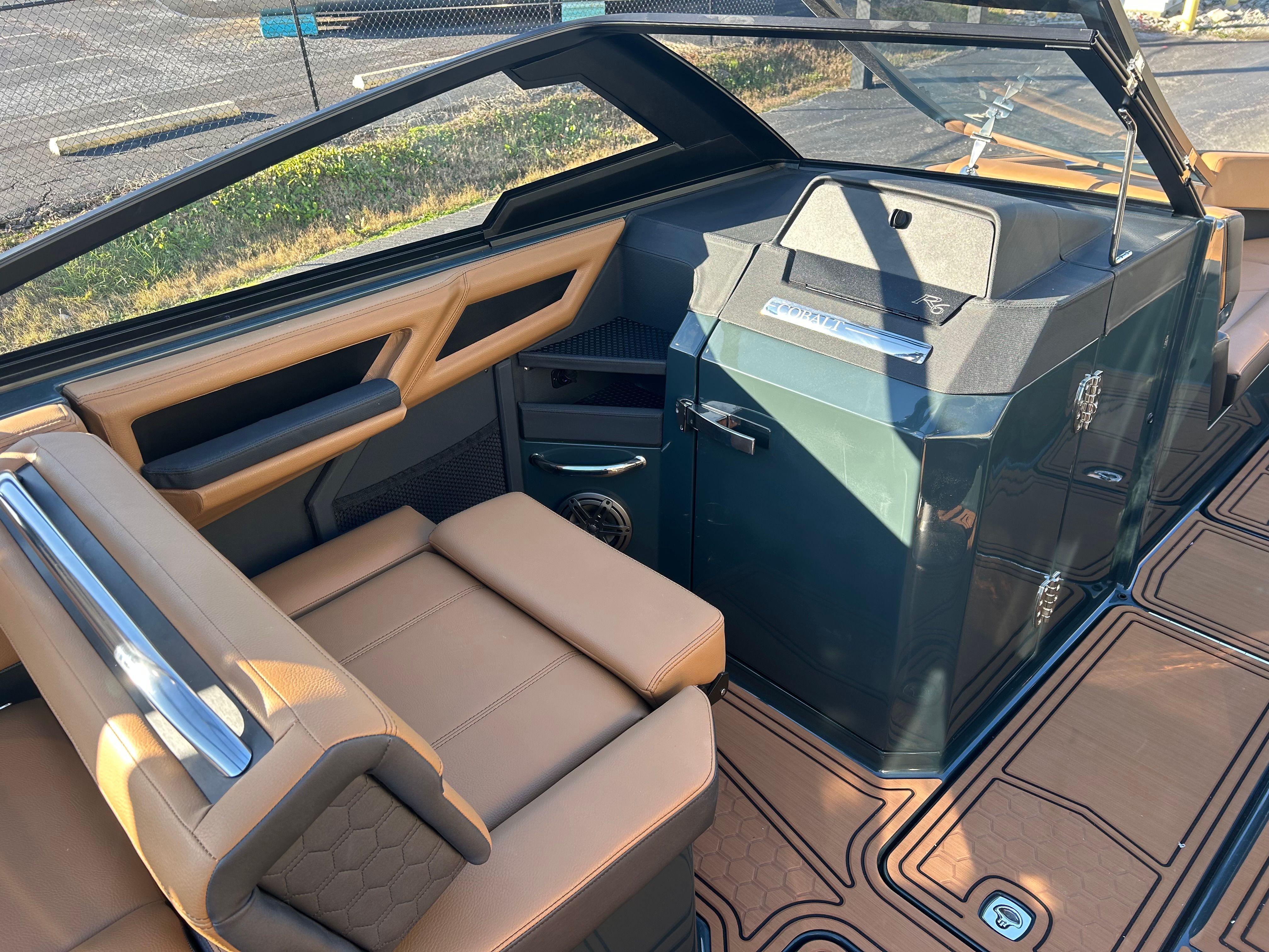 The Cobalt R6 Surf is packed with premium features designed to enhance your boating experience. The Upper Surf Accent and Surf Mid Hull Side in Deep Teal, paired with the Accent Stripe in Rich Ebony and Hull Bottom in Deep Teal, create a striking visual statement. The interior, finished in Caramel, Carbon, and Ebony, offers both comfort and style, making every journey a pleasure.Special features include a Battery Maintainer/Charger, ensuring your boat is always ready for adventure, and Cobalt Letters in Black Satin for a touch of elegance. Stainless Steel Docking Lights provide enhanced visibility during evening outings, while the Electric Arch Prisma Black with Bimini in Ebony offers shade and protection from the sun. These thoughtful additions set the R6 Surf apart from other bowrider boats for sale, making it a standout choice for discerning buyers.