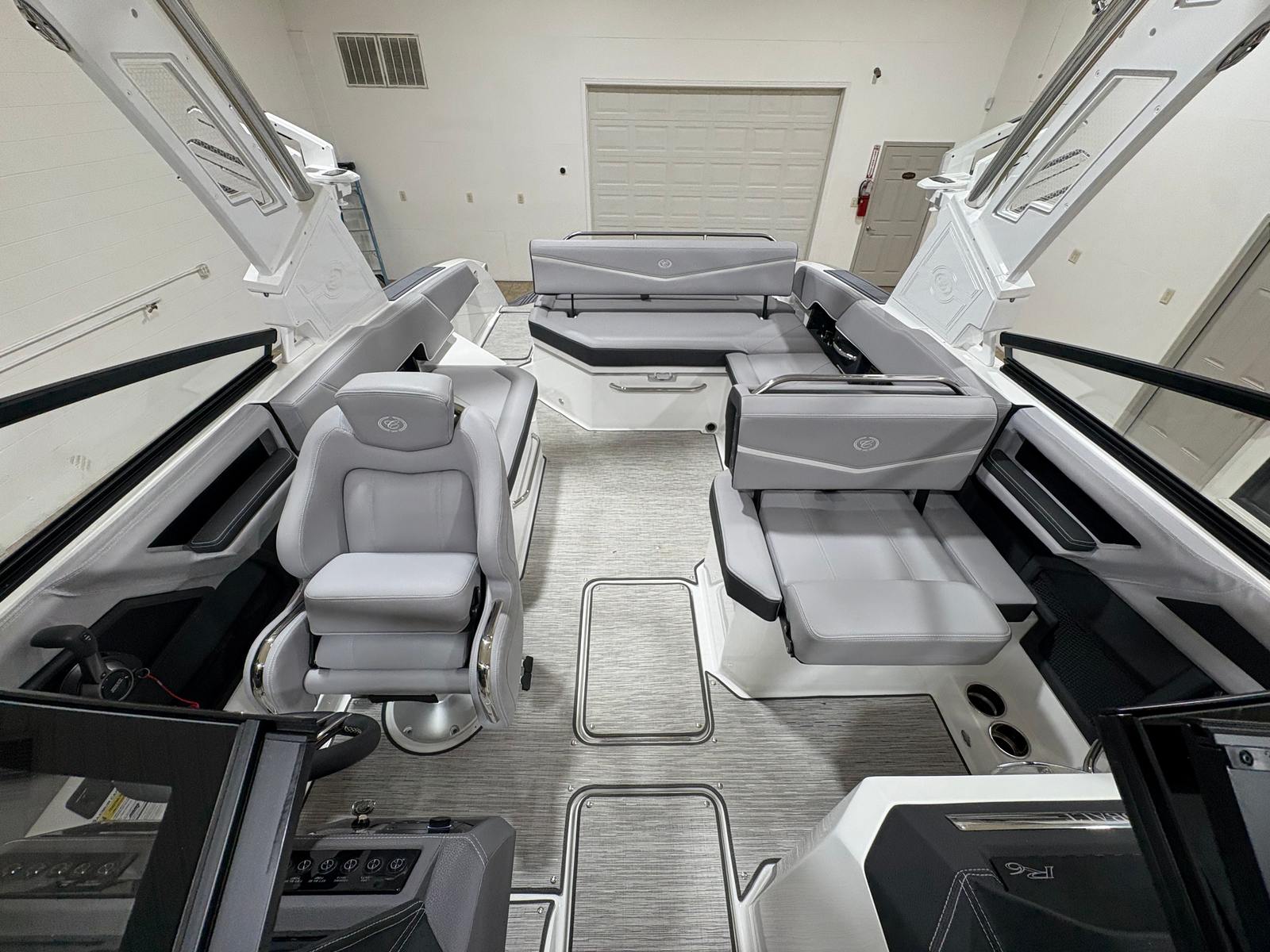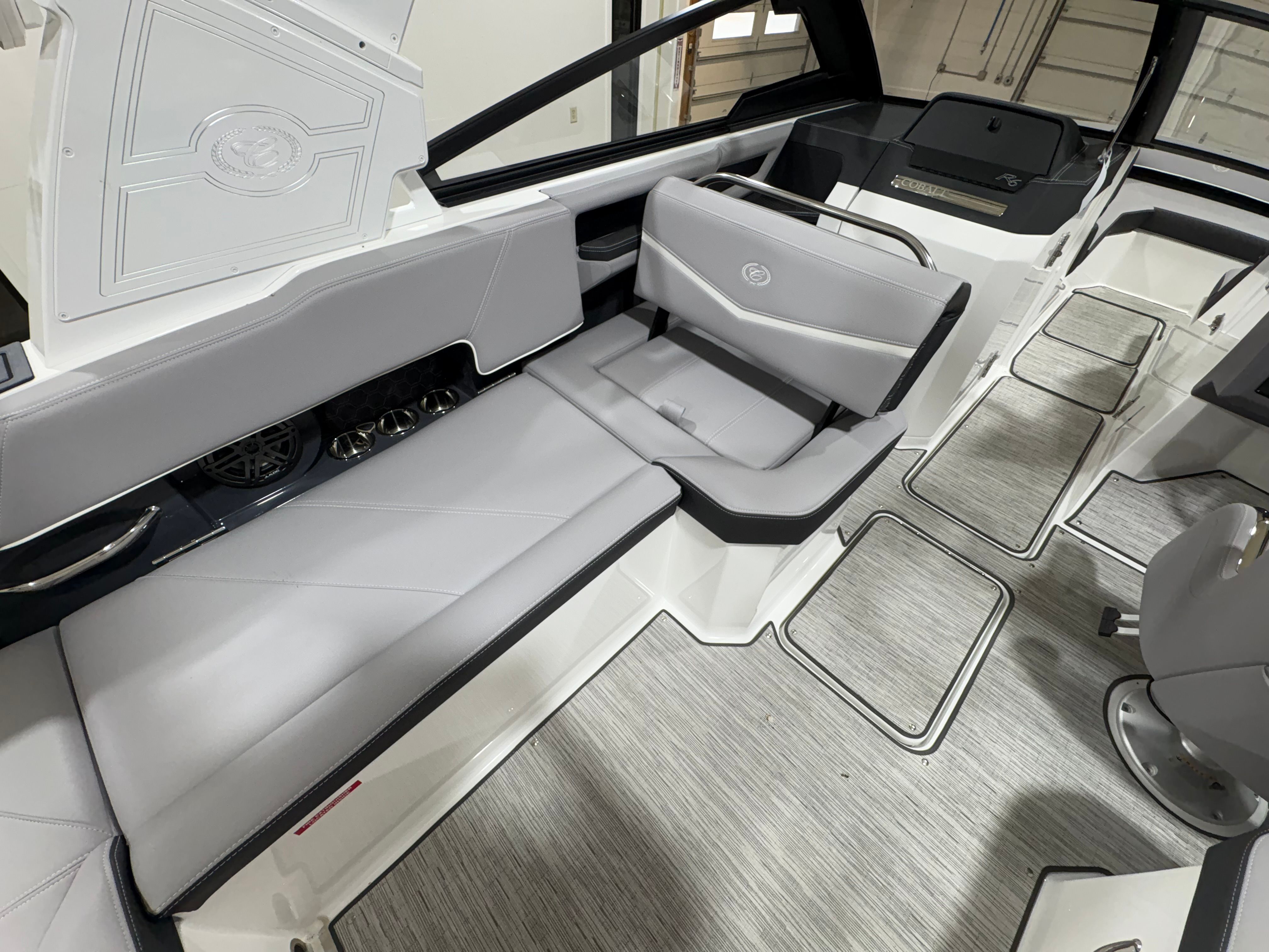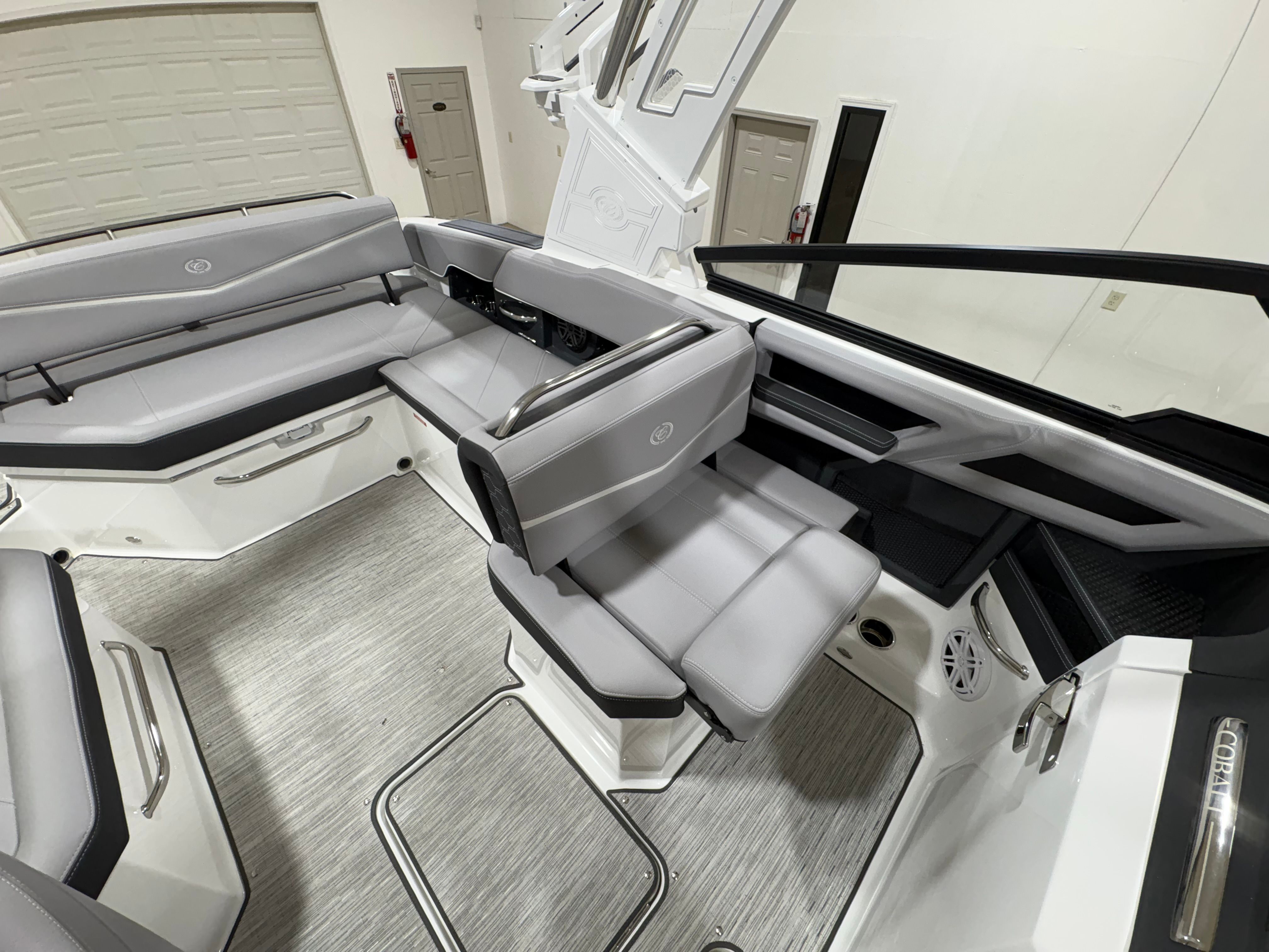 The Cobalt R6 Surf is loaded with premium features designed to enhance your time on the water. The stainless steel docking lights provide both functionality and a touch of elegance, ensuring safe and stylish arrivals at any dock. The white (folding) electric arch, paired with the Prisma with navy bimini, offers shade and protection from the elements while maintaining a sleek profile. The floor covering in Seagrass, Silver Ash, adds a layer of comfort and sophistication underfoot, while the interior in Frost and Slate creates a modern and inviting atmosphere.The glass cockpit, featuring dual Volvo 8610 displays, puts advanced navigation and control at your fingertips, allowing you to monitor performance and navigate with confidence. LED interior accent lighting with R/G/B options sets the perfect mood for evening cruises or dockside gatherings. The mooring cover with Prisma folding arch ensures your investment is protected when not in use. For those who appreciate high-quality audio, the premium sound system with transom speakers and remote delivers crystal-clear sound, making every outing a memorable one.
