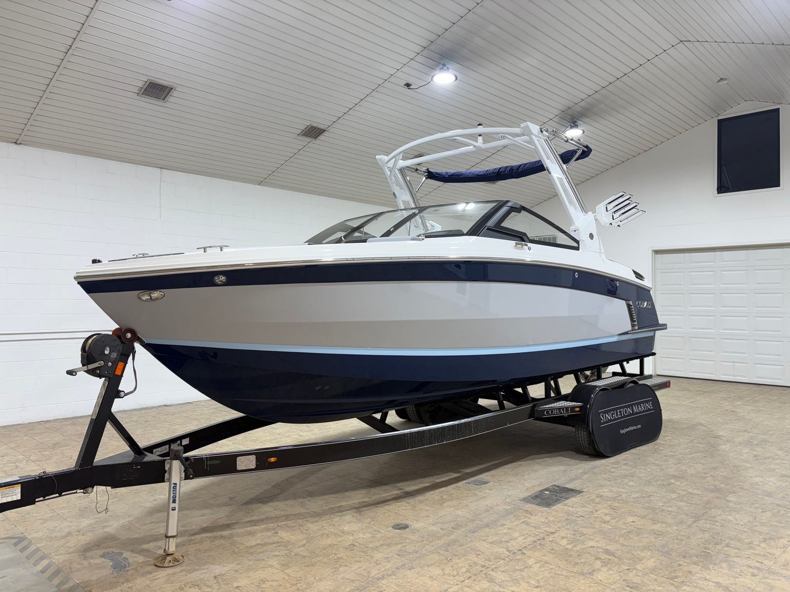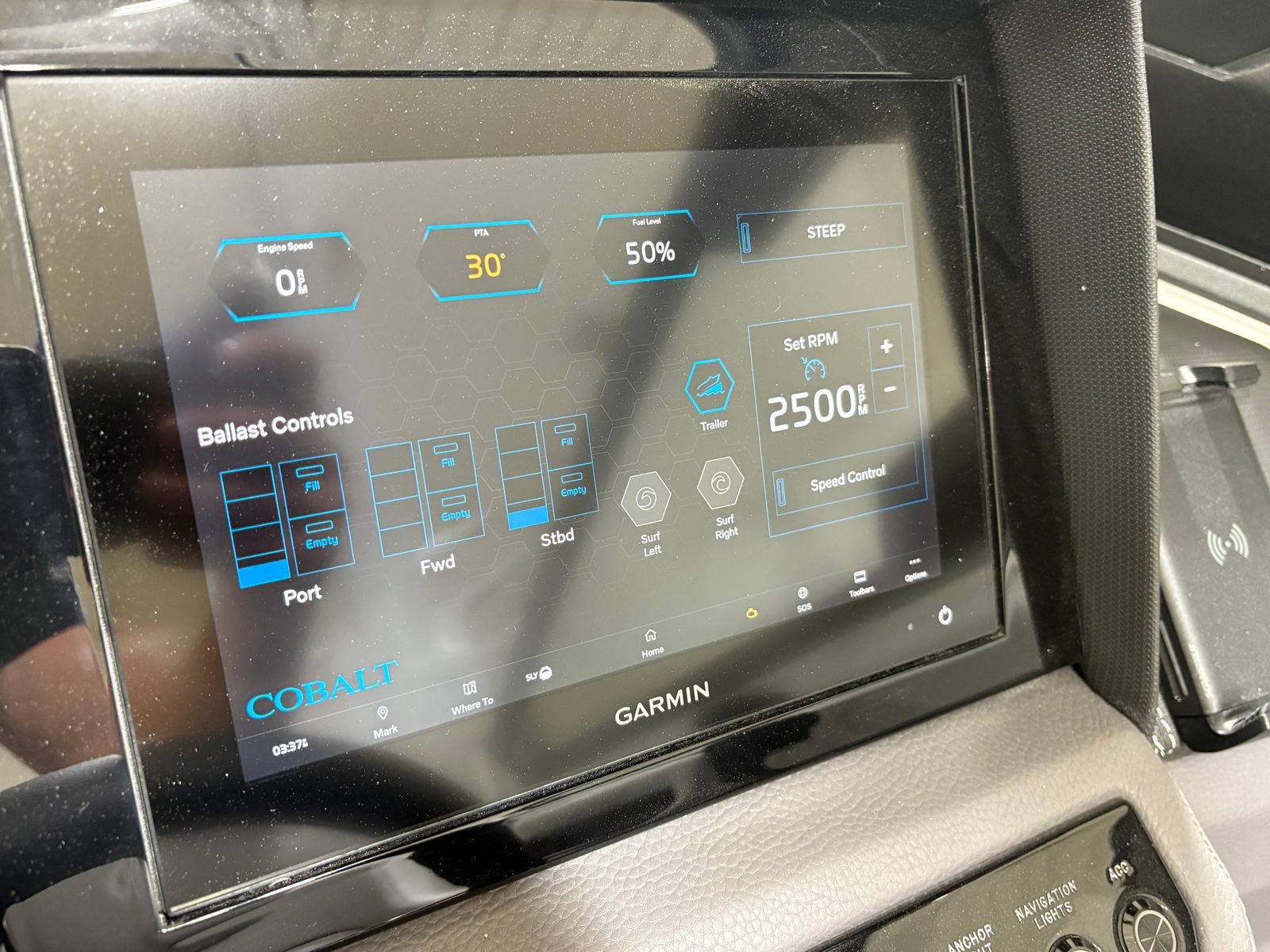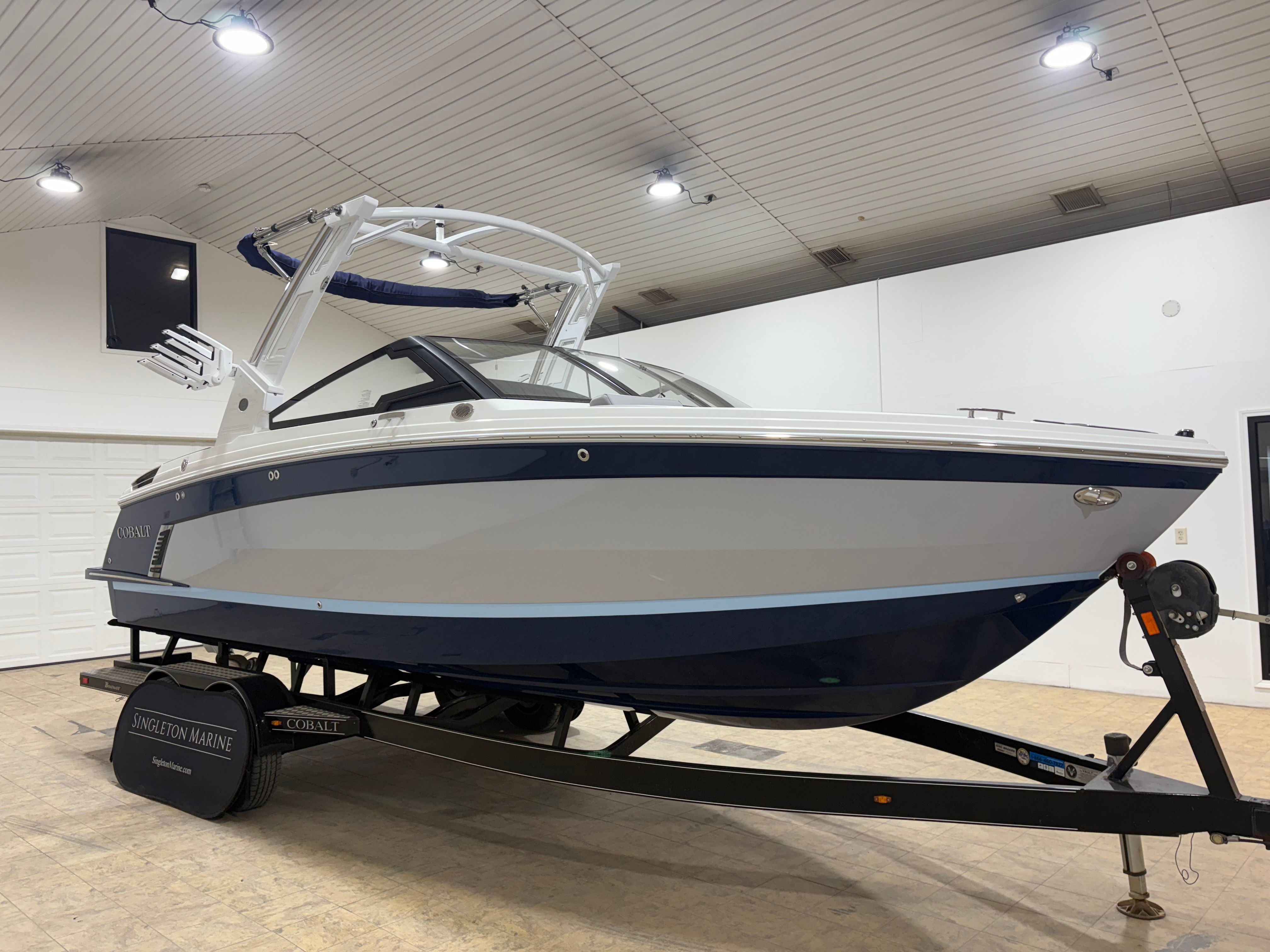 The Cobalt R6 Surf is loaded with premium features designed to enhance your time on the water. The stainless steel docking lights provide both functionality and a touch of elegance, ensuring safe and stylish arrivals at any dock. The white (folding) electric arch, paired with the Prisma with navy bimini, offers shade and protection from the elements while maintaining a sleek profile. The floor covering in Seagrass, Silver Ash, adds a layer of comfort and sophistication underfoot, while the interior in Frost and Slate creates a modern and inviting atmosphere.The glass cockpit, featuring dual Volvo 8610 displays, puts advanced navigation and control at your fingertips, allowing you to monitor performance and navigate with confidence. LED interior accent lighting with R/G/B options sets the perfect mood for evening cruises or dockside gatherings. The mooring cover with Prisma folding arch ensures your investment is protected when not in use. For those who appreciate high-quality audio, the premium sound system with transom speakers and remote delivers crystal-clear sound, making every outing a memorable one.