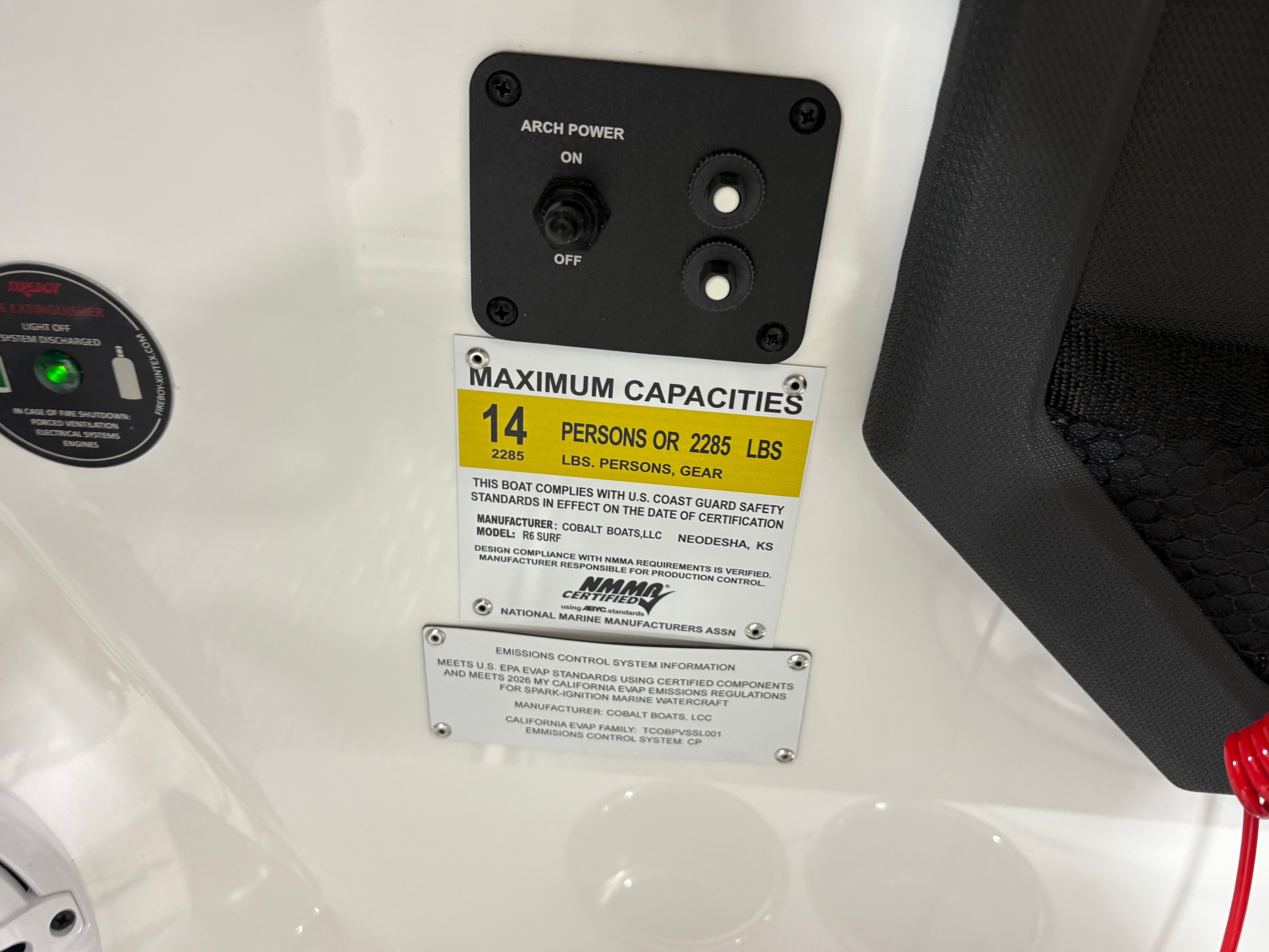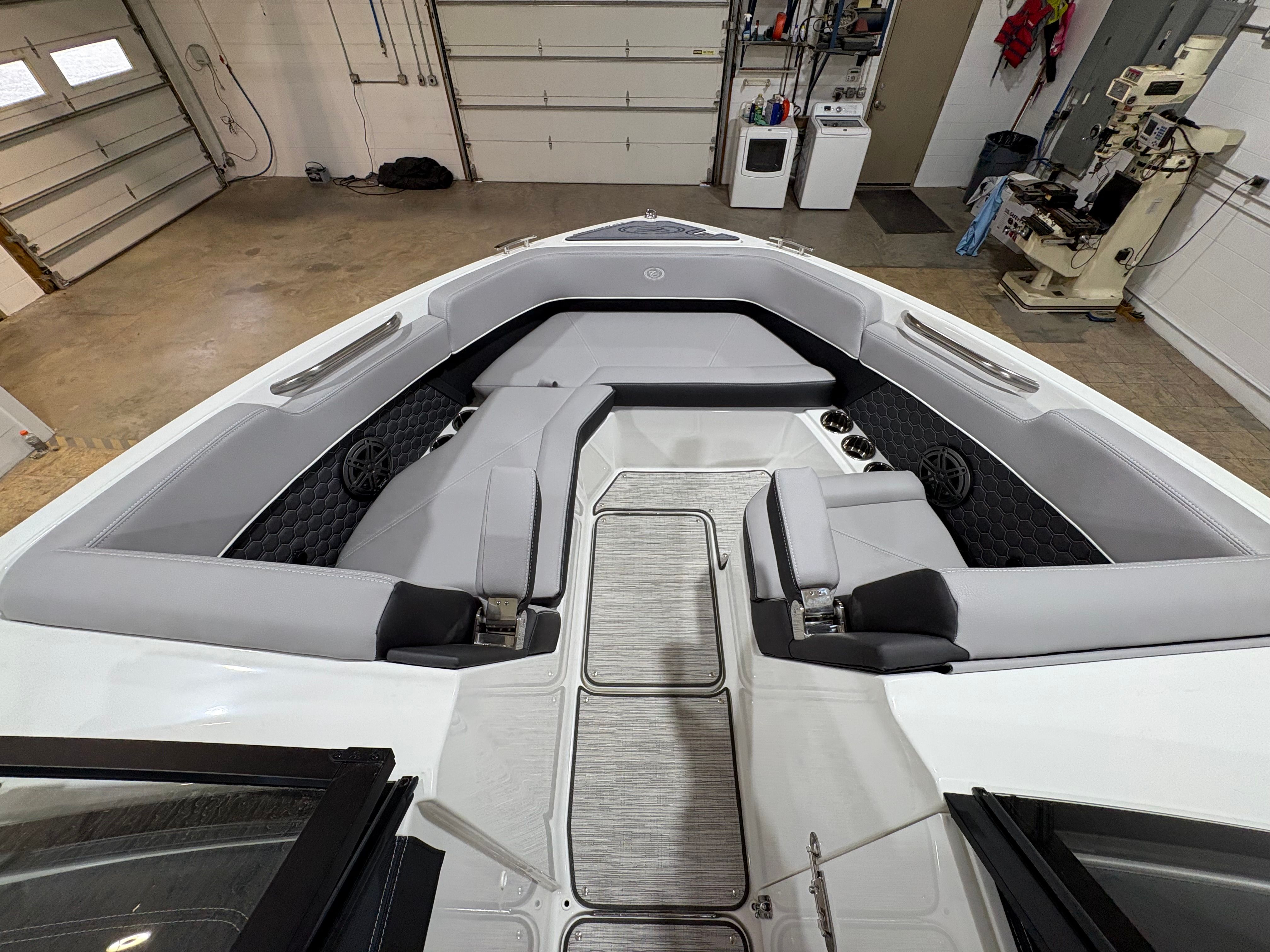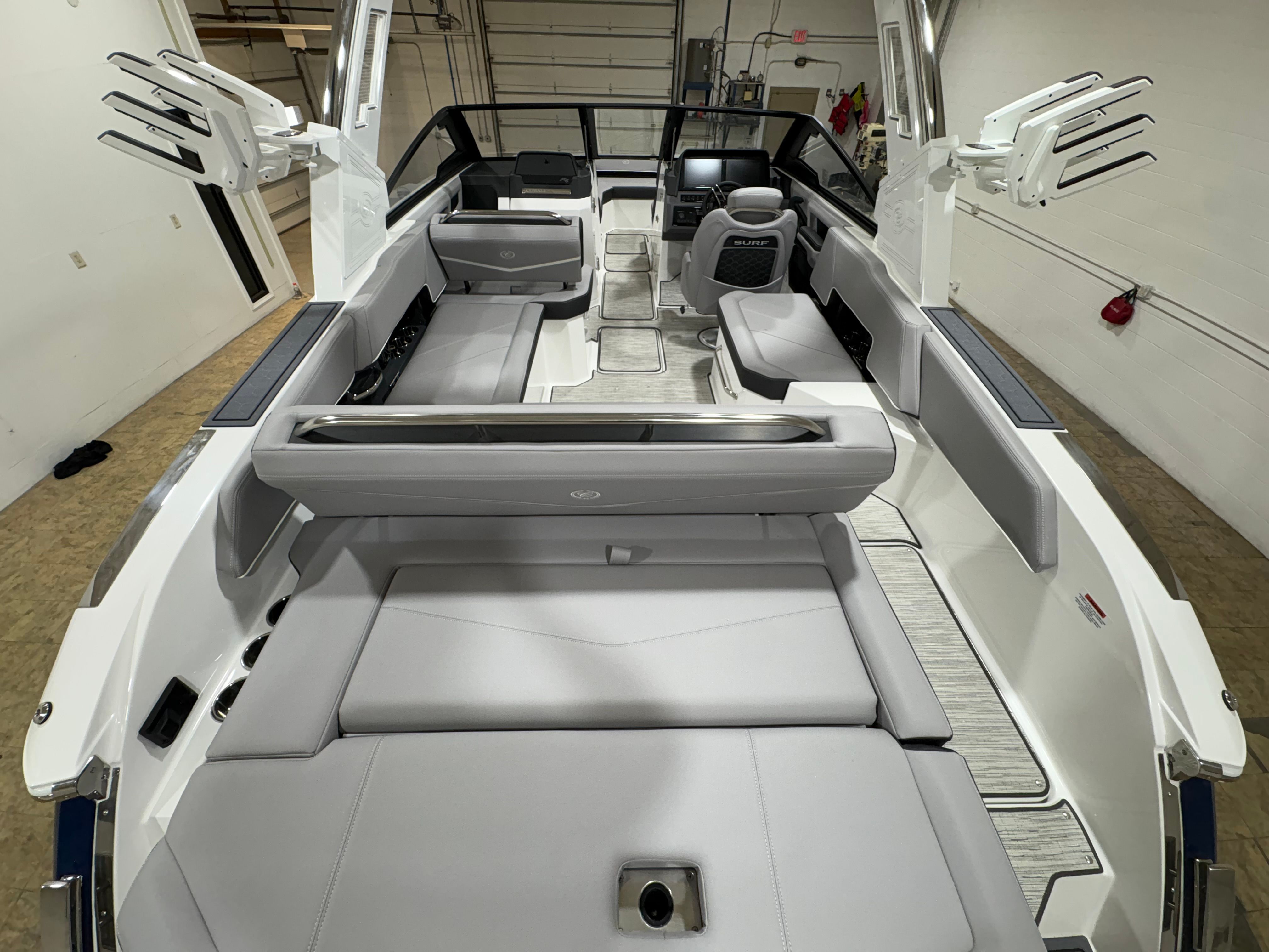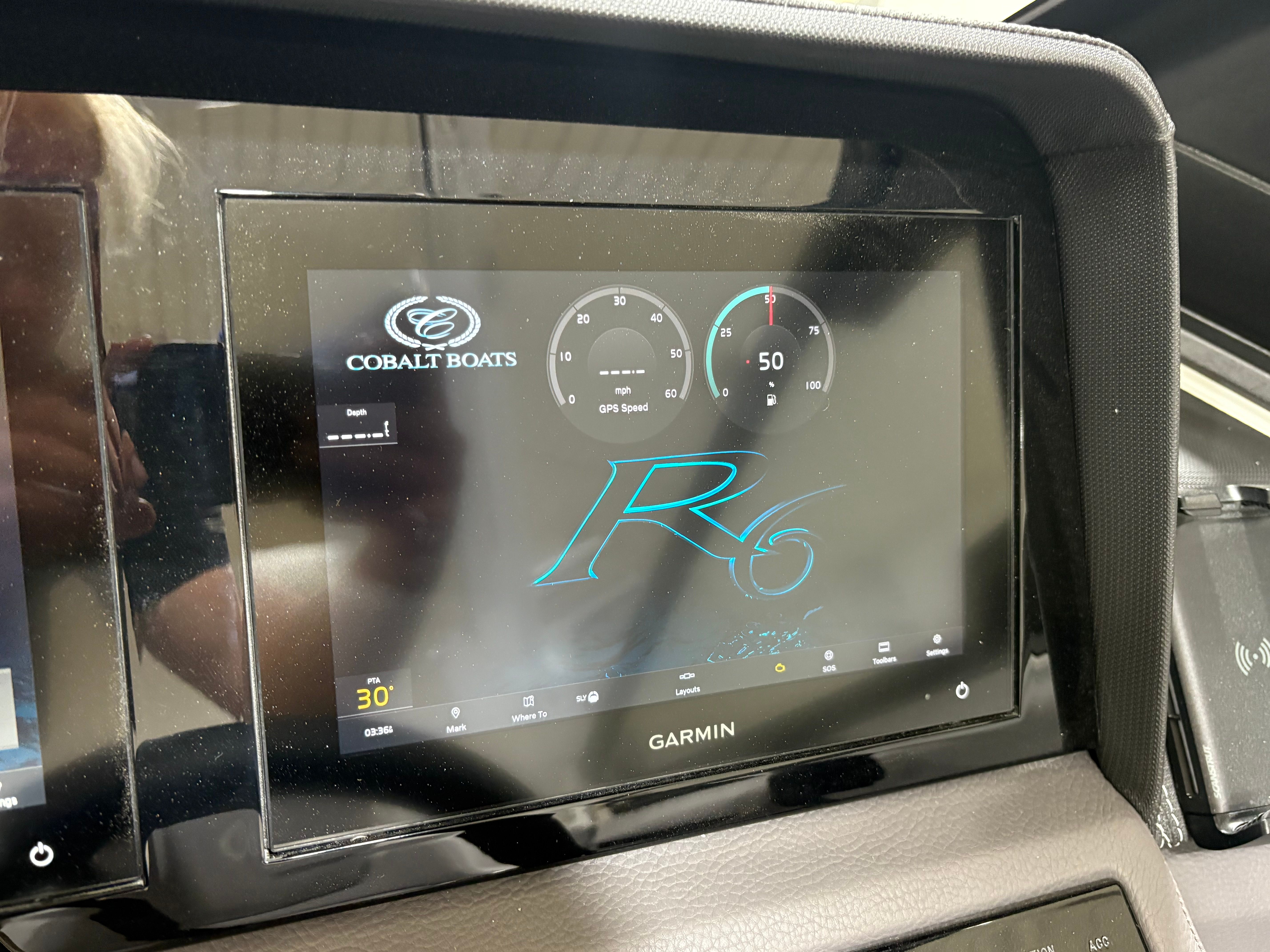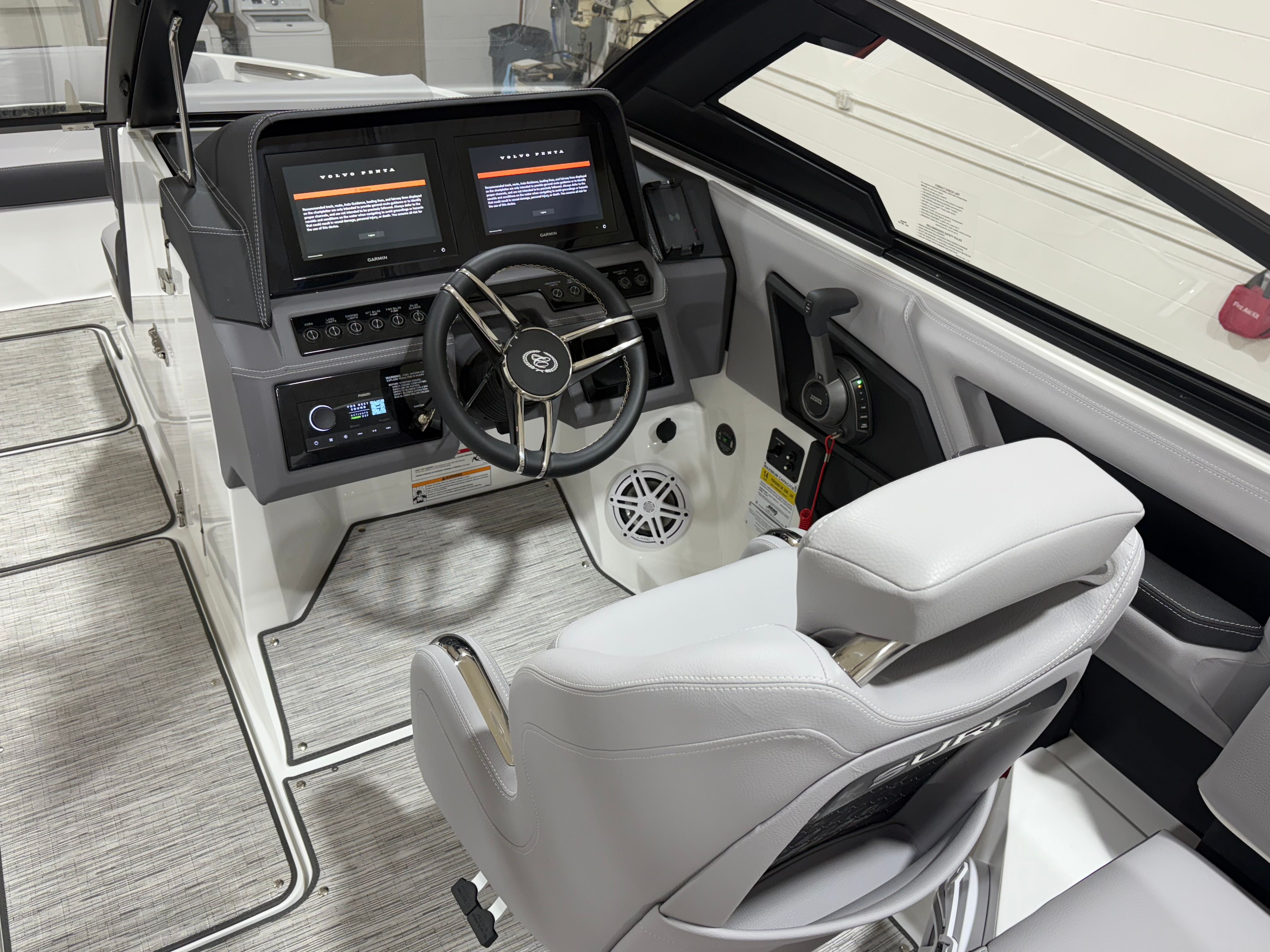 Practicality meets luxury in the Cobalt R6 Surf. The folding electric arch and mooring cover make storage and docking straightforward, protecting your boat and simplifying maintenance. The stainless steel docking lights enhance visibility during low-light conditions, making it easier to navigate marinas and docks safely. The Seagrass floor covering is not only stylish but also durable and easy to clean, ensuring your boat stays looking its best season after season.The dual Volvo 8610 displays in the glass cockpit provide comprehensive information at a glance, streamlining navigation and engine monitoring. The premium sound system, with transom speakers and remote, allows you to control your music from anywhere on the boat, adding convenience and enjoyment to every outing. These practical features make the R6 Surf a pleasure to own and operate, whether you are a seasoned captain or new to boating.