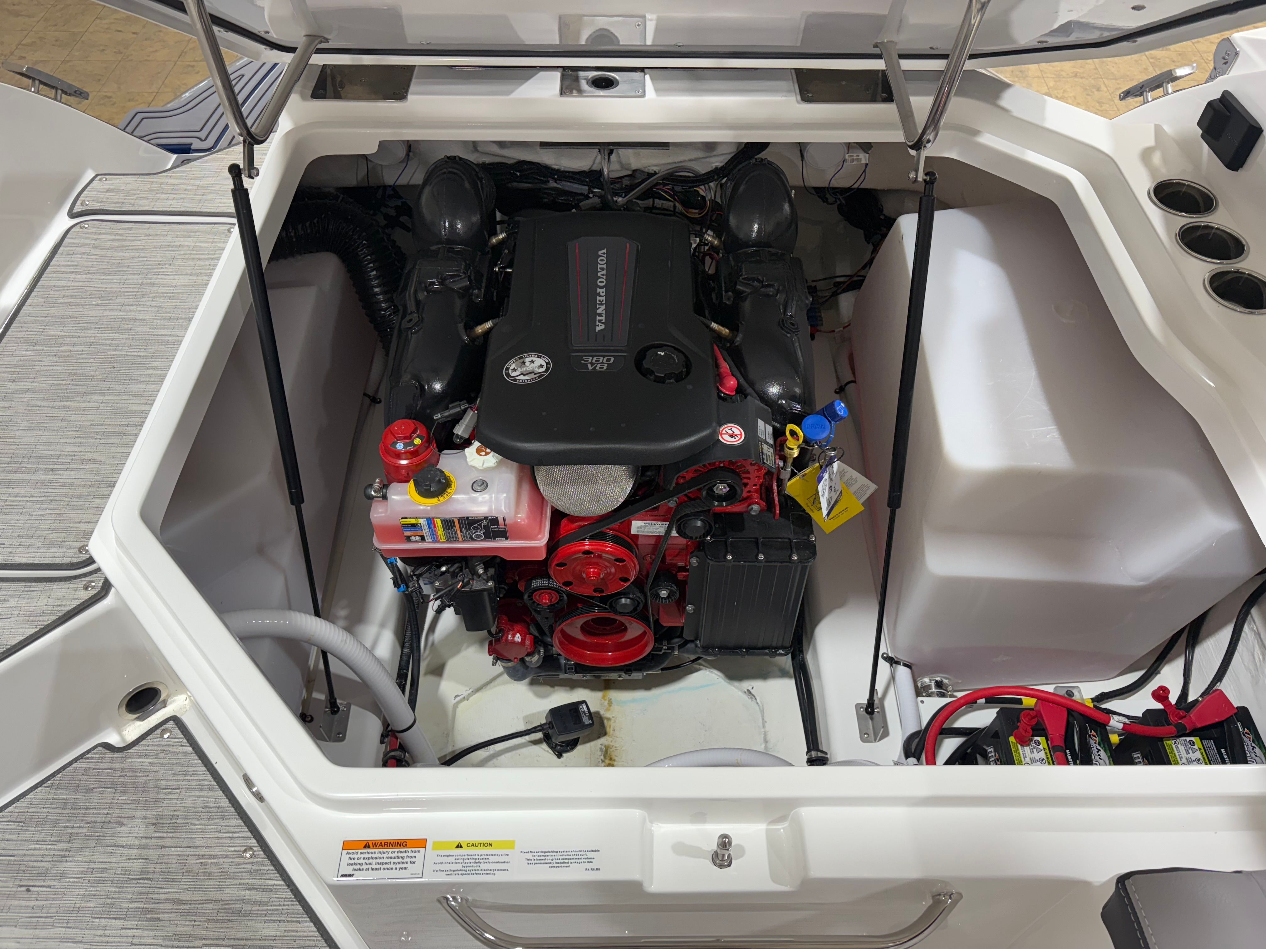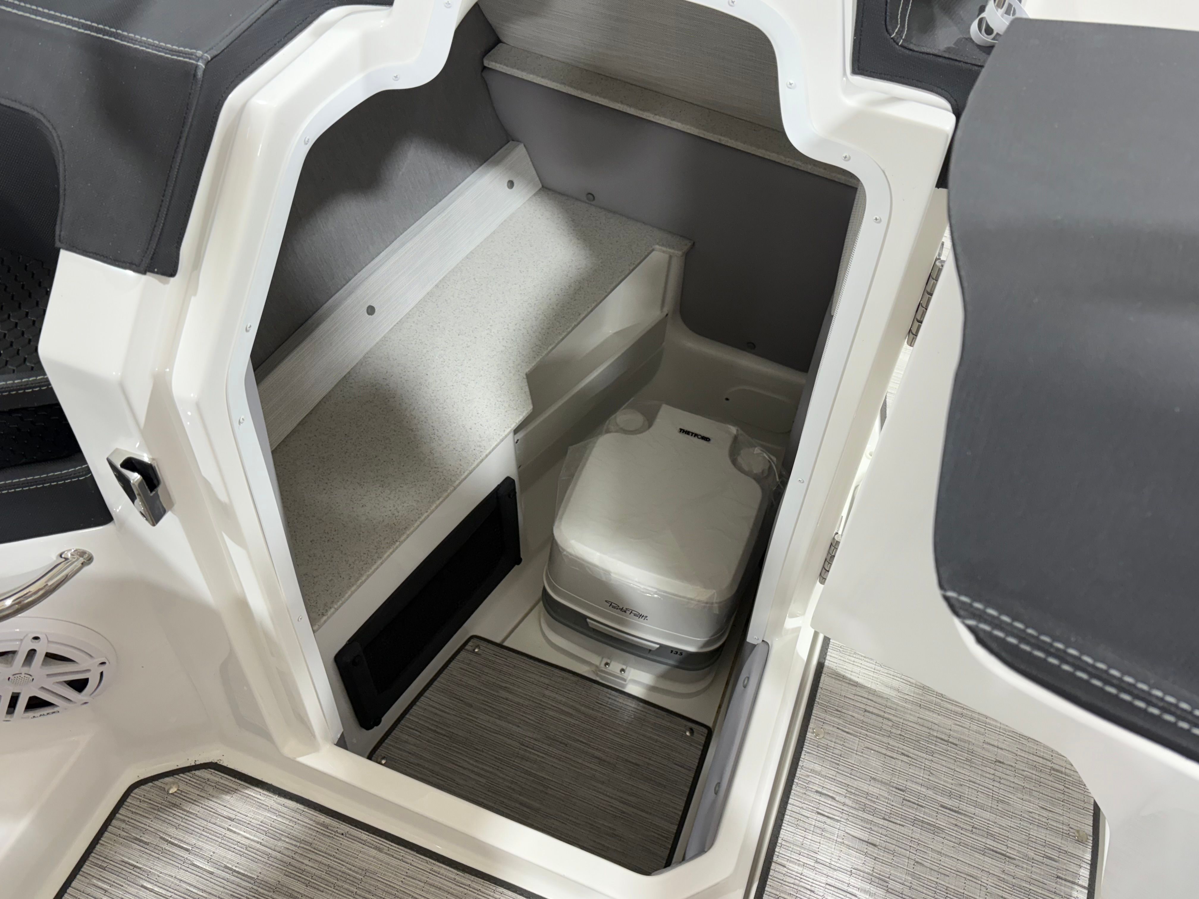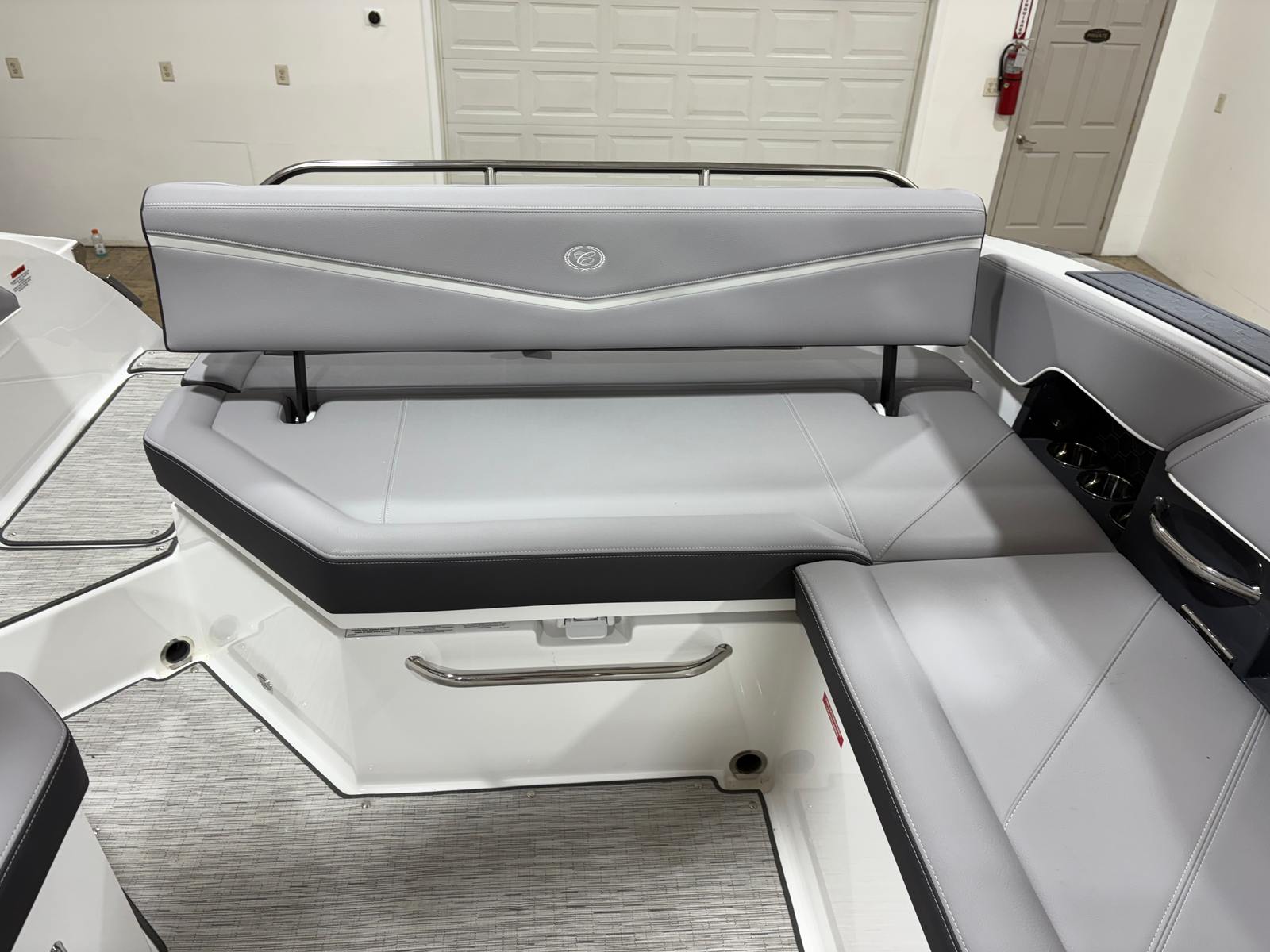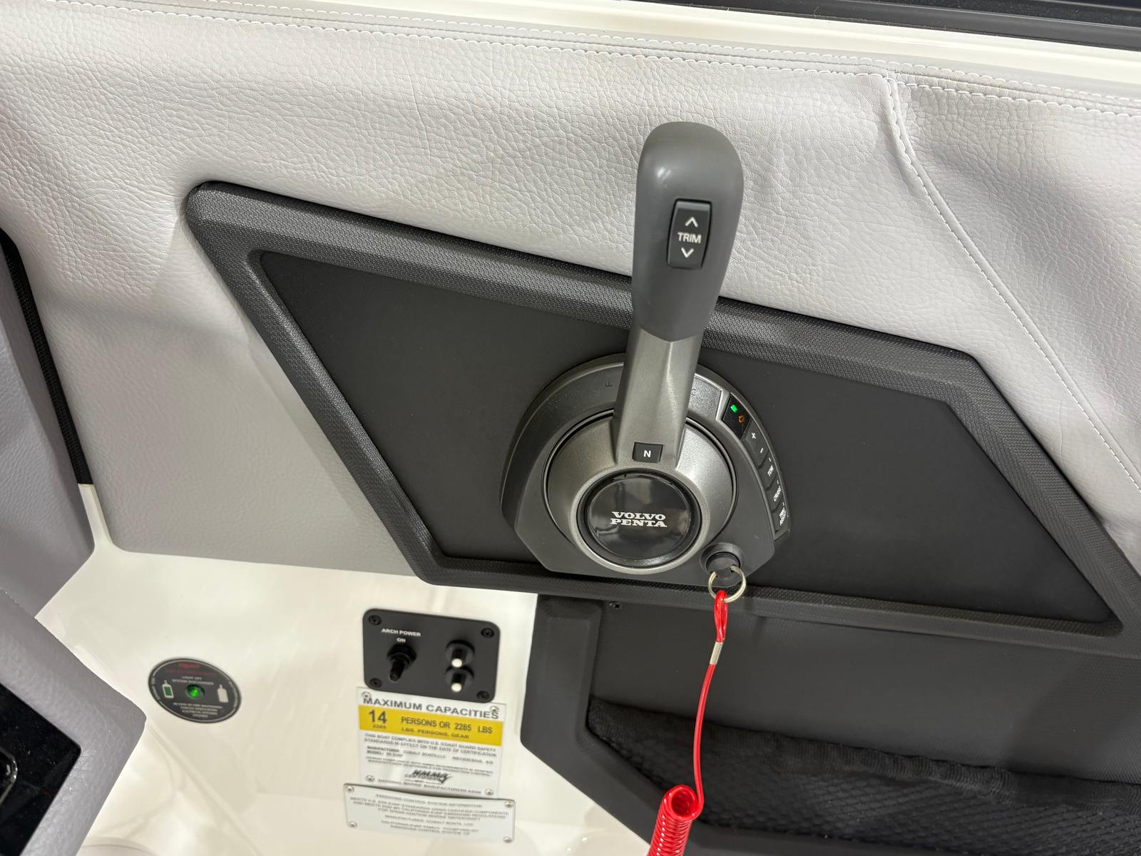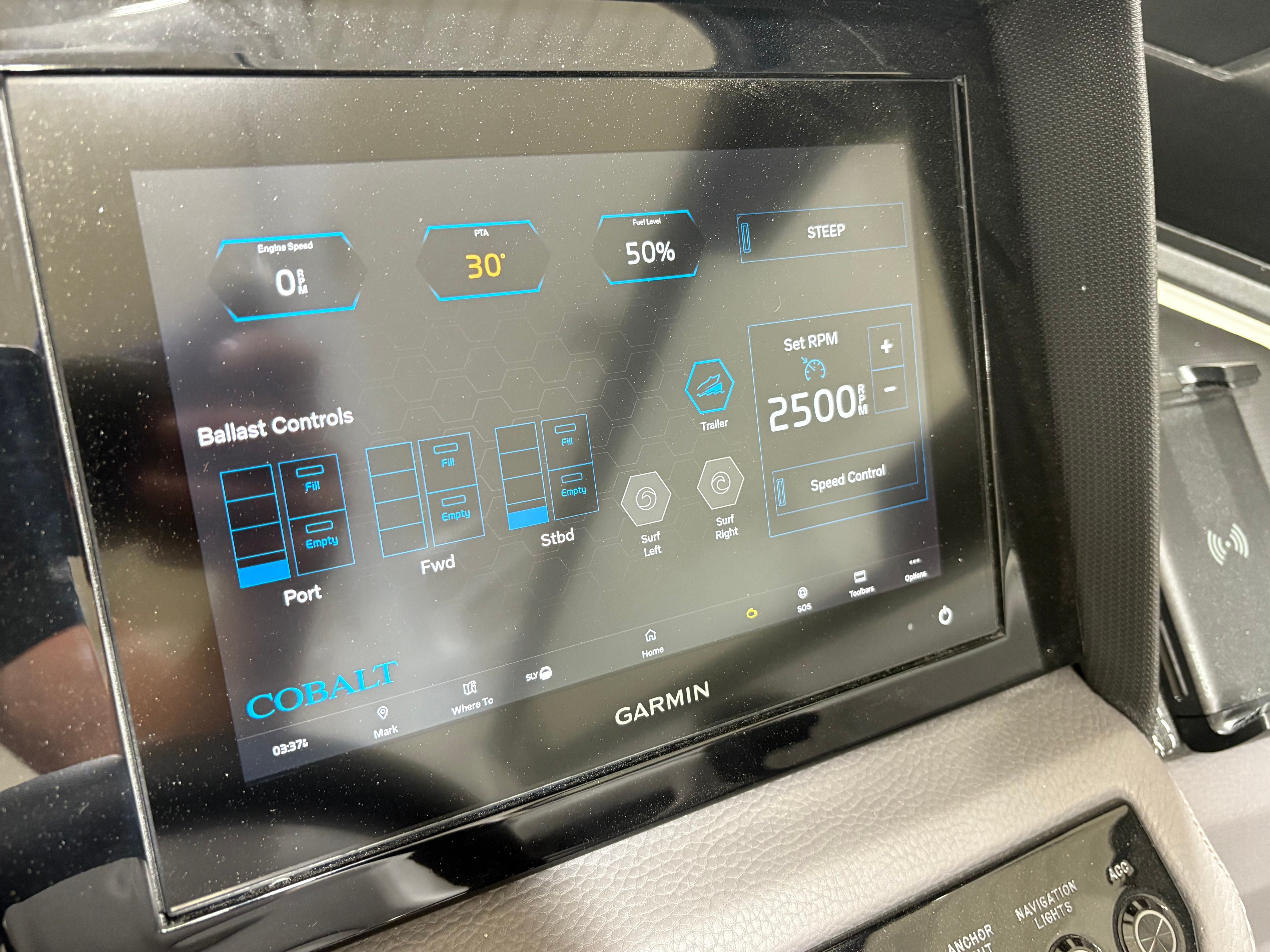Practicality meets luxury in the Cobalt R6 Surf. The folding electric arch and mooring cover make storage and docking straightforward, protecting your boat and simplifying maintenance. The stainless steel docking lights enhance visibility during low-light conditions, making it easier to navigate marinas and docks safely. The Seagrass floor covering is not only stylish but also durable and easy to clean, ensuring your boat stays looking its best season after season.The dual Volvo 8610 displays in the glass cockpit provide comprehensive information at a glance, streamlining navigation and engine monitoring. The premium sound system, with transom speakers and remote, allows you to control your music from anywhere on the boat, adding convenience and enjoyment to every outing. These practical features make the R6 Surf a pleasure to own and operate, whether you are a seasoned captain or new to boating.