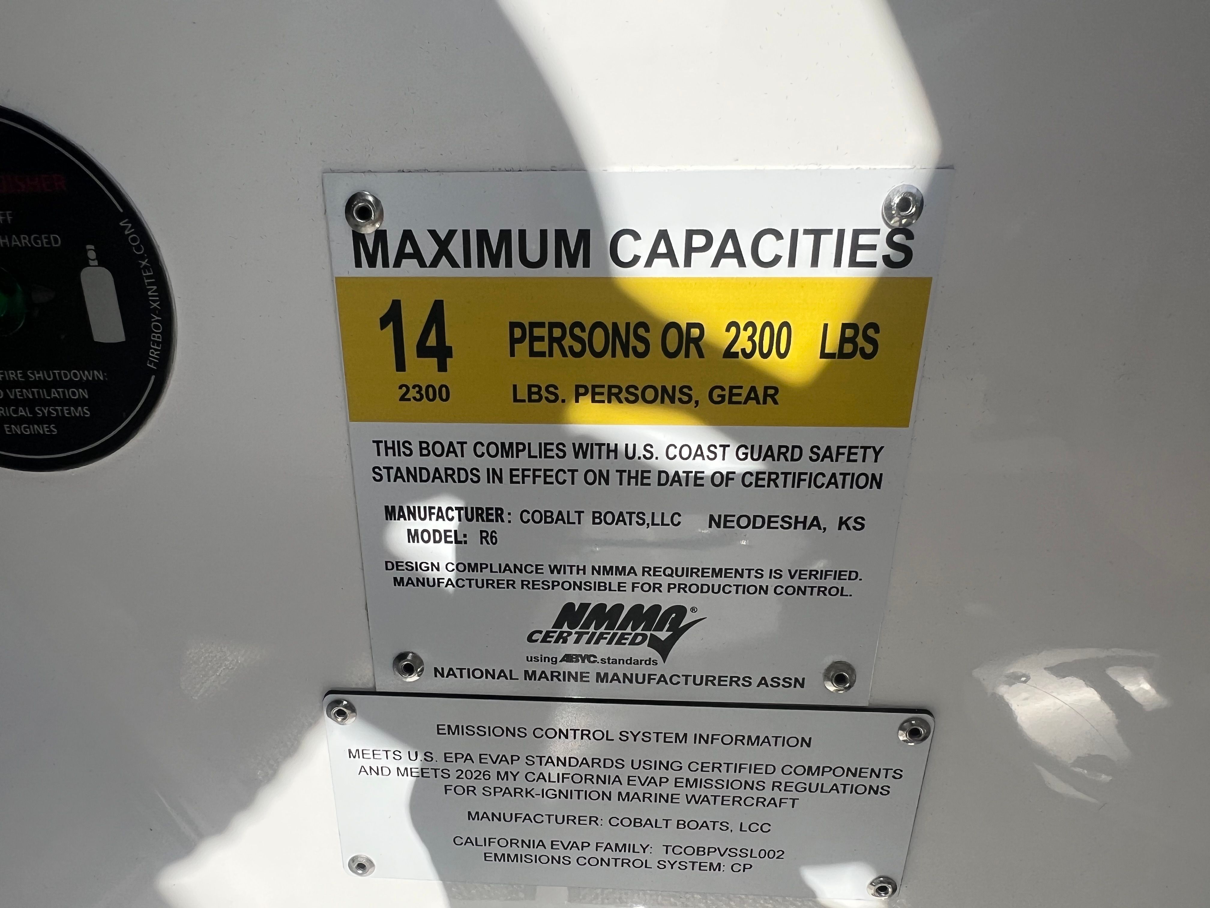 The 2026 Cobalt R6 is loaded with special features that enhance both its functionality and aesthetic appeal. The hull bottom is finished in a crisp white, providing a clean and modern look that complements the boat’s elegant lines. The Arch E2 White with Bimini in Capt Navy offers both shade and style, allowing you to enjoy sunny days while staying protected from the elements. The battery maintainer/charger ensures your boat is always ready for action, while the Cobalt letters in black satin add a touch of sophistication to the exterior.For those who appreciate attention to detail, the R6 includes a flagpole with flag, adding a classic nautical touch. The floor covering is crafted from Seagrass Raw Umber, offering both comfort and durability underfoot. The glass cockpit features dual Garmin 8610 displays, providing state-of-the-art navigation and control at your fingertips. LED interior accent lighting creates an inviting atmosphere for evening cruises, and the mooring cover for the folding arch helps protect your investment when the boat is not in use.