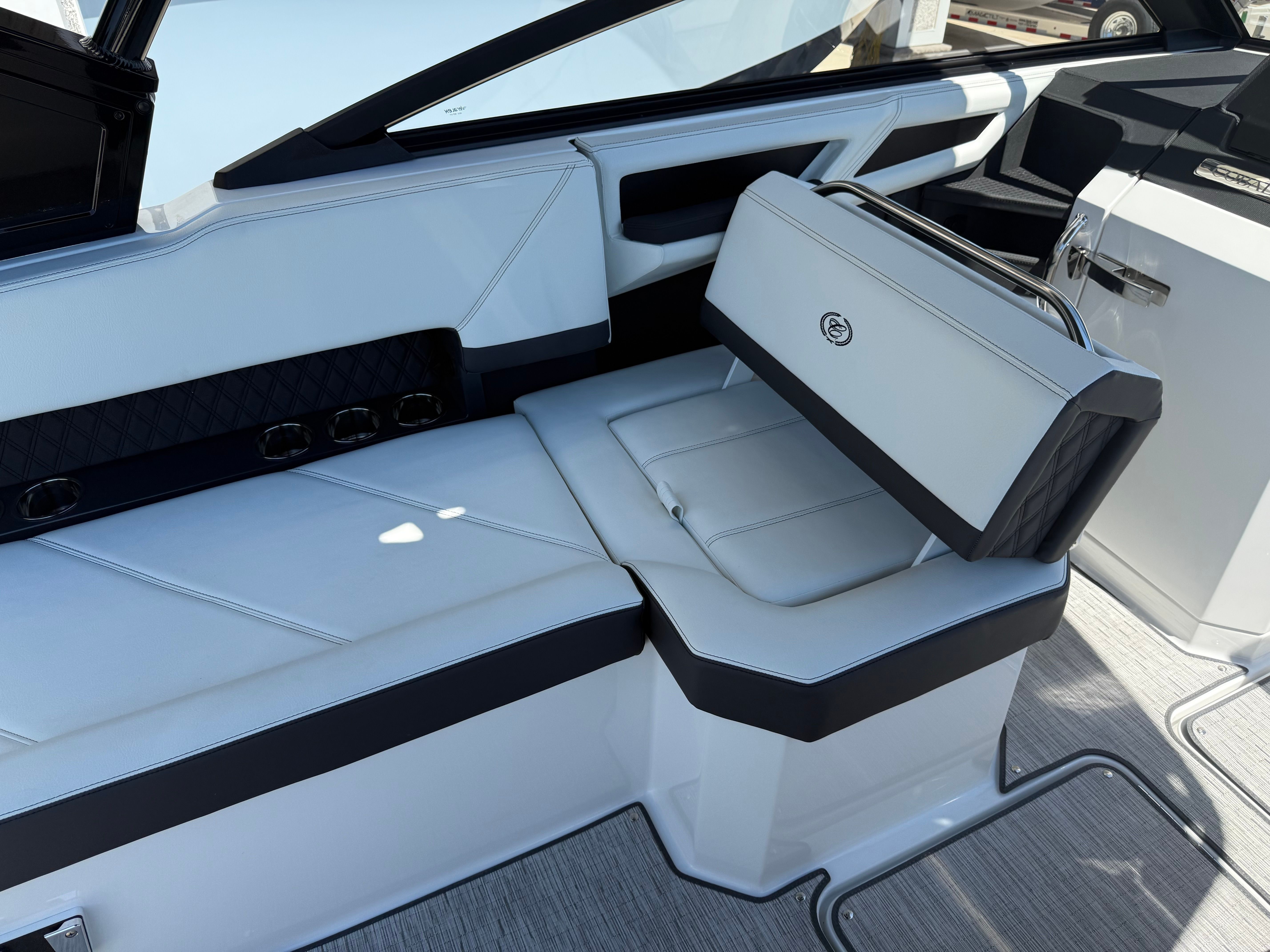 Owning the Cobalt R8 OB Bowrider opens up a world of fun and relaxation. The spacious layout is perfect for hosting gatherings, enjoying sun-soaked afternoons, or embarking on spontaneous adventures. The comfortable seating and thoughtful amenities make every outing enjoyable, whether you’re cruising with family, entertaining friends, or simply unwinding in your favorite cove. The combination of luxury finishes and practical features ensures that every moment on board is both comfortable and memorable.The twin Yamaha engines offer not only impressive speed but also smooth, quiet operation, allowing you to enjoy the serenity of the water without distraction. The rotating shade arch provides customizable protection from the sun, so you can stay cool and comfortable throughout the day. With easy access via the boarding ladder and convenient shower facilities, swimming and water sports become effortless and enjoyable for everyone on board.