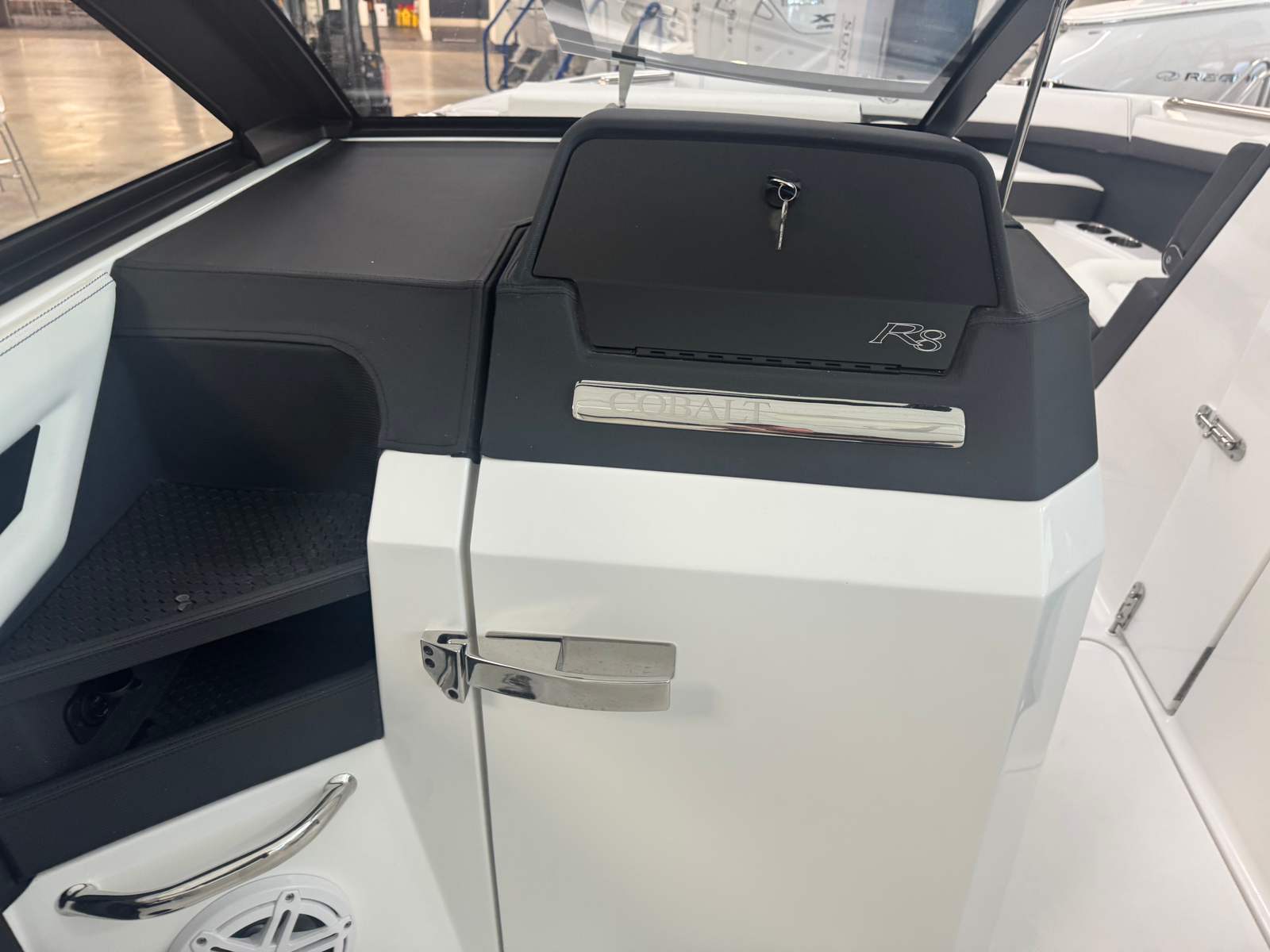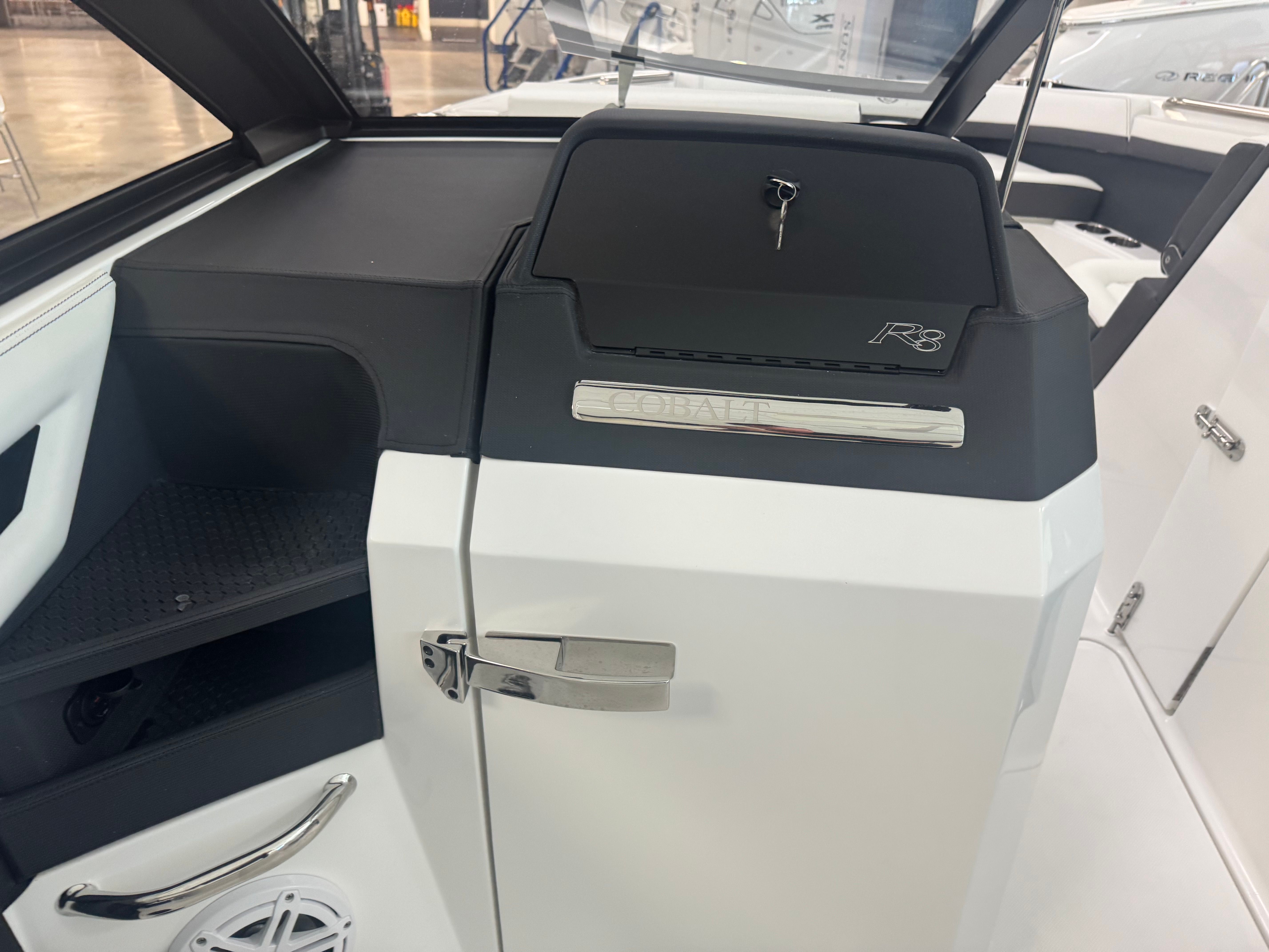 Step aboard the Cobalt R8 OB and experience a world of luxury and innovation. The Summit/Frost Interior creates a welcoming and contemporary atmosphere, while LED interior accent lighting with R/G/B options allows you to set the perfect mood for any occasion. The Bayside Blue exterior, complemented by a striking accent stripe, ensures this boat stands out on the water.For those sunny days, the Bow Shade Sail in black provides essential shade and comfort for passengers relaxing in the bow. The Obsidian Windshield not only enhances the boat’s aesthetics but also offers superior protection from wind and spray. The Premium Sound system, complete with transom speakers and a remote, delivers crystal-clear audio, ensuring your favorite tunes are always part of the experience.Attention to detail is evident throughout, with Stainless Steel Foot Tread for added durability and style, and a Leather Steering Wheel Upgrade in black and gray for a luxurious touch at the helm. Fender Clips with Line make docking and securing the boat effortless, while the Head with Electric Porcelain Toilet offers convenience and comfort for extended days on the water.