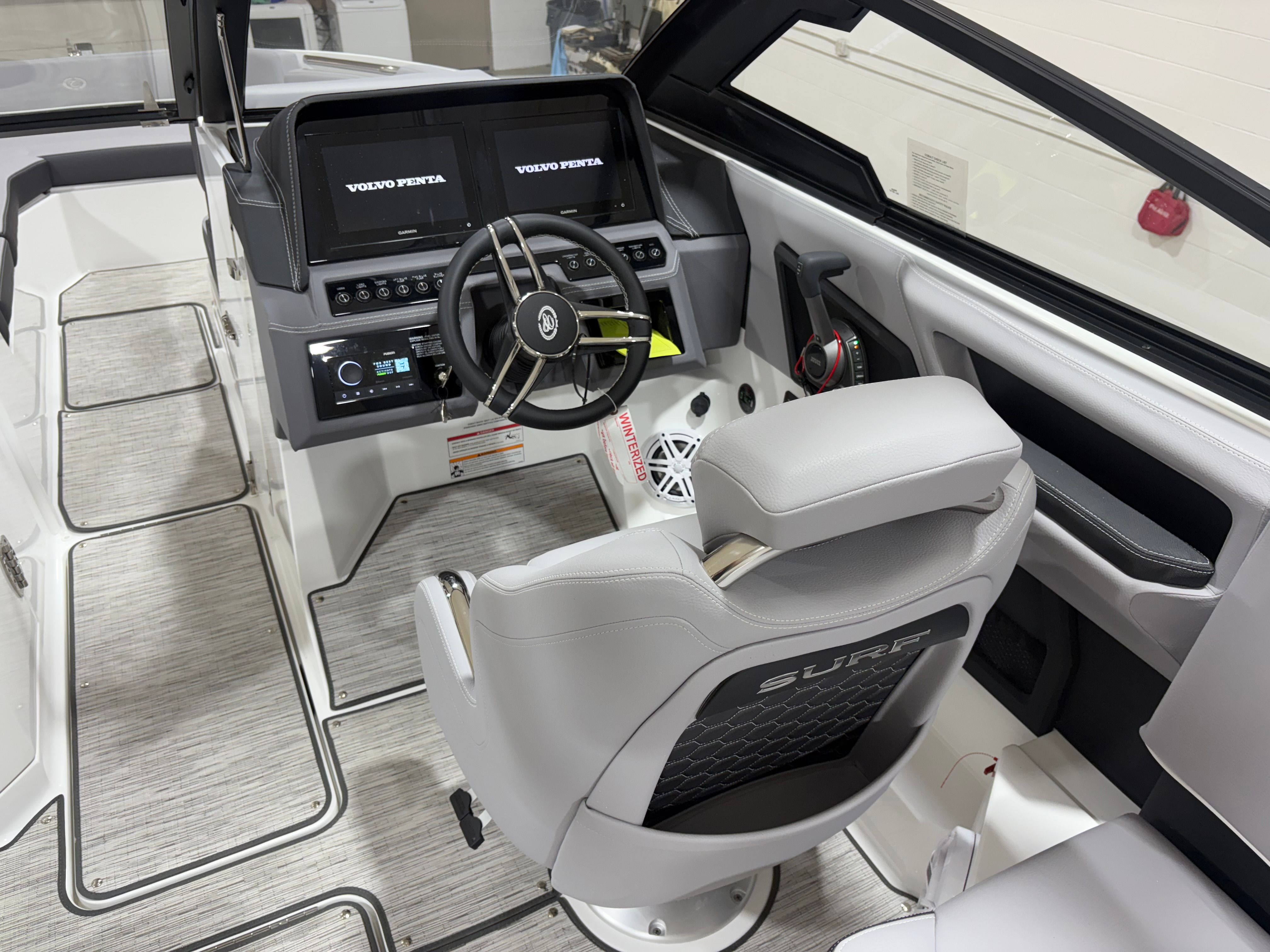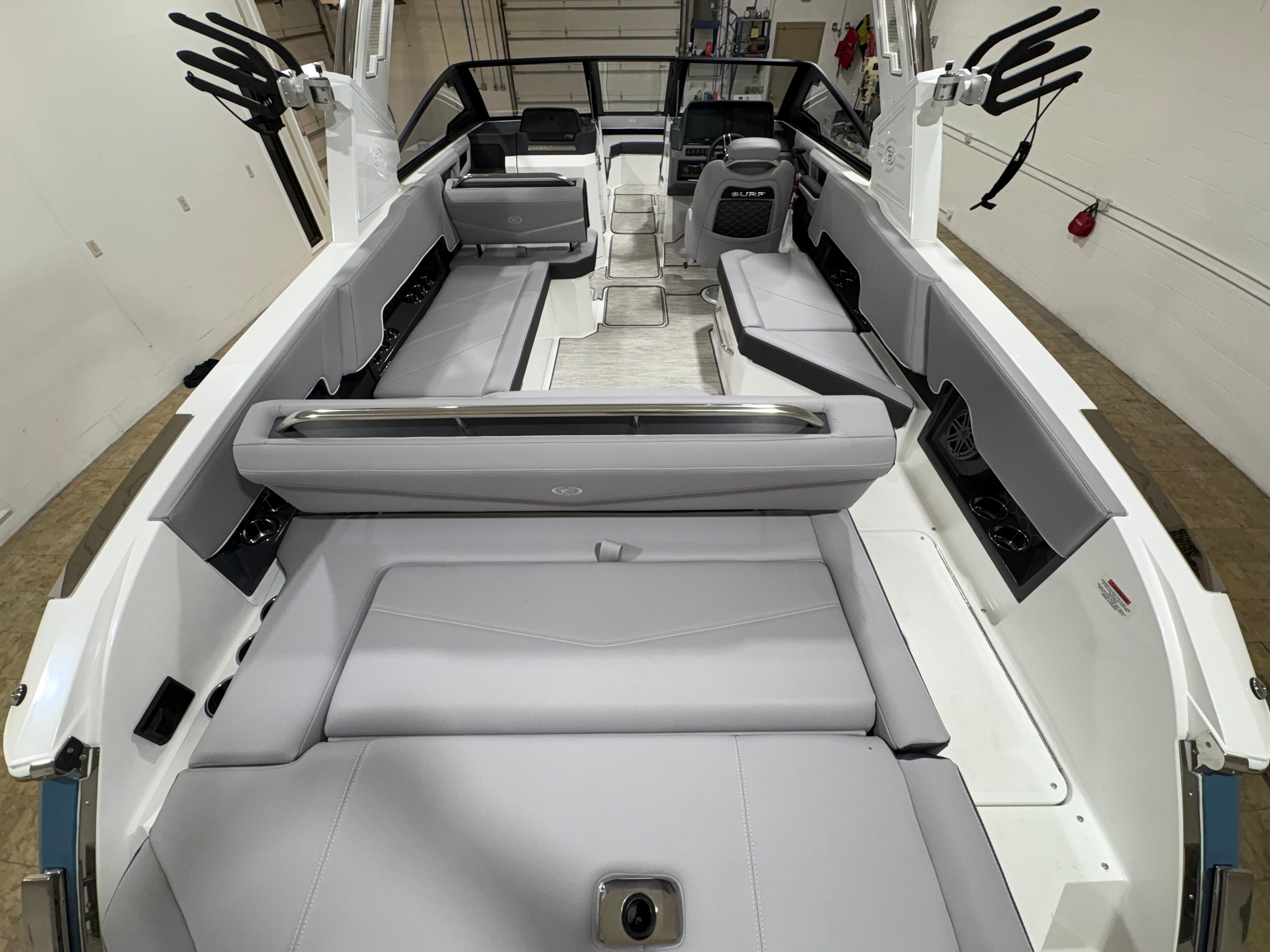 The 2026 Cobalt R8 Surf is loaded with premium features that set it apart from other bowriders on the market. The stainless steel docking lights not only add a touch of elegance but also enhance visibility and safety during low-light conditions. The White EL Arch, Prisma (Folding) with Gray Bimini, offers both style and functionality, providing shade and flexibility for different weather conditions. The floor covering in Seagrass, Silver Ash, adds a luxurious feel underfoot while being durable and easy to maintain.Step inside, and you will be greeted by a sophisticated interior finished in Frost, Slate, and White, creating a modern and inviting atmosphere. The glass cockpit, featuring dual Volvo 8610 displays, puts advanced navigation and control at your fingertips, ensuring a seamless and intuitive boating experience. The hull bottom in Bayside Blue not only enhances the boat’s visual appeal but also reflects Cobalt’s commitment to quality and craftsmanship.For those who love music on the water, the premium sound system with transom speakers and remote ensures that your favorite tunes are always within reach, whether you are lounging in the cockpit or enjoying the swim platform. The Surf Gate Accent in Pacific Blue adds a custom touch, highlighting the boat’s surf-ready capabilities. A mooring cover with Prisma folding arch protects your investment and keeps your boat looking pristine.