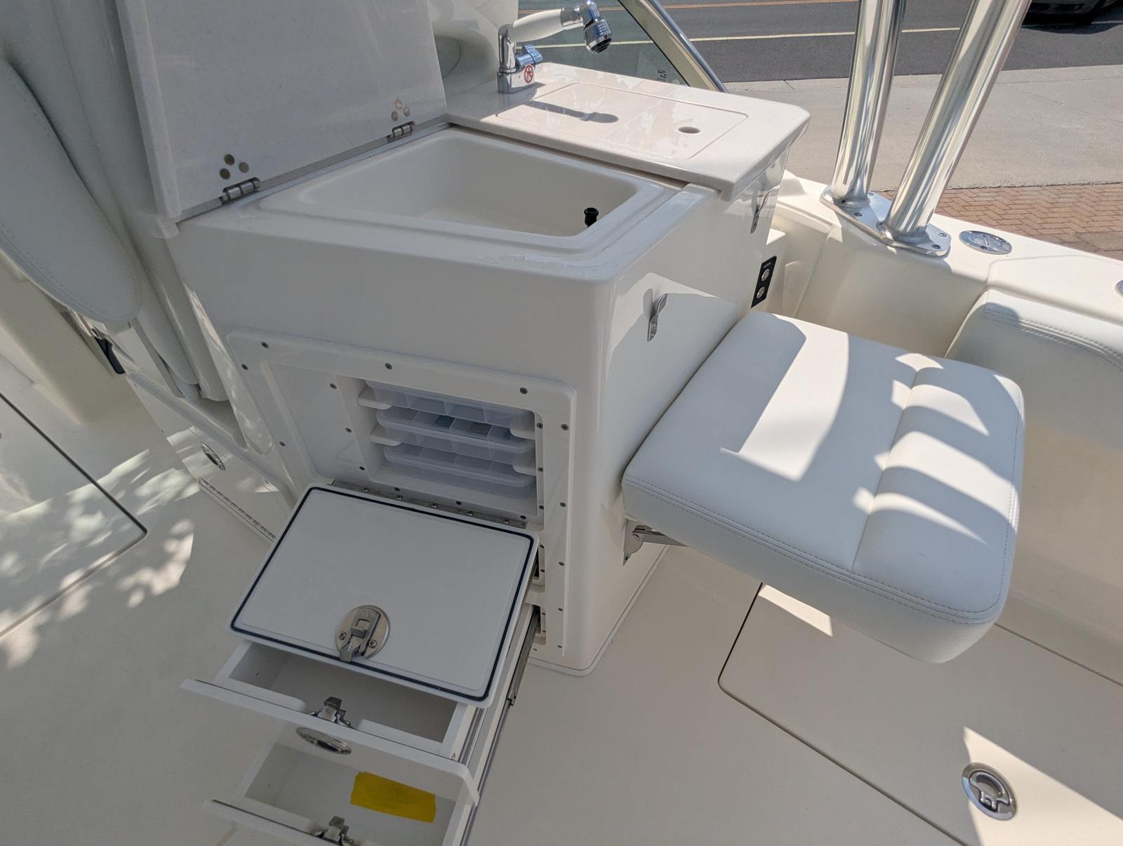 The Cobia 240 DC is designed with practicality in mind, making ownership as enjoyable as it is effortless. The hardtop provides shade and shelter, extending your boating season and enhancing comfort during hot summer days or unexpected rain showers. The faux teak decking is not only visually appealing but also easy to clean and maintain, ensuring your boat looks pristine with minimal effort. Digital Electric Steering and Helm Master controls simplify docking and tight maneuvers, reducing stress and making it easier for boaters of all experience levels to handle the vessel. The trim tab indicators allow for quick adjustments to optimize fuel efficiency and ride comfort, while the integrated Garmin electronics streamline navigation and fish finding, making every trip more productive and enjoyable.