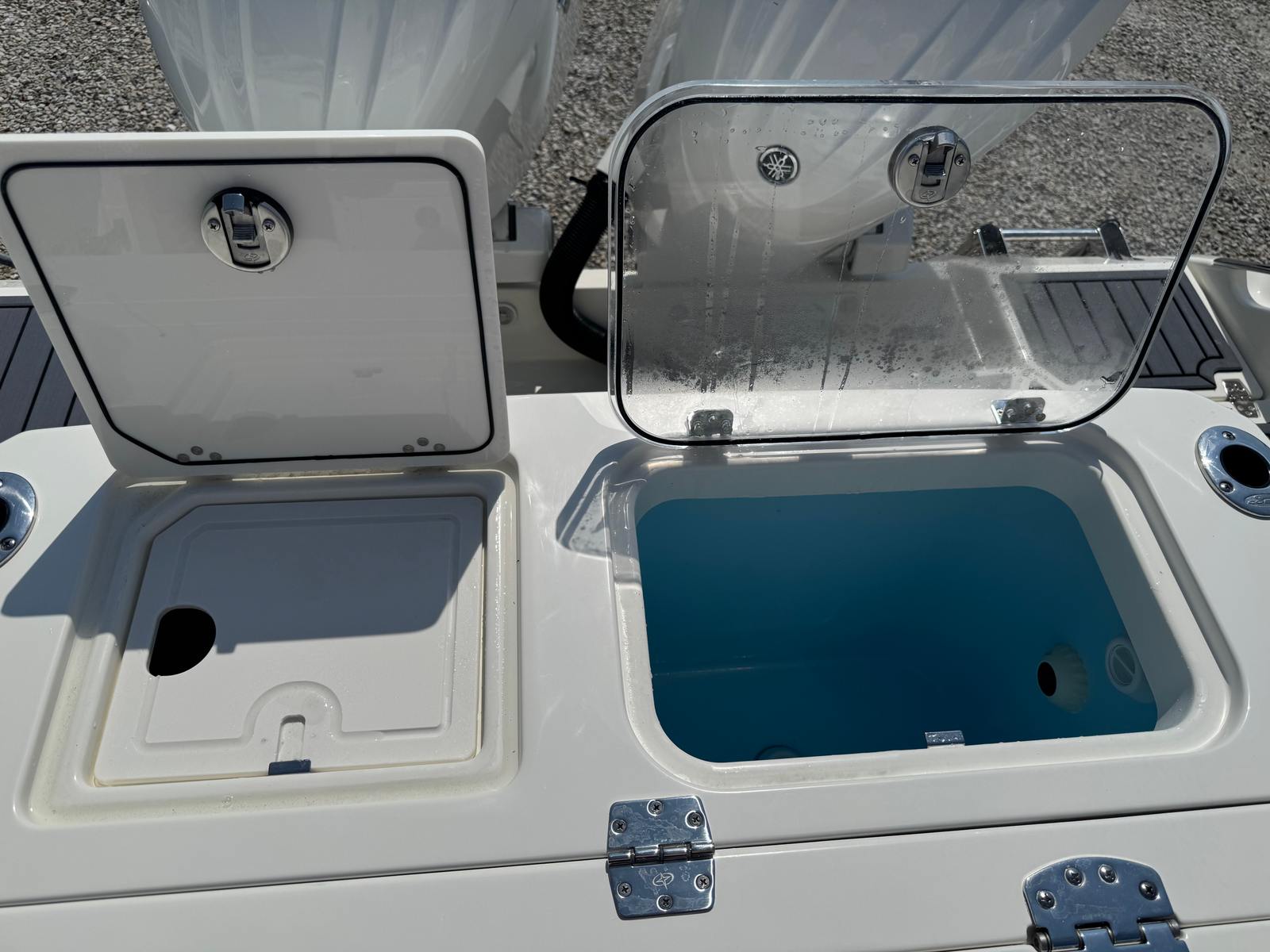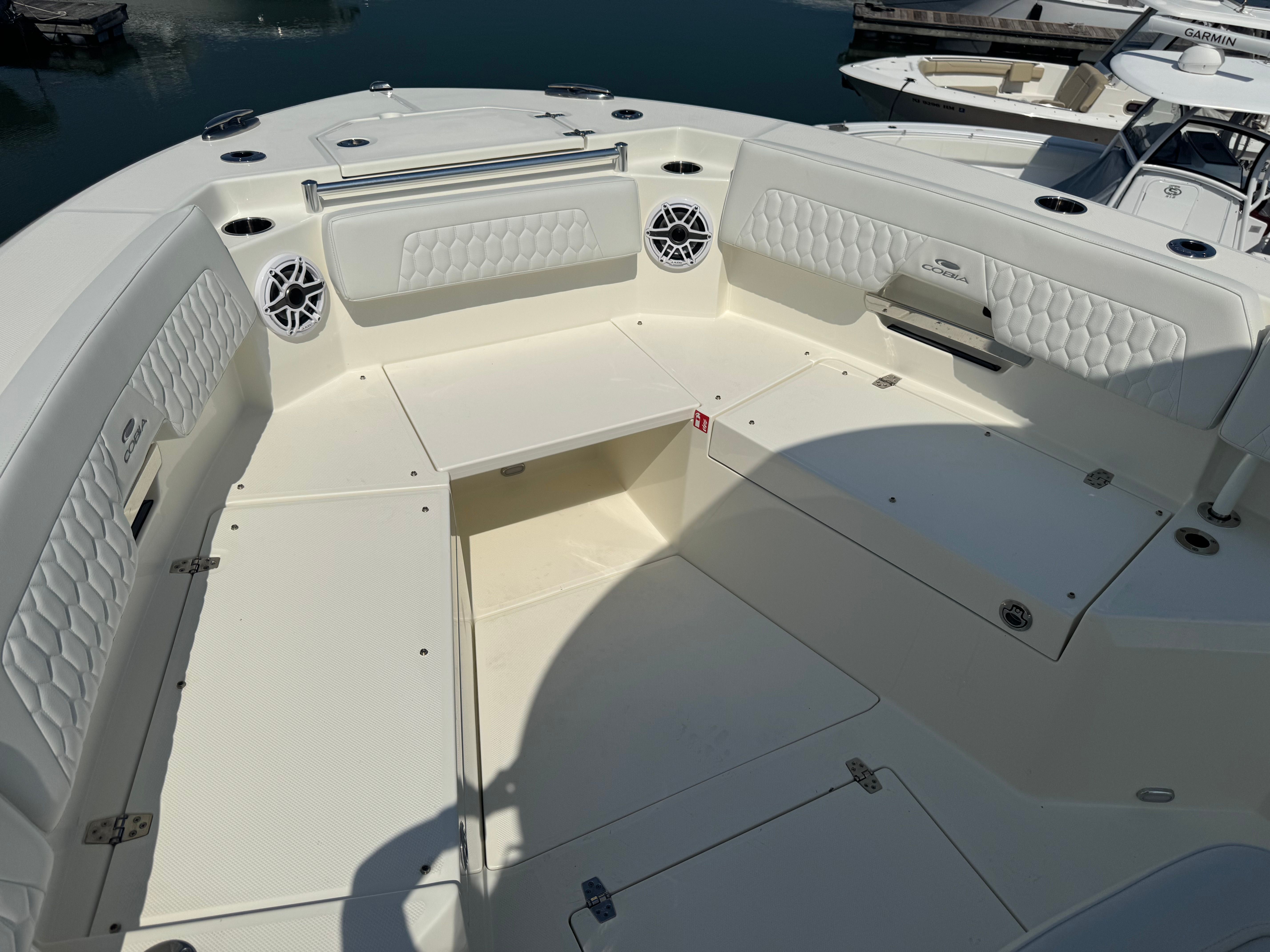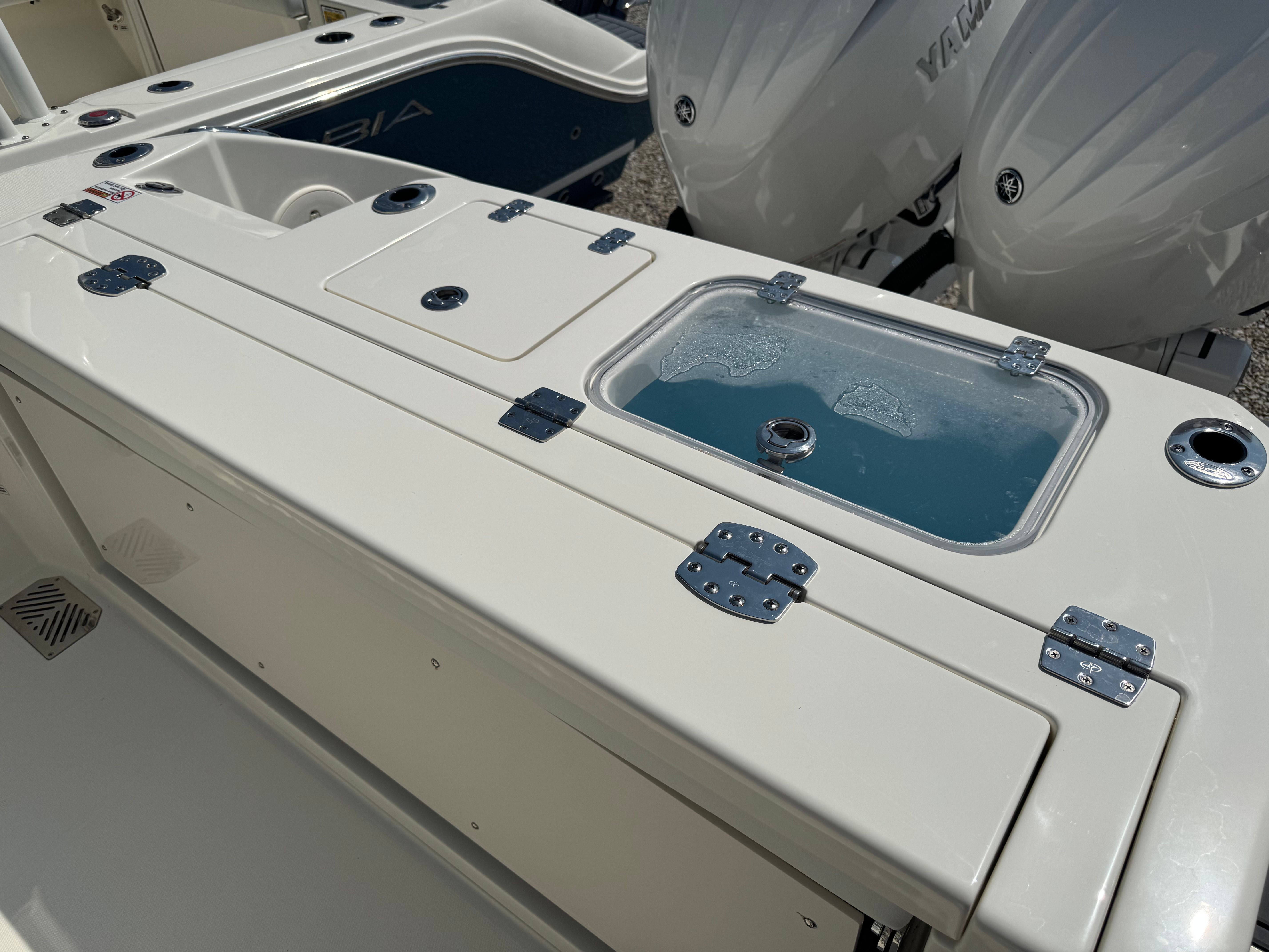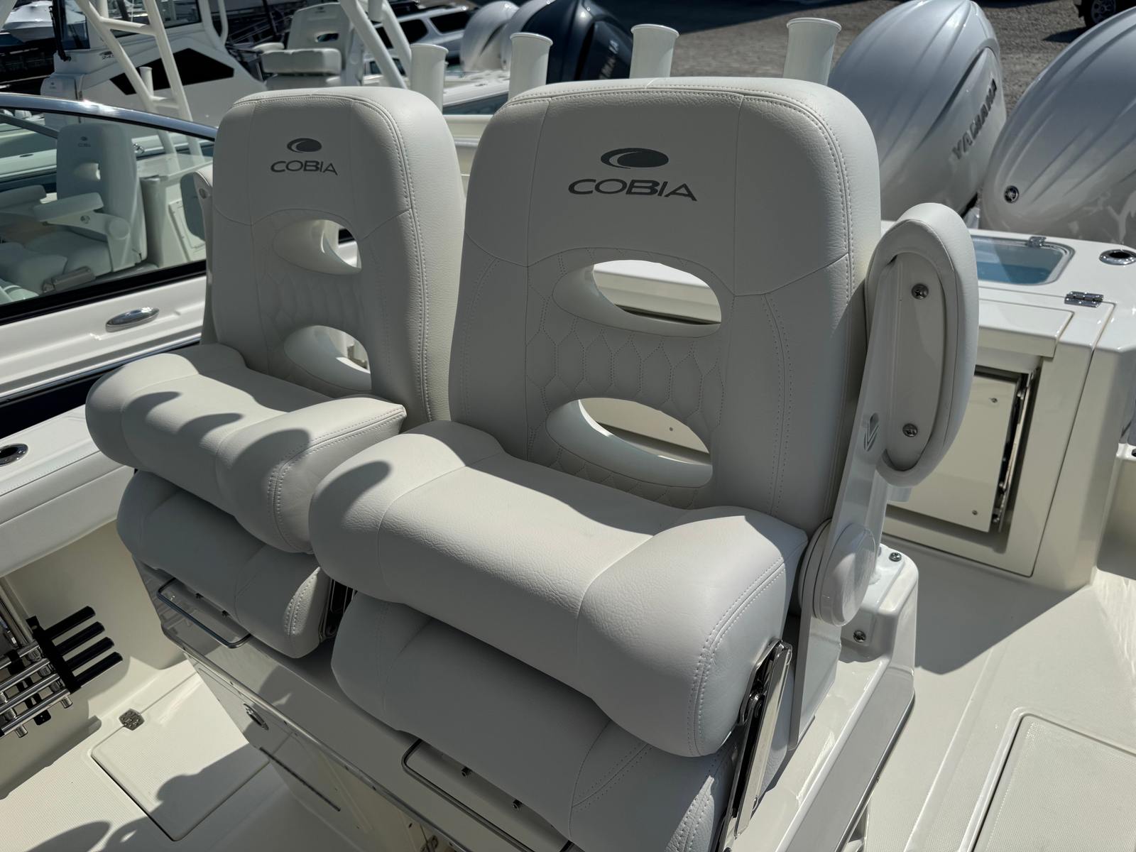 Powering this exceptional Center Console boat is a pair of Yamaha Twin 200XSA2 engines, finished in a striking white. With a combined 400 horsepower, the Cobia 265 CC delivers exhilarating speed, smooth acceleration, and reliable performance in all conditions. The advanced Helm Master EX DES Twin Engine system with ISO charger ensures precise control and effortless maneuverability, while the digital electric steering provides a responsive and intuitive driving experience. The upgraded Edson steering wheel with a stainless power knob adds a touch of luxury and makes handling the boat a breeze, even in challenging waters. Trim tab indicators allow for easy adjustments, helping you maintain optimal balance and efficiency as you cruise.