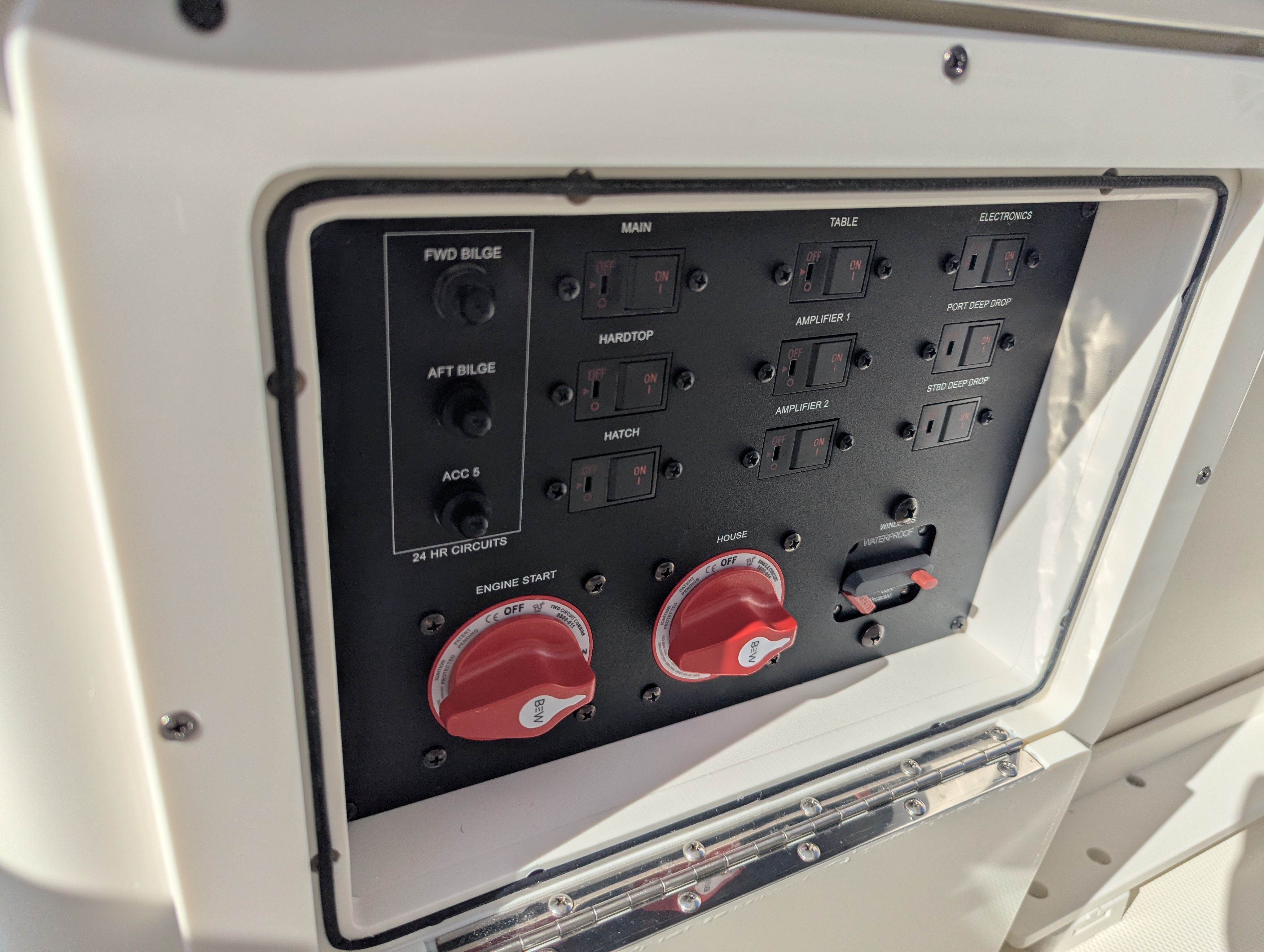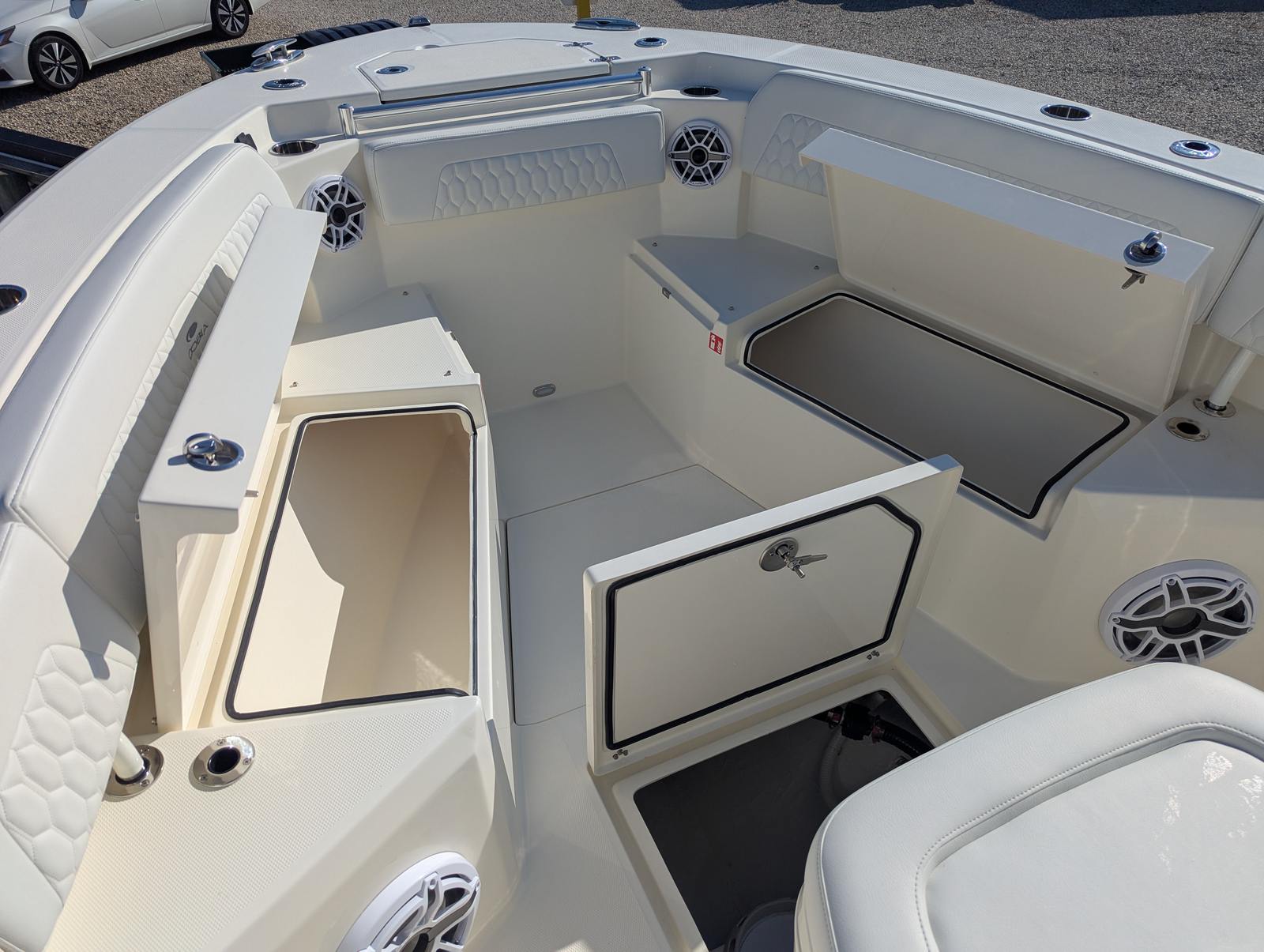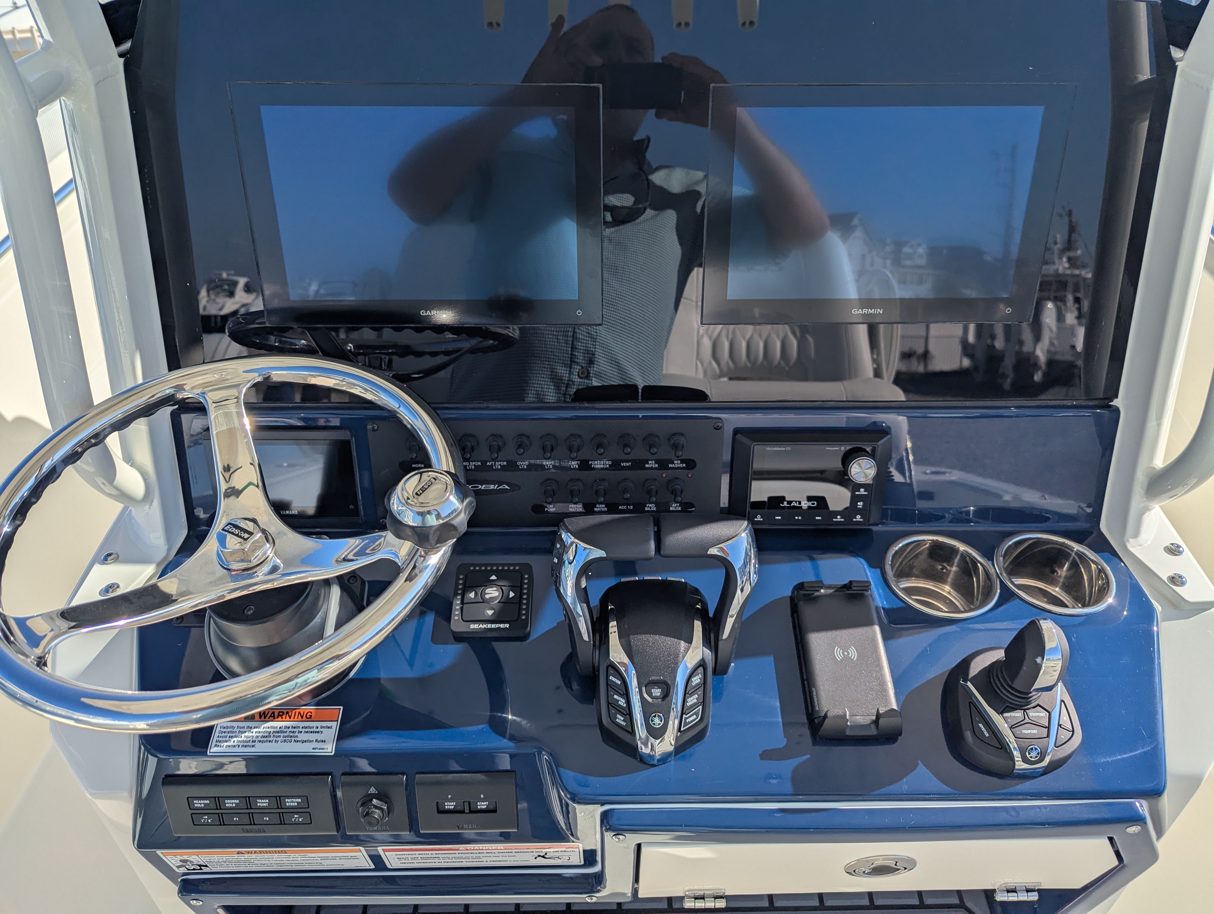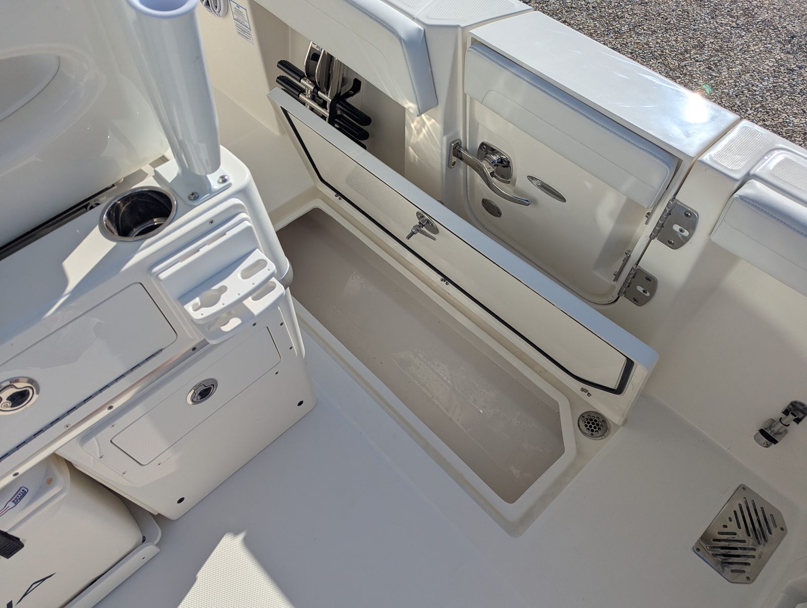 Powering the Cobia 265 CC are twin engines, delivering a combined 400 horsepower for exhilarating acceleration and confident handling. The advanced engine controls, featuring the Helm Master EX DES Twin Engine with AP/JOY and ISO Charger, provide precise maneuverability and effortless docking, even in challenging conditions. The Seakeeper Ride trim tabs and indicators further enhance stability and ride comfort, allowing you to tackle choppy waters with ease. Whether you’re chasing the next big catch or cruising with loved ones, this center console boat for sale offers the performance and reliability you need for unforgettable days on the water.