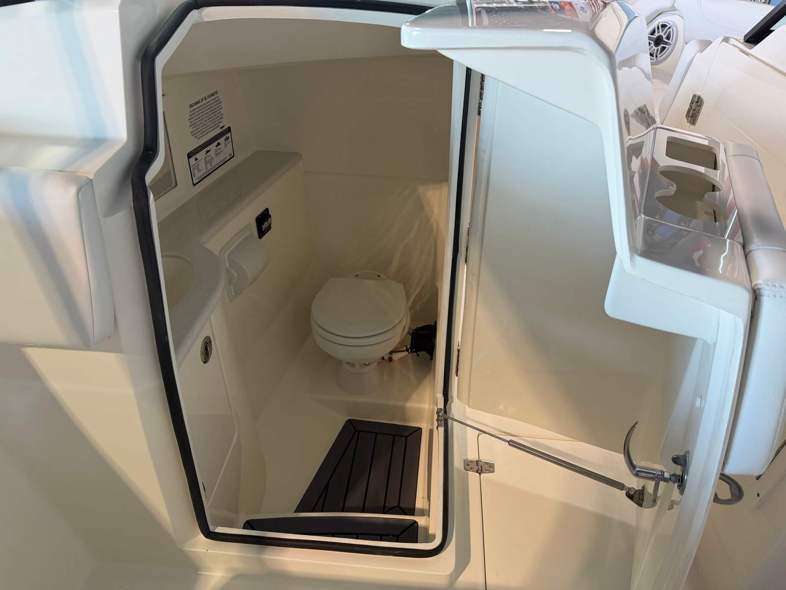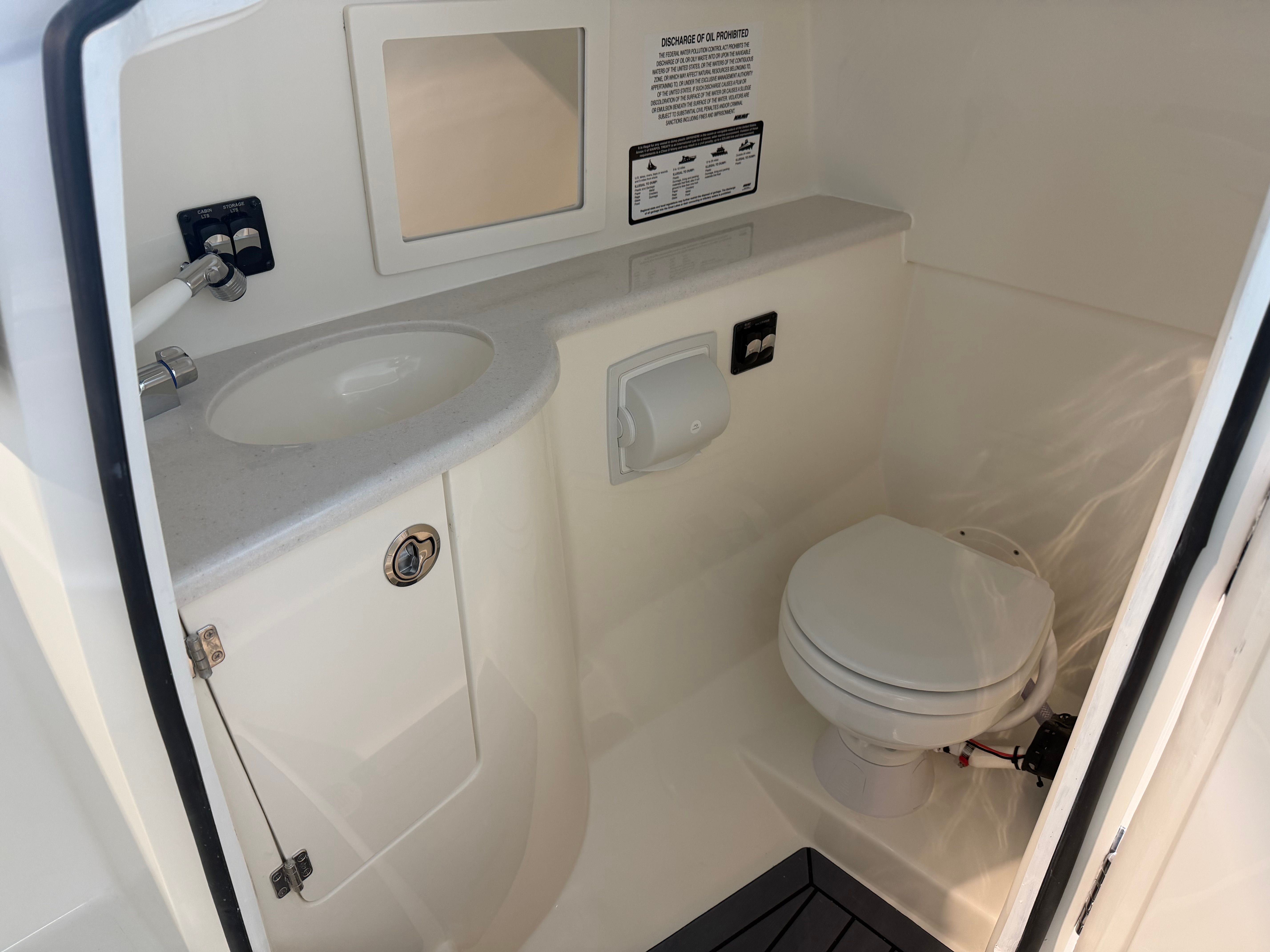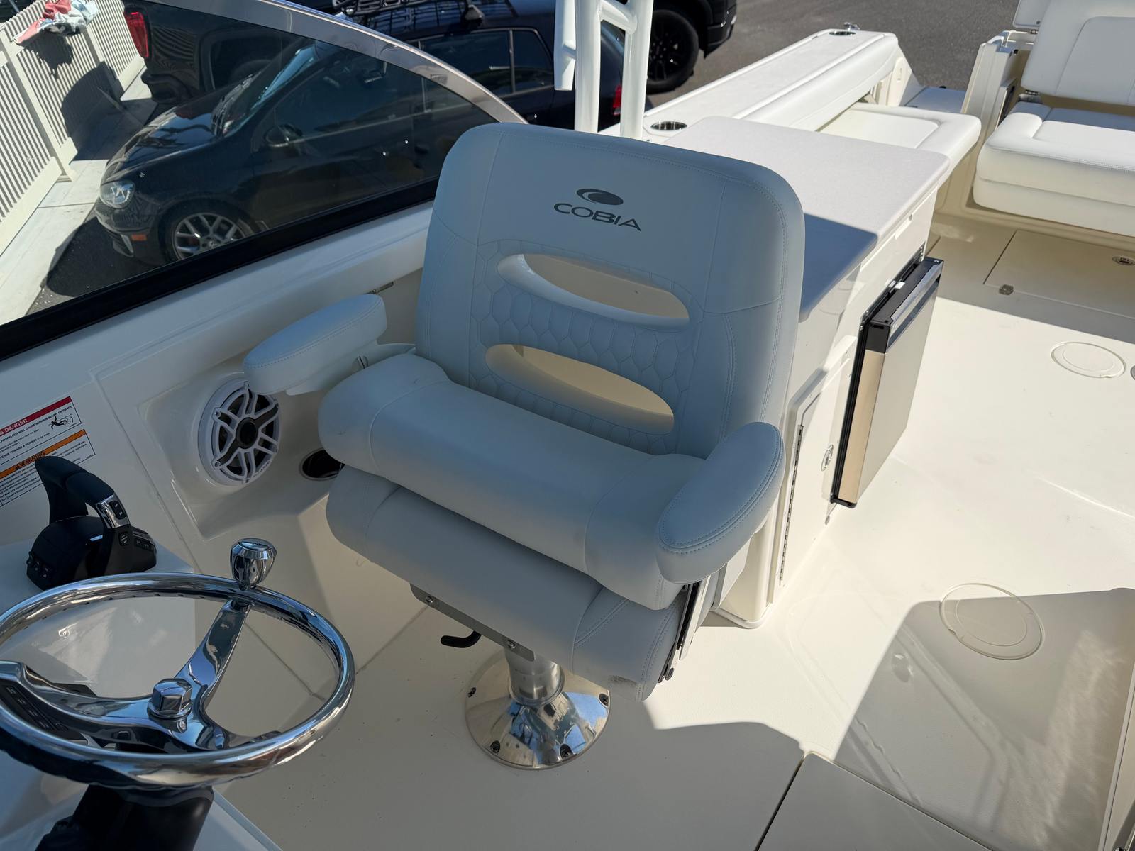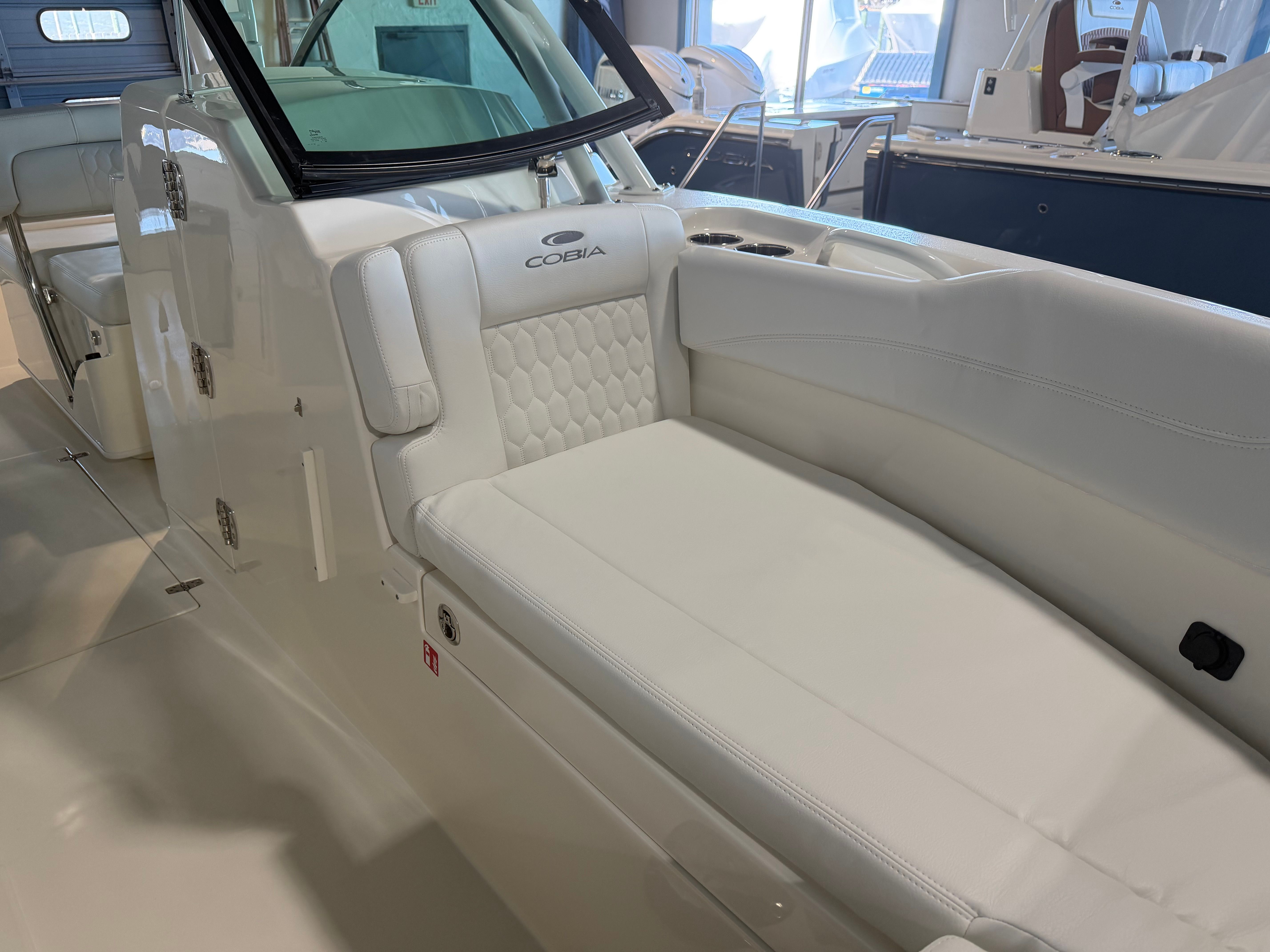 This Cobia boat for sale is loaded with premium features designed to elevate your boating experience. The GEM stainless steel steering wheel offers both durability and a touch of sophistication at the helm. Trim Tab Indicators ensure optimal ride adjustment, allowing you to tailor your boat’s performance to changing conditions with ease. The faux teak decking in grey and black, located at the head and helm, adds a luxurious, non-slip surface that is both stylish and practical.Comfort is paramount on the Cobia 280 DC, with plush white cushions and dedicated seating options on both the starboard and port sides. These thoughtfully designed seating areas invite you and your guests to relax and enjoy the journey, whether you are anchored at your favorite cove or cruising along the coastline. The onboard 12V DC refrigerator keeps your refreshments chilled and easily accessible, making it simple to entertain friends and family during long days on the water.