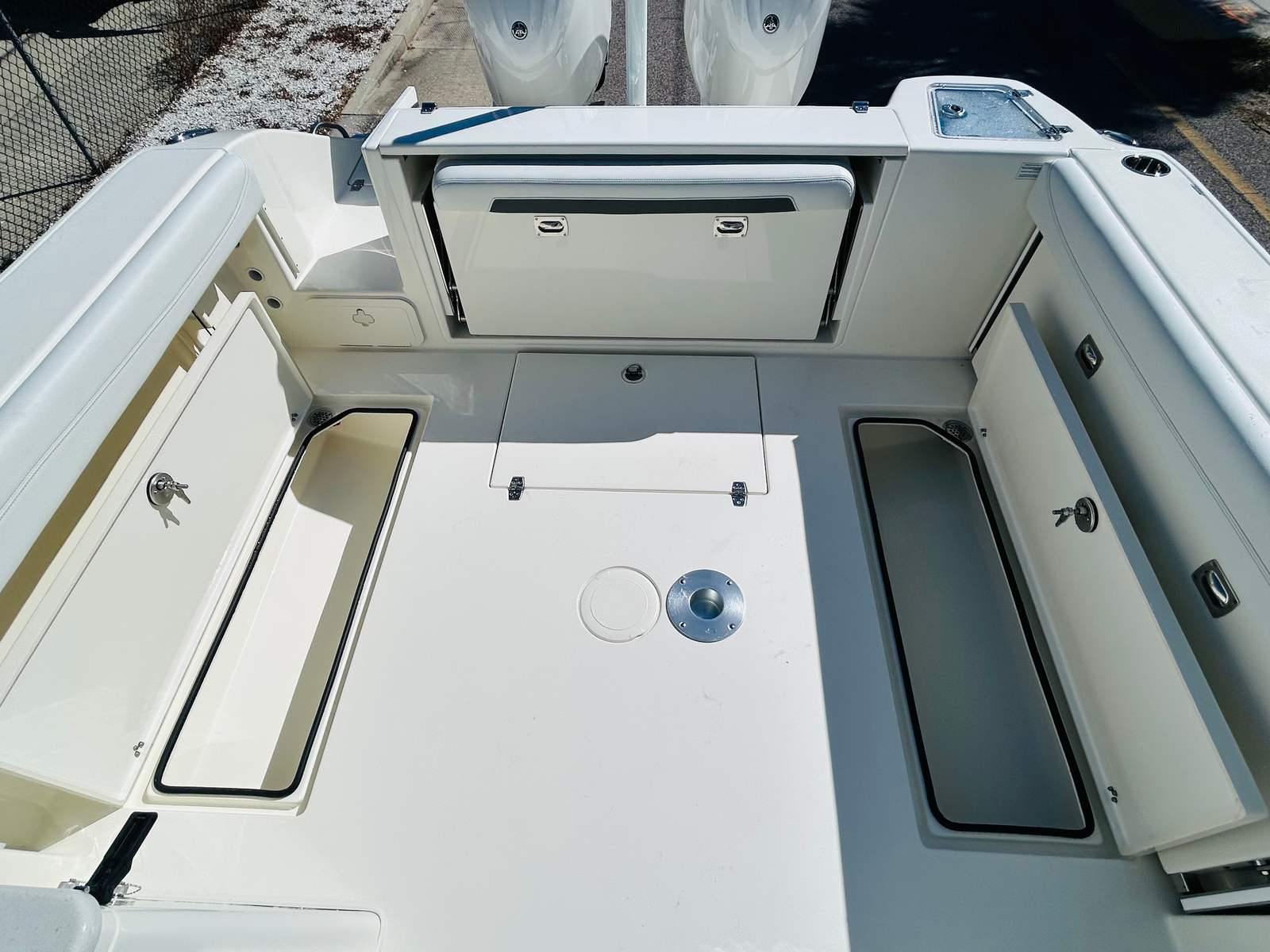 The Cobia 280 DC is packed with premium features designed to elevate your boating experience. The GEM stainless steel trim tab indicator allows for easy adjustments, optimizing your ride in varying conditions. Faux teak decking at the head and helm in sophisticated grey and black adds a touch of elegance and durability, while the plush seating on the port side invites guests to relax in comfort. The JL Audio stereo system, complete with an amplifier and eight white speakers, delivers crystal-clear sound, transforming every outing into a lively event. The Atlantic Blue hull color and two-tone platinum and white cushions not only enhance the boat’s aesthetics but also ensure a welcoming and stylish environment for all aboard.