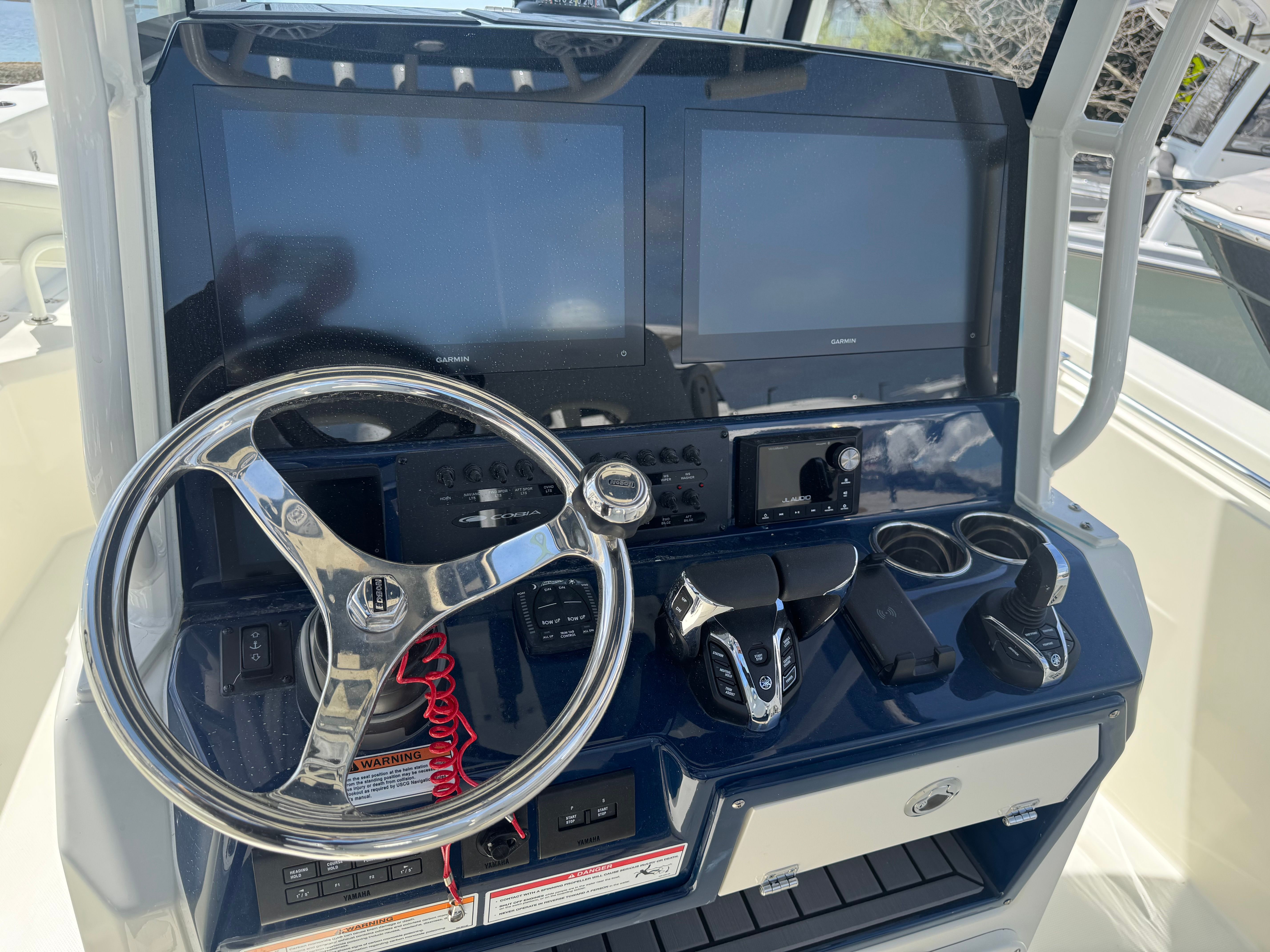 Power and precision define the Cobia 285 CC’s performance. Equipped with twin Yamaha F300XSB2 engines in a striking white finish, this boat boasts a combined 600 horsepower, ensuring exhilarating speed and smooth handling. The advanced Helm Master EX DES Twin Engine system with autopilot, joystick, and ISO charger provides effortless control and maneuverability, allowing you to navigate with confidence in any conditions. Digital electric steering and the upgraded Edson stainless steering wheel with power knob offer responsive handling and a premium feel at the helm. Whether you’re cruising along the coast or heading offshore for a day of fishing, the Cobia 285 CC delivers reliable power and exceptional performance every time you hit the water.