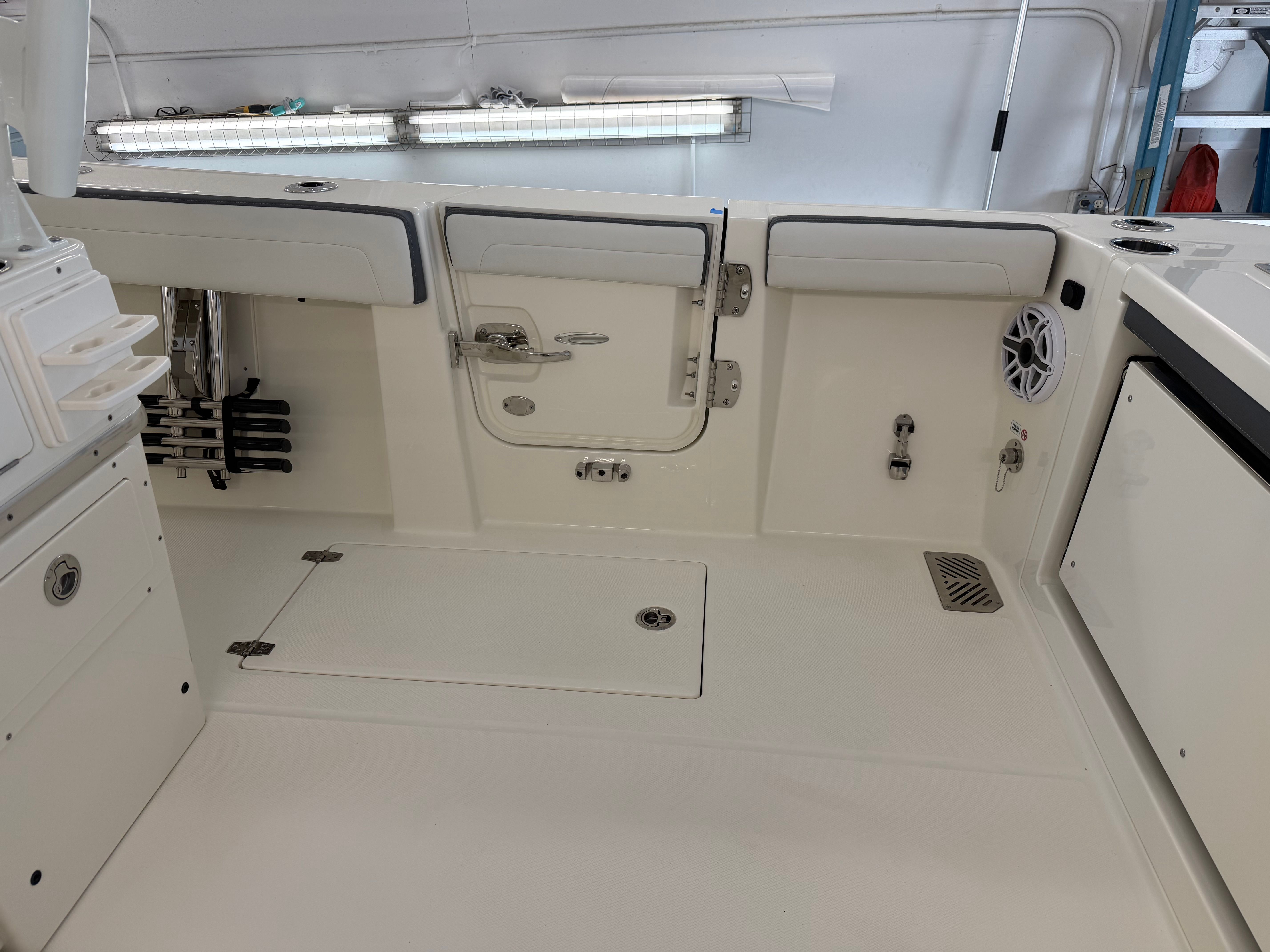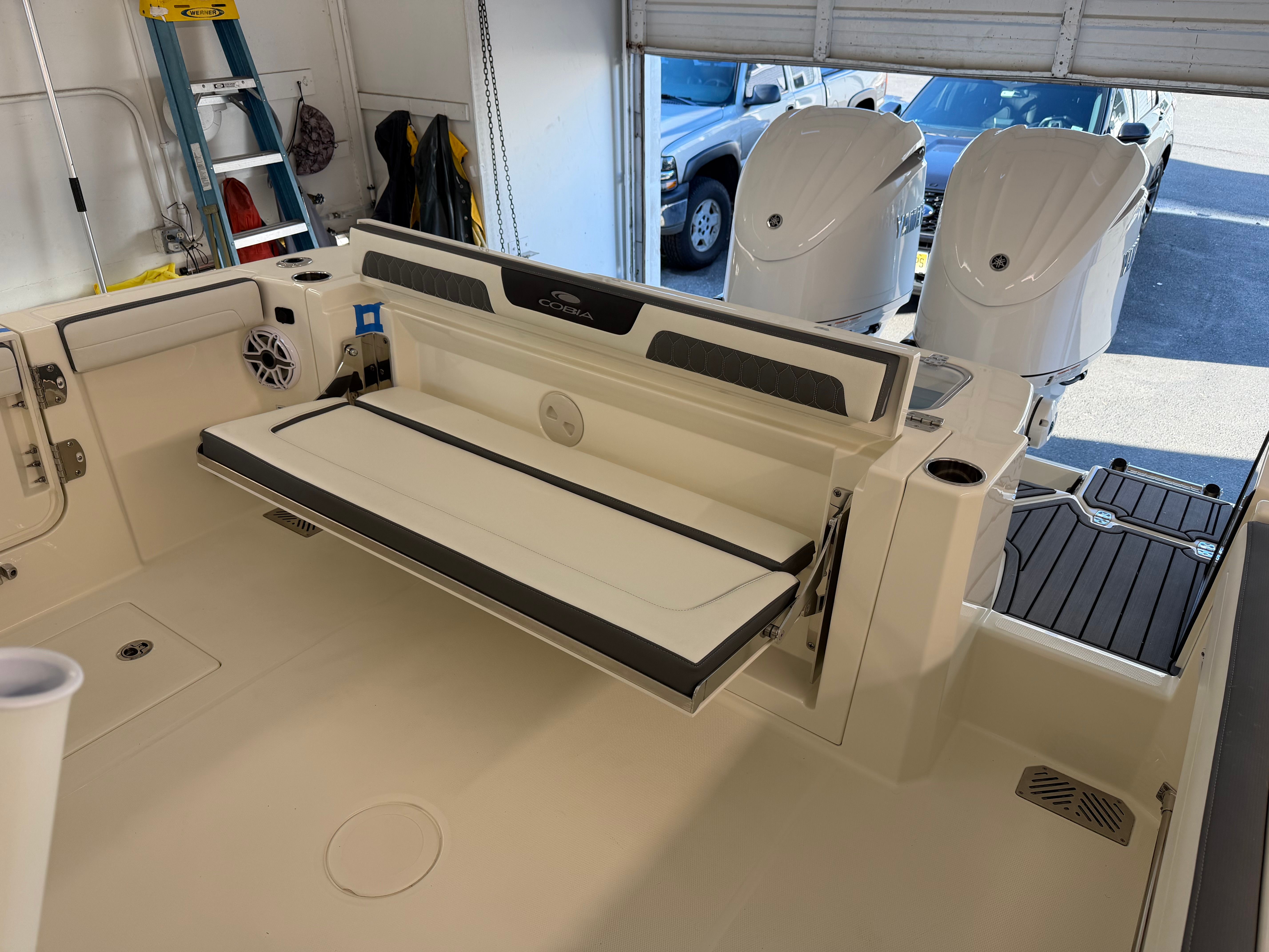 The 2026 Cobia 285 CC is packed with special features that enhance both functionality and enjoyment. The JL Audio stereo system, complete with four white speakers mounted on the hard top, delivers crystal-clear sound for your favorite tunes, creating the perfect atmosphere for entertaining guests or relaxing with family. The wireless phone charger ensures your devices stay powered up, so you can stay connected and capture every memorable moment.Anchoring is a breeze thanks to the Windlass Deluxe system, which includes a chain, rope, stainless steel anchor, and stem chafing guard for added durability and convenience. The windlass system upgrades feature a wireless remote for effortless operation, a fresh water washdown for easy cleaning, and a 300-foot line upgrade for extended reach and versatility. Trolling motor prep is included, making this Center Console boat ideal for anglers who want to customize their fishing setup.Comfort and convenience are at the forefront of the Cobia 285 CC’s design. The manually adjusted forward table/sun lounge flushes into the floor, providing a versatile space for dining, lounging, or sunbathing. The helm seat base or leaning post features a Pure White FRP color, adding a touch of elegance to the cockpit area.