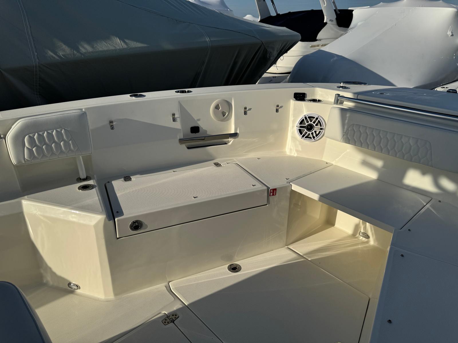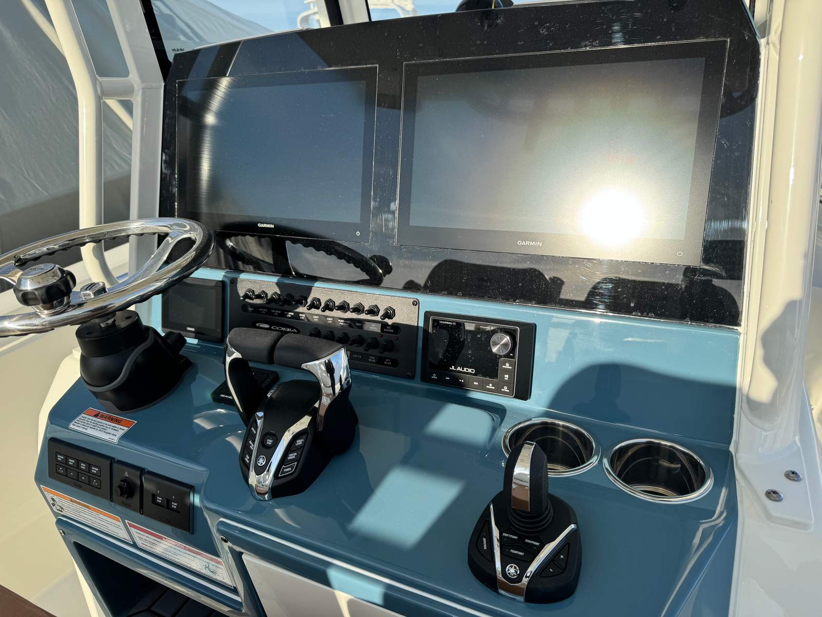 Power and precision define the performance of the Cobia 285 CC. Equipped with twin Yamaha F300XSB2 engines in a sleek white finish, this center console delivers a combined 600 horsepower. The advanced Yamaha engines are engineered for reliability, efficiency, and exhilarating speed, making every outing on the water a thrill. The inclusion of Helm Master EX with Digital Electric Steering (DES) and autopilot/joystick control provides effortless maneuverability, whether you’re docking in tight spaces or navigating open waters. The upgraded Edson steering wheel with a stainless power knob adds a touch of luxury and ensures responsive handling, giving you complete command at the helm.