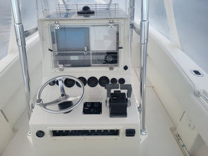 The 2001 Contender 27 Cuddy is thoughtfully equipped with features designed to enhance both functionality and comfort. The aft bench seat offers a comfortable spot for passengers to relax and enjoy the ride, while the double wide helm seat ensures the captain and a companion can navigate in comfort. The cockpit coaming bolsters provide added support during active fishing or when moving around the deck, and the cockpit storage ensures that gear and essentials are always within reach but neatly stowed away. For anglers, the dedicated fish box is a valuable asset, keeping your catch fresh and organized throughout the day. The Garmin 7610 XSV GPS/chart plotter brings advanced navigation and fish-finding capabilities to your fingertips, making every trip safer and more productive. Helm stereo controls allow you to set the perfect soundtrack for your journey without ever leaving the captain’s seat. The blue canvas adds a stylish touch and practical protection from the elements, while the batteries, just four years old, provide reliable power for all onboard systems.