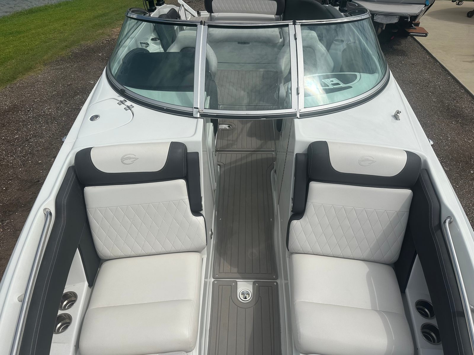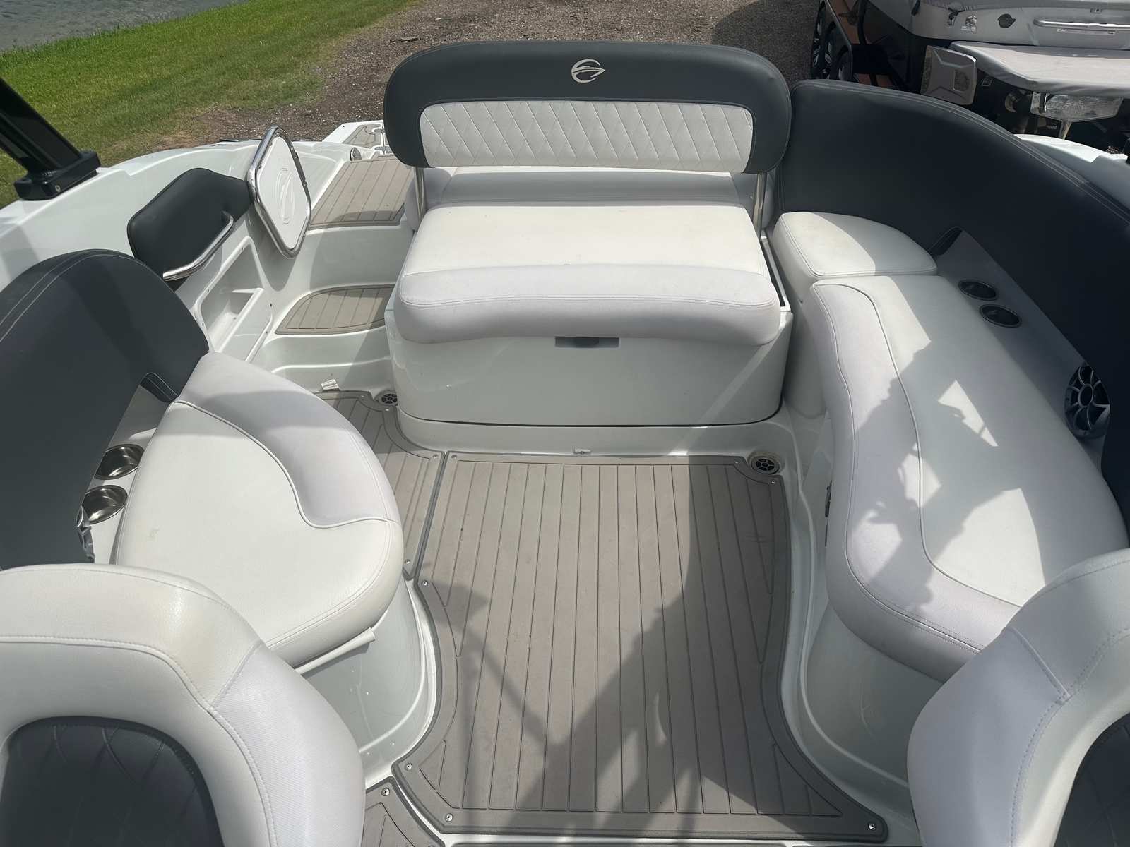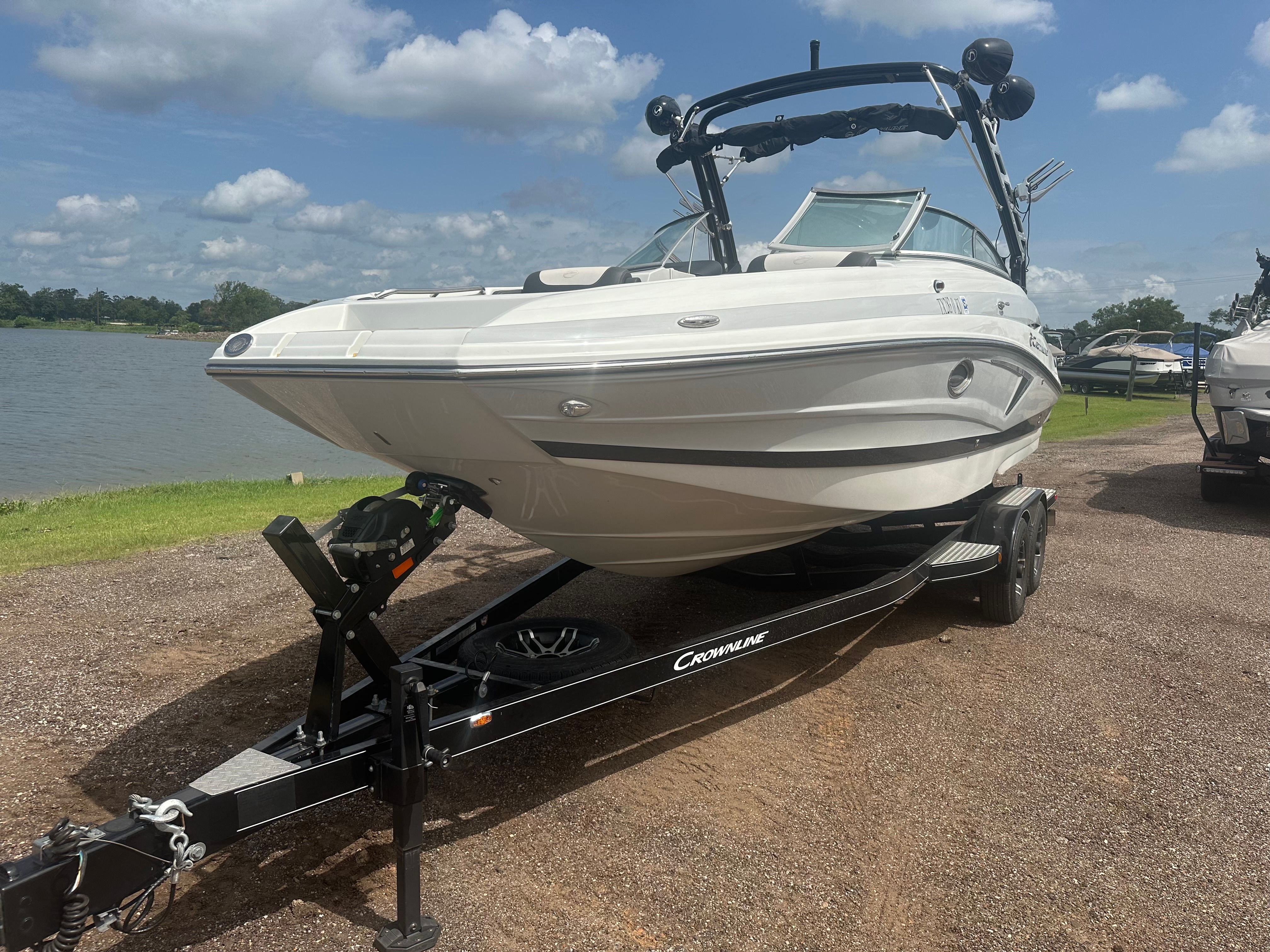 The Crownline E255 Surf is packed with features that enhance both performance and comfort. Its spacious Bowrider layout provides plenty of seating for guests, making it ideal for social gatherings and family outings. The ergonomic design ensures everyone on board can relax in style, while the open bow area is perfect for sunbathing or enjoying the breeze. The E255 Surf’s surf-ready capabilities make it a top choice for water sports enthusiasts, offering the perfect platform for wake surfing and other activities.This model’s attention to detail is evident in its high-quality materials and finishes. From the plush upholstery to the sleek dashboard, every aspect of the E255 Surf is crafted for durability and visual appeal. The intuitive helm station puts all controls within easy reach, allowing the captain to navigate with confidence and ease. With its generous length and smart layout, this Bowrider boat for sale offers plenty of room for coolers, water toys, and personal belongings, ensuring you’re always prepared for a day on the water.