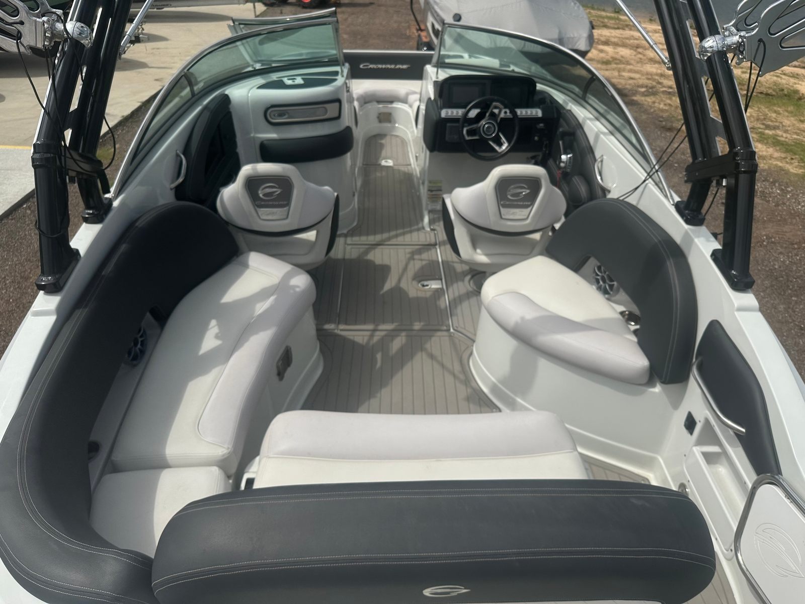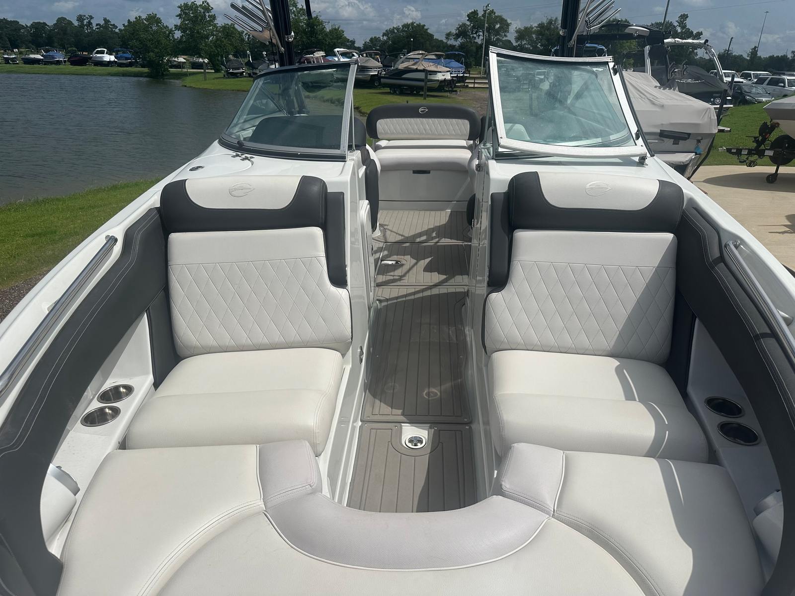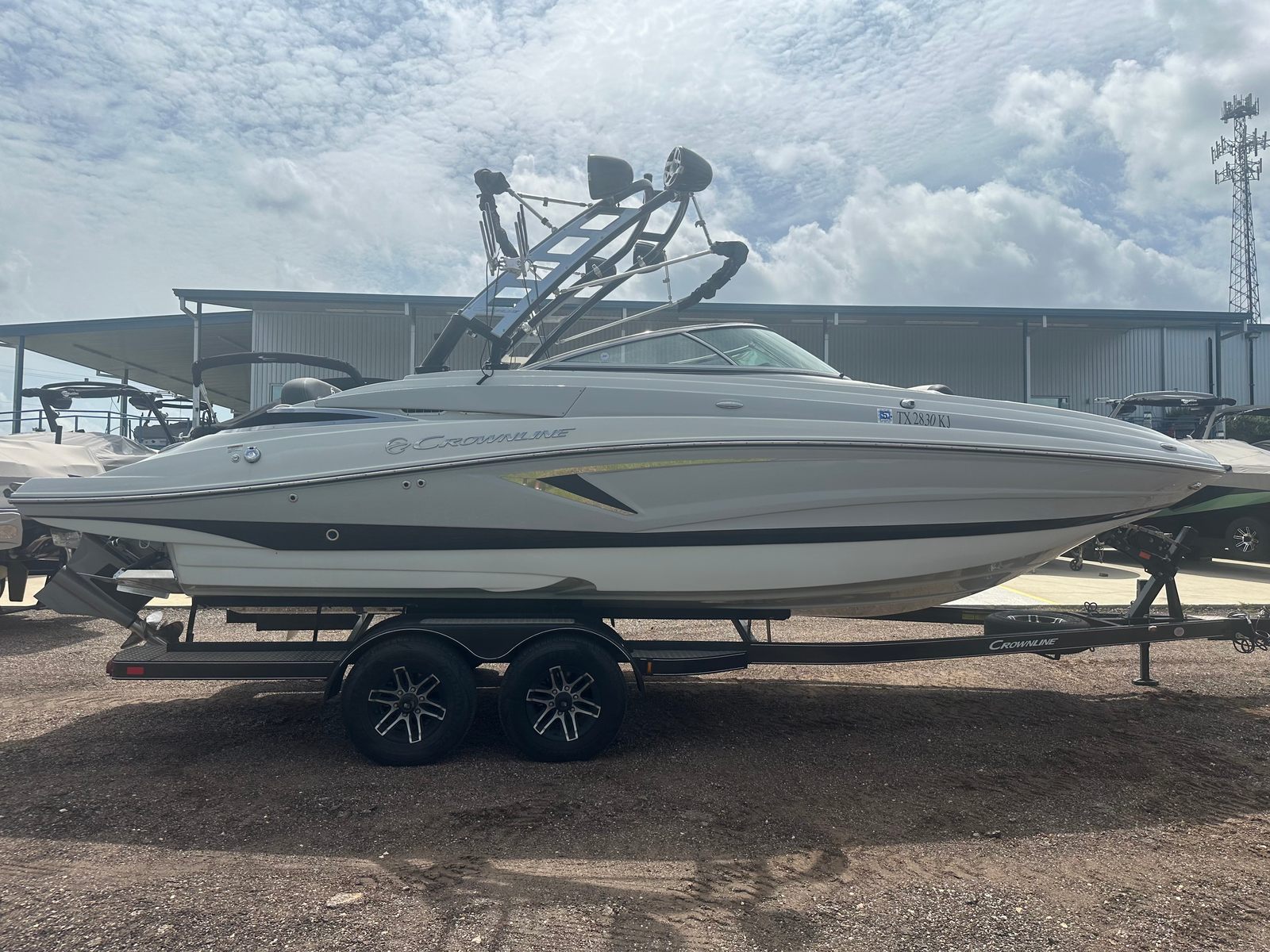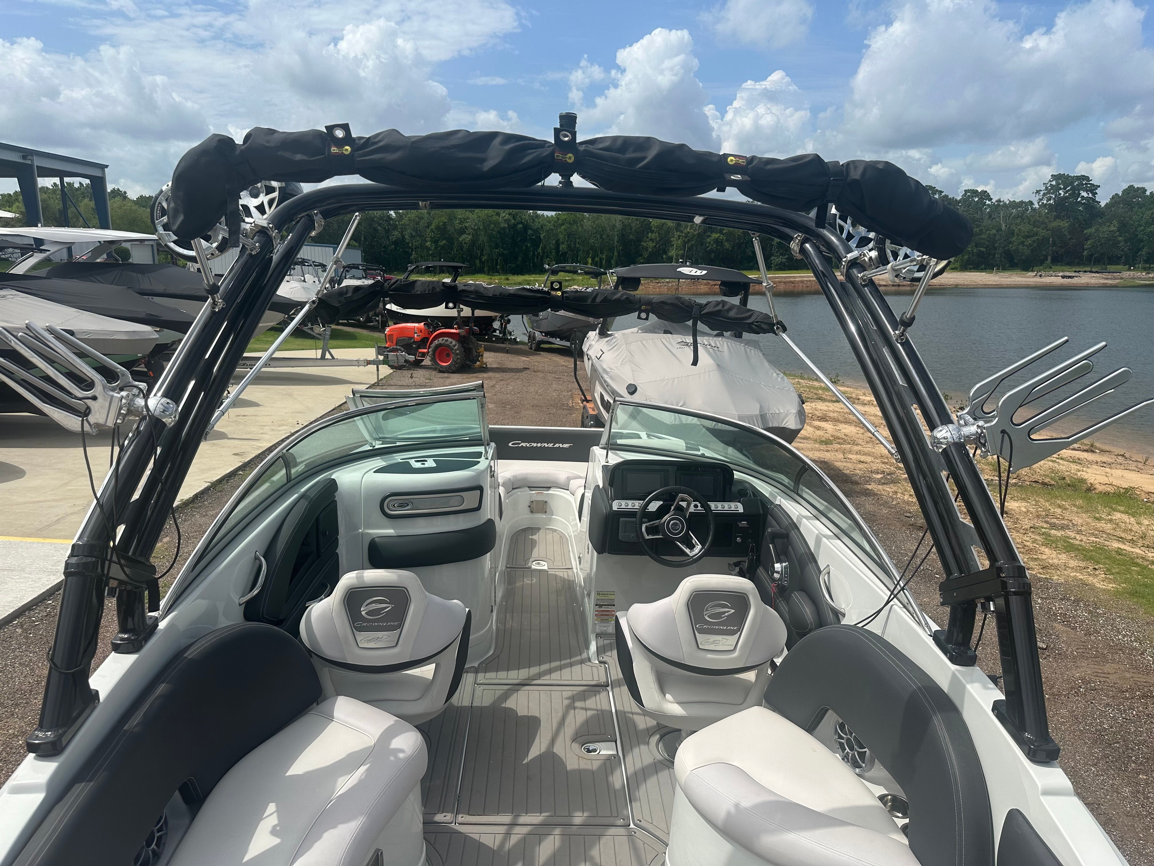 The Crownline E255 Surf is packed with features that enhance both performance and comfort. Its spacious Bowrider layout provides plenty of seating for guests, making it ideal for social gatherings and family outings. The ergonomic design ensures everyone on board can relax in style, while the open bow area is perfect for sunbathing or enjoying the breeze. The E255 Surf’s surf-ready capabilities make it a top choice for water sports enthusiasts, offering the perfect platform for wake surfing and other activities.This model’s attention to detail is evident in its high-quality materials and finishes. From the plush upholstery to the sleek dashboard, every aspect of the E255 Surf is crafted for durability and visual appeal. The intuitive helm station puts all controls within easy reach, allowing the captain to navigate with confidence and ease. With its generous length and smart layout, this Bowrider boat for sale offers plenty of room for coolers, water toys, and personal belongings, ensuring you’re always prepared for a day on the water.