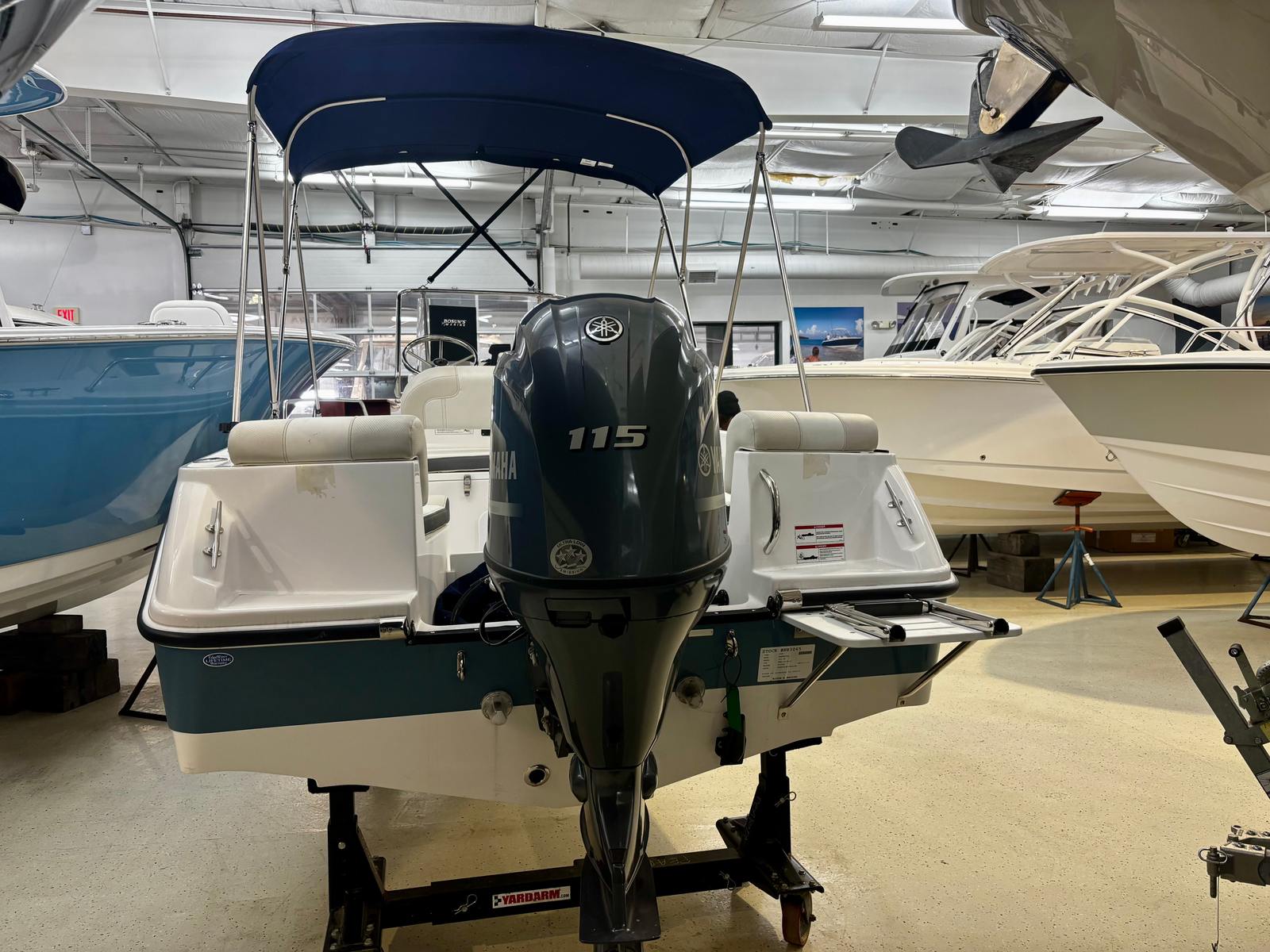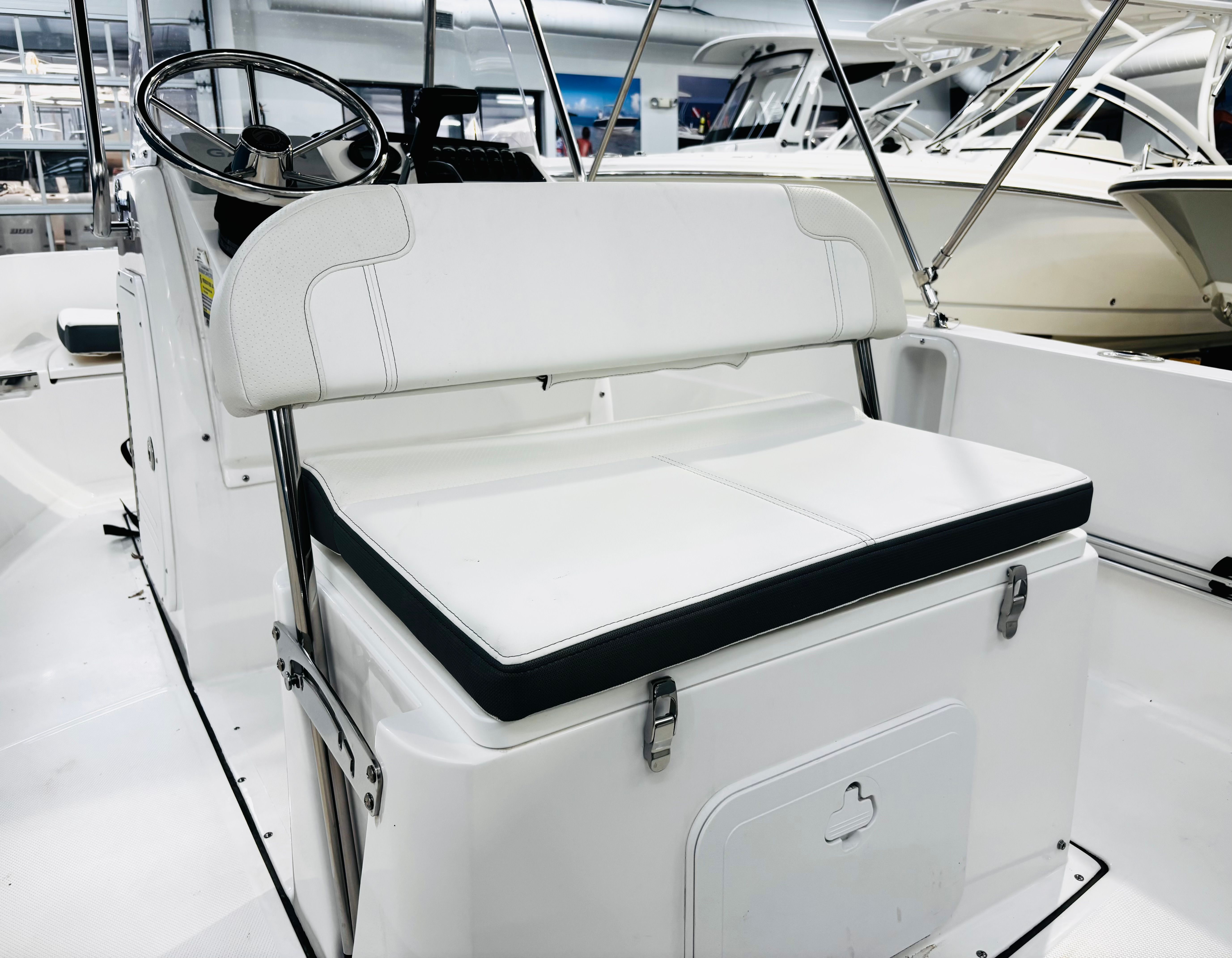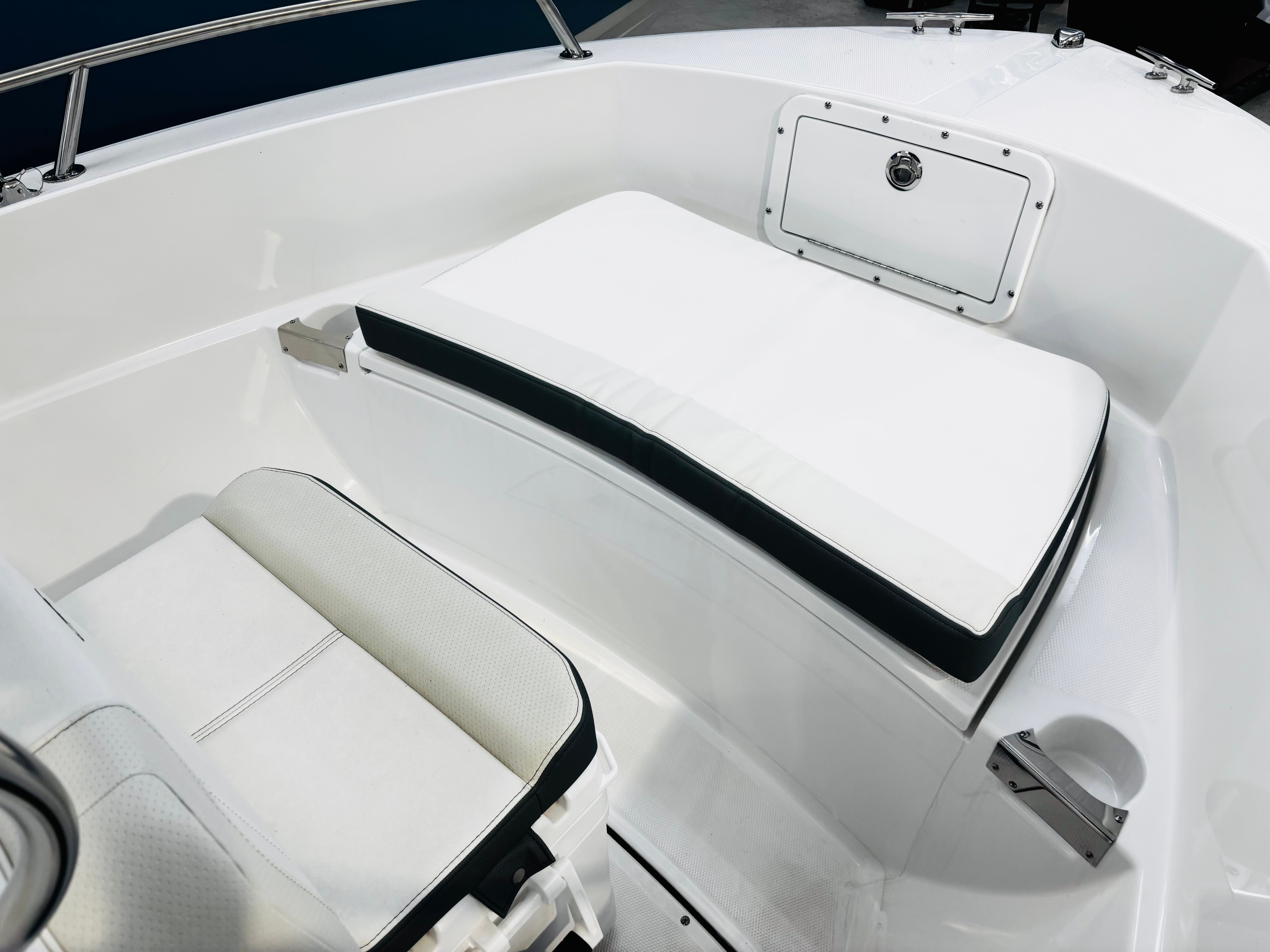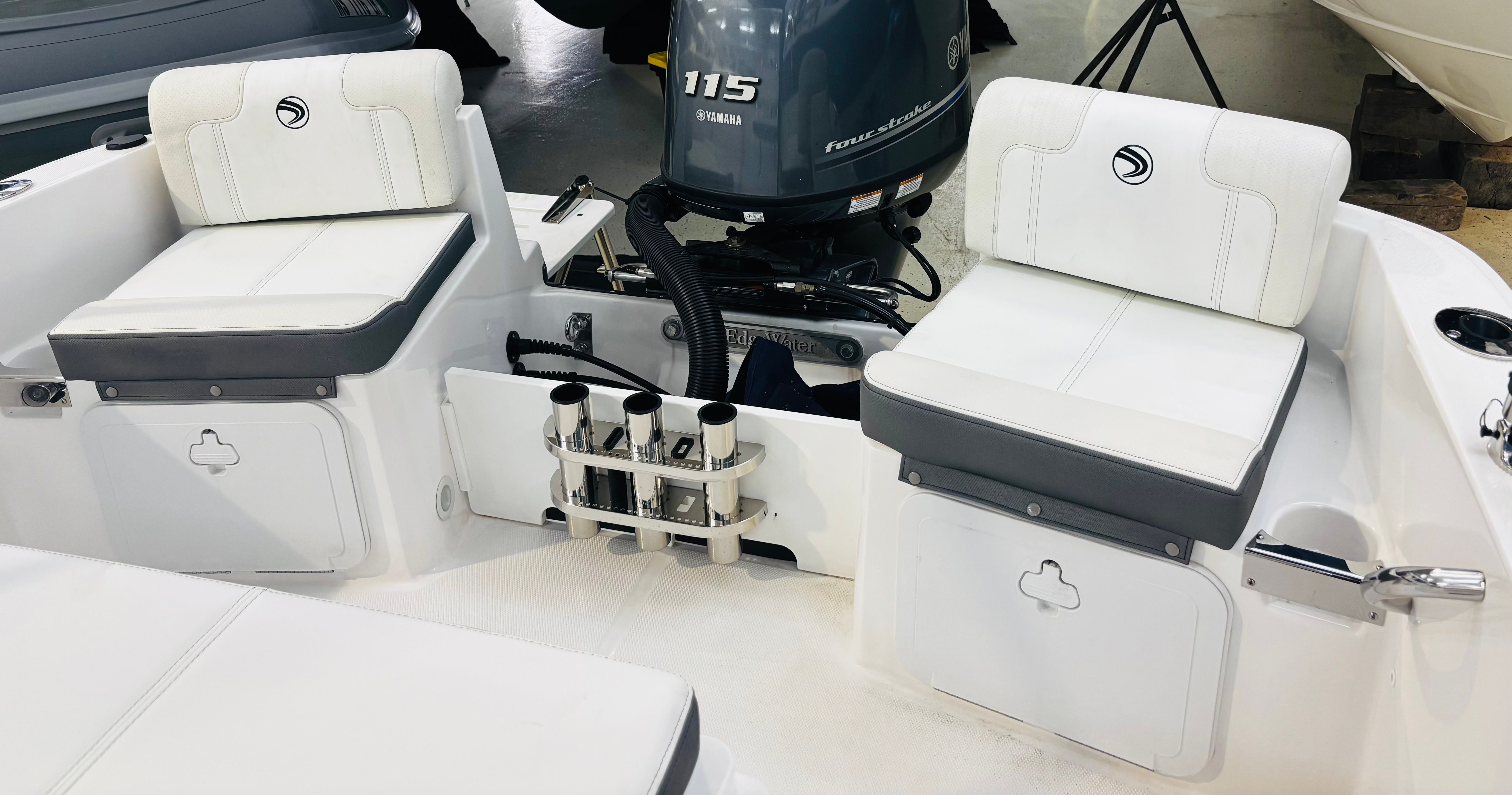 The Edgewater 170 CC comes loaded with special features that set it apart from other center console boats for sale. The eye-catching Stars & Stripes Blue hull sides with a white hull bottom not only enhance its visual appeal but also reflect Edgewater’s commitment to quality and style. White accent cushions provide a fresh, modern look while ensuring comfort for you and your guests.For navigation and fish finding, the Garmin EchoMap UHD2 74CV with GT20 XDCR transducer offers advanced chart plotting and sonar capabilities, making it easier to locate fish and navigate unfamiliar waters. The windshield with stainless steel console rail adds both protection and durability, while the sun top with stainless steel bows and navy canvas provides much-needed shade on sunny days. The navy helm face cover and navy leaning post seating cover help protect your boat’s interior from the elements, ensuring it stays looking new for years to come.Fishing enthusiasts will appreciate the Fishing Package 170CC, which includes a 17-gallon recirculating baitwell, raw water washdown, extra gunwale rod holders, and a console rod rack. These features make it easy to keep your gear organized and your catch fresh. The Make Ready 170CC package, featuring two batteries and oil installed, ensures your boat is ready to hit the water as soon as you are.