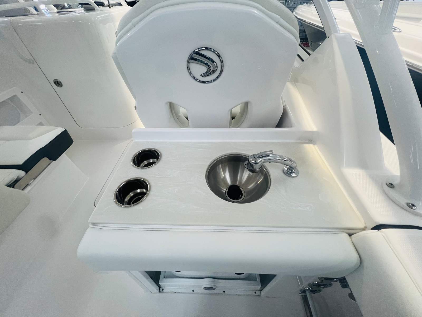 The Edgewater 248 CX is designed with practicality in mind, making ownership as enjoyable as it is effortless. The stainless steel rubrail and robust construction provide peace of mind during docking and close-quarters maneuvering. The efficient Yamaha engine not only delivers impressive power but also helps keep fuel costs in check, allowing you to spend more time on the water and less time at the pump.The prep station with its integrated sink, storage, and cutting board streamlines meal preparation and cleanup, while the premium cooler ensures your drinks and snacks stay cold all day long. The hardtop offers shade and protection, making it comfortable to spend hours on the water, even during the hottest summer days. With dedicated rod holders and ample storage, anglers will appreciate the convenience and organization this dual console boat provides.