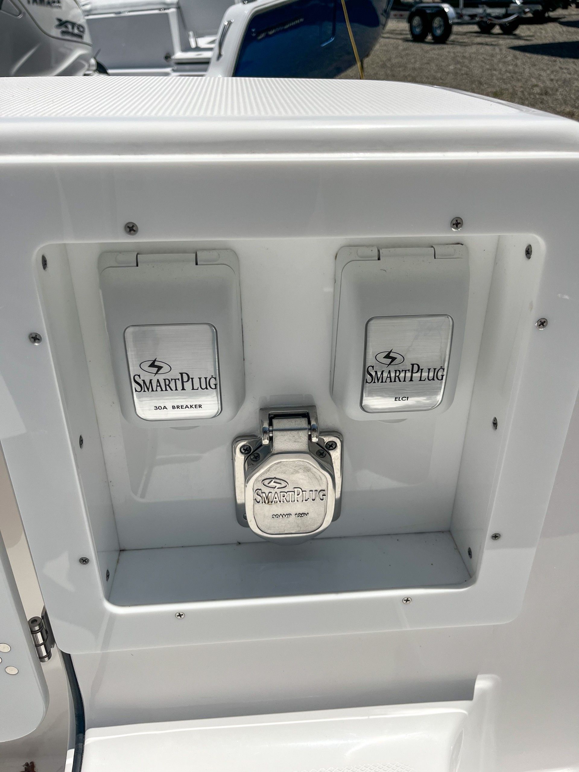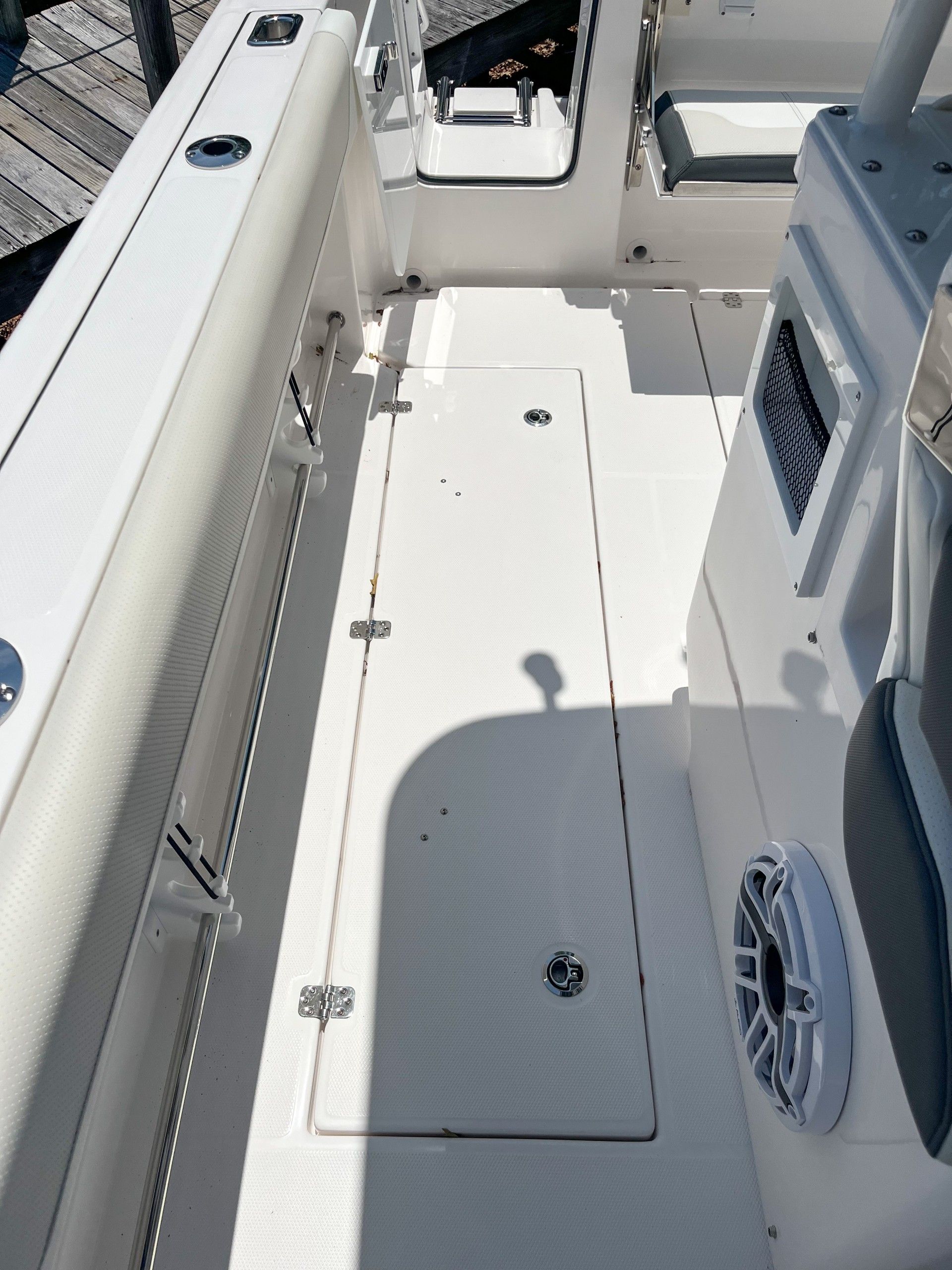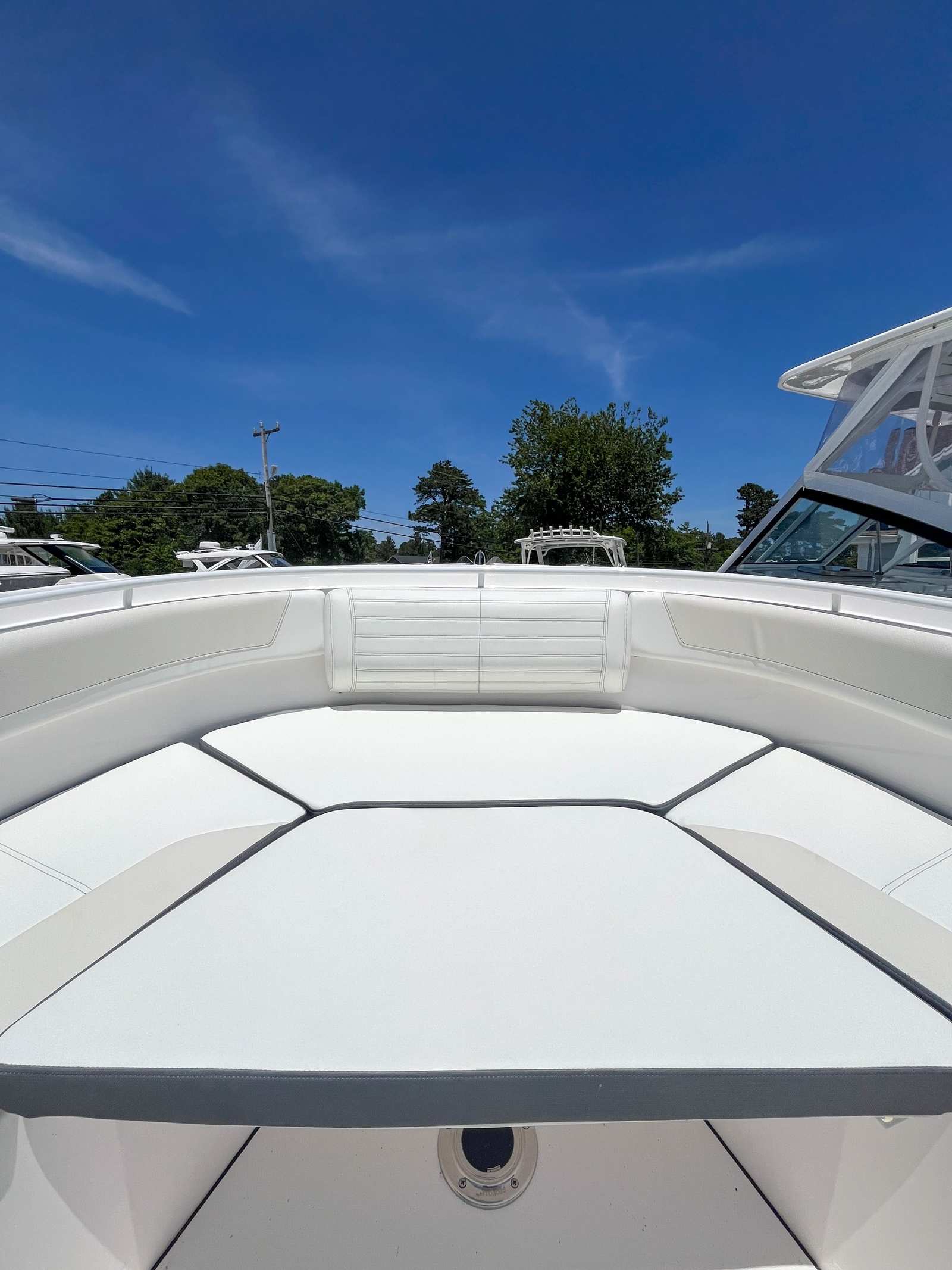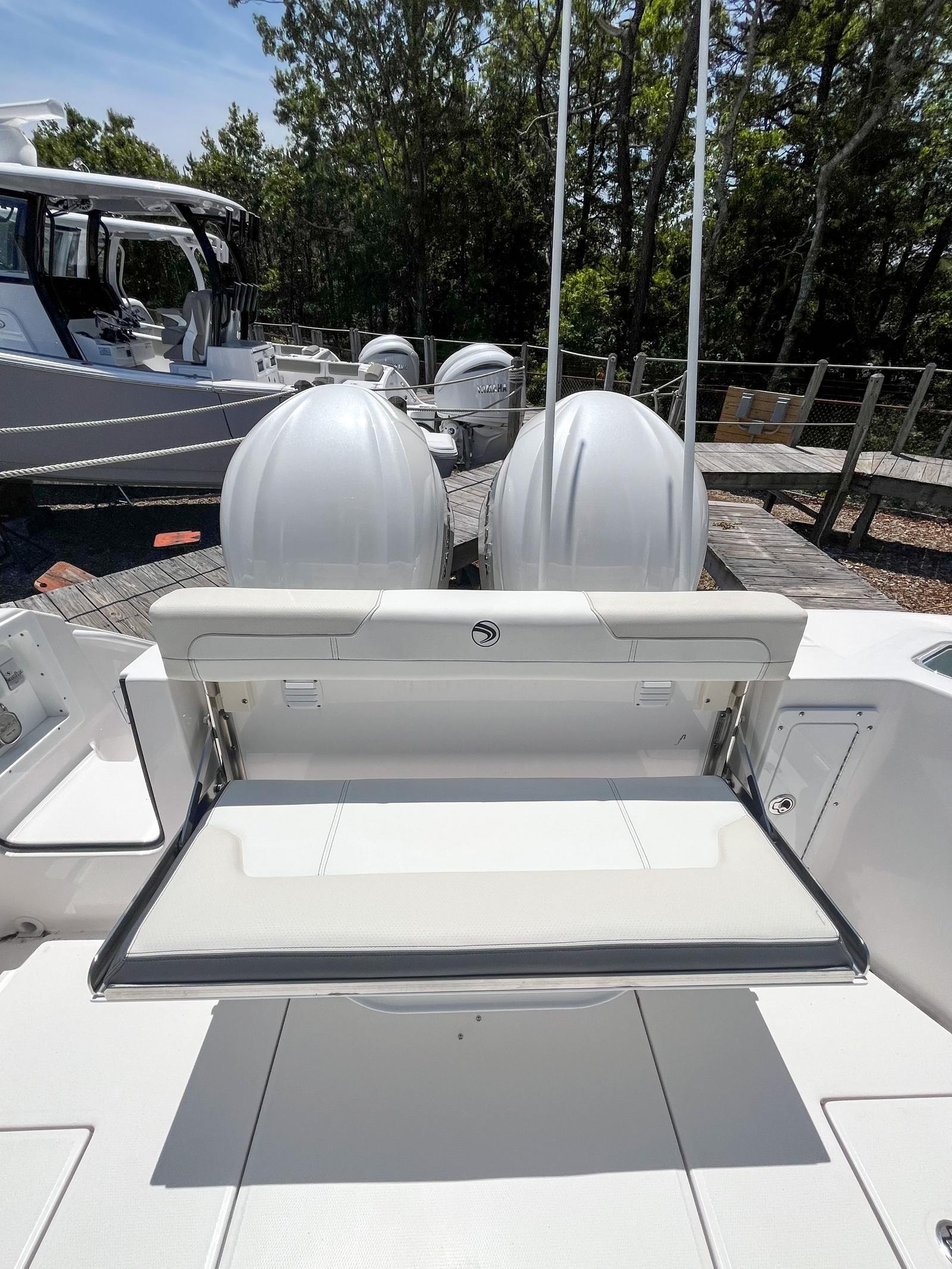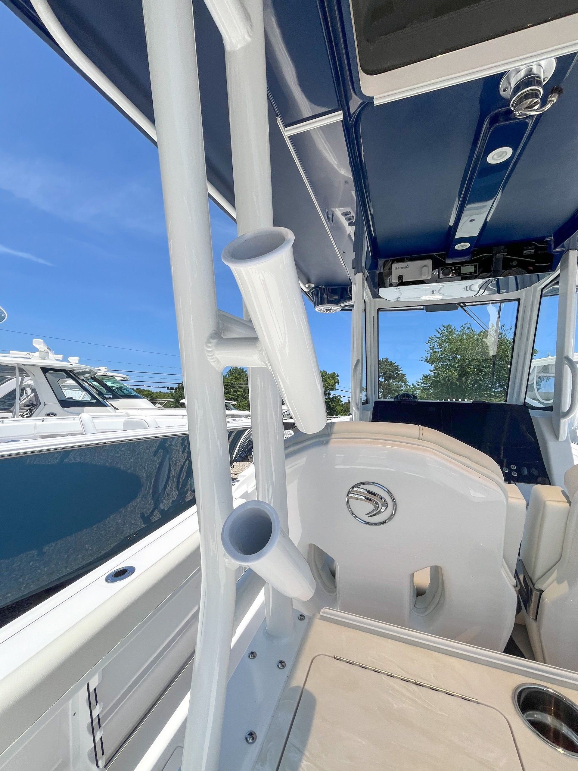 This Edgewater boat for sale is loaded with premium features designed to elevate your time on the water. The color-matched hardtop underside in Midnight Blue not only adds a touch of sophistication but also provides shade and protection from the elements. The prep station is thoughtfully equipped with top-side storage, a fresh water stainless steel sink, five storage drawers, and a waste basket, making it easy to prepare bait, snacks, or meals while keeping everything organized. The helm is a true command center, featuring dual Garmin 8616 displays with a B175H transducer for superior navigation and fish-finding capabilities. Communication is seamless with the VHF 215 radio, antenna, and remote mic, ensuring you stay connected wherever your journey takes you. The Garmin Radar Fantom 54 Open Array provides advanced radar functionality for enhanced safety and situational awareness. Additional highlights include a white rub rail with a stainless-steel insert for added durability and style, a navy helm face cover to protect your electronics, and white accent cushions that offer both comfort and elegance.