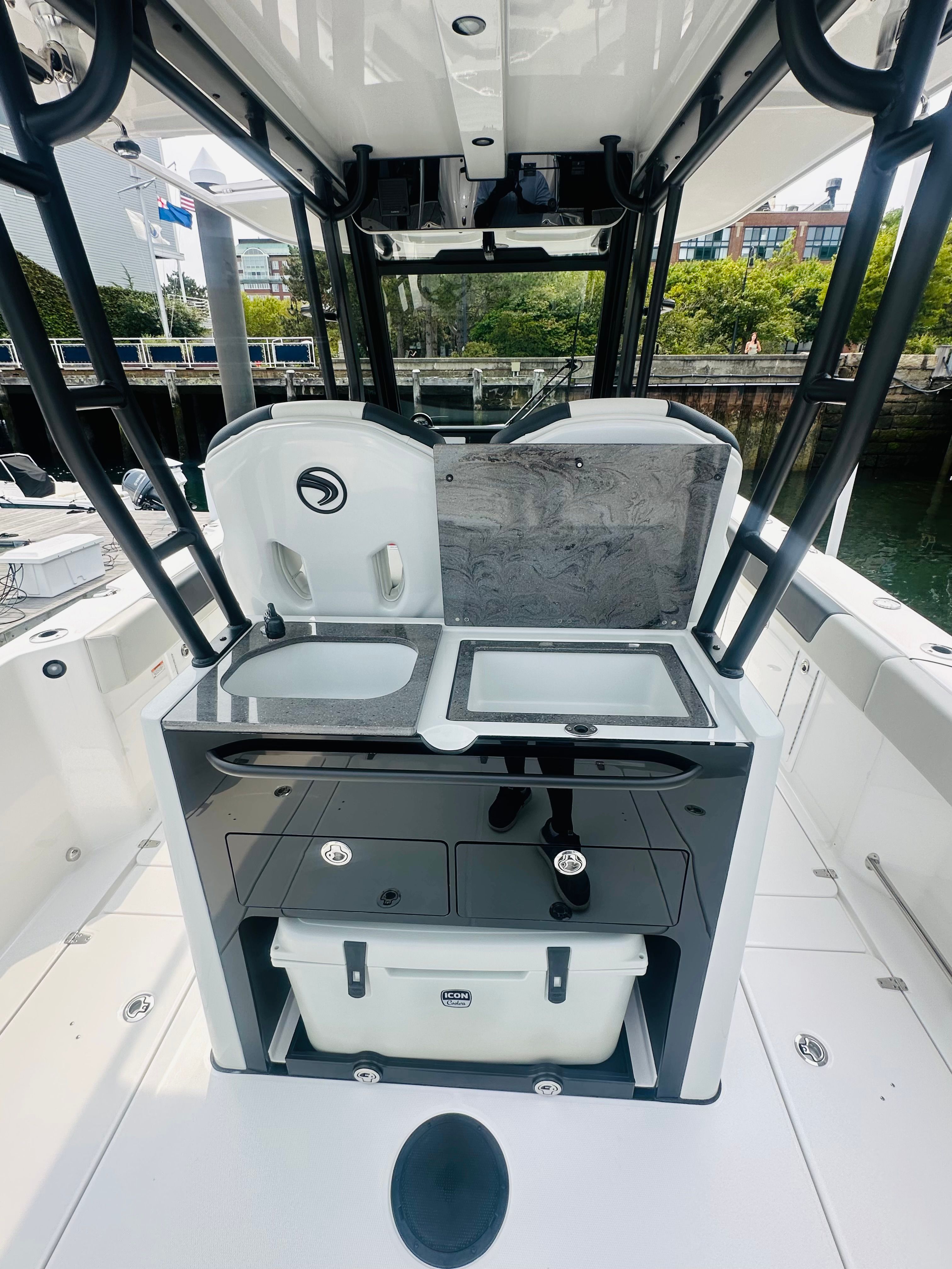 Practicality is at the heart of the Edgewater 340 CC’s design. The generous storage options, including drawers and compartments, keep your gear organized and accessible. The slide-out cooler is perfect for keeping drinks and snacks chilled, while the sink with pull-out faucet adds convenience for cleaning up after meals or rinsing off equipment.Docking and maneuvering are simplified by the boat’s responsive controls and dual engines, making it easy to handle in marinas or tight spaces. The efficient layout ensures that everything you need is within reach, reducing clutter and maximizing enjoyment. Fuel efficiency is enhanced by the modern engine technology, allowing you to spend more time on the water and less time refueling.