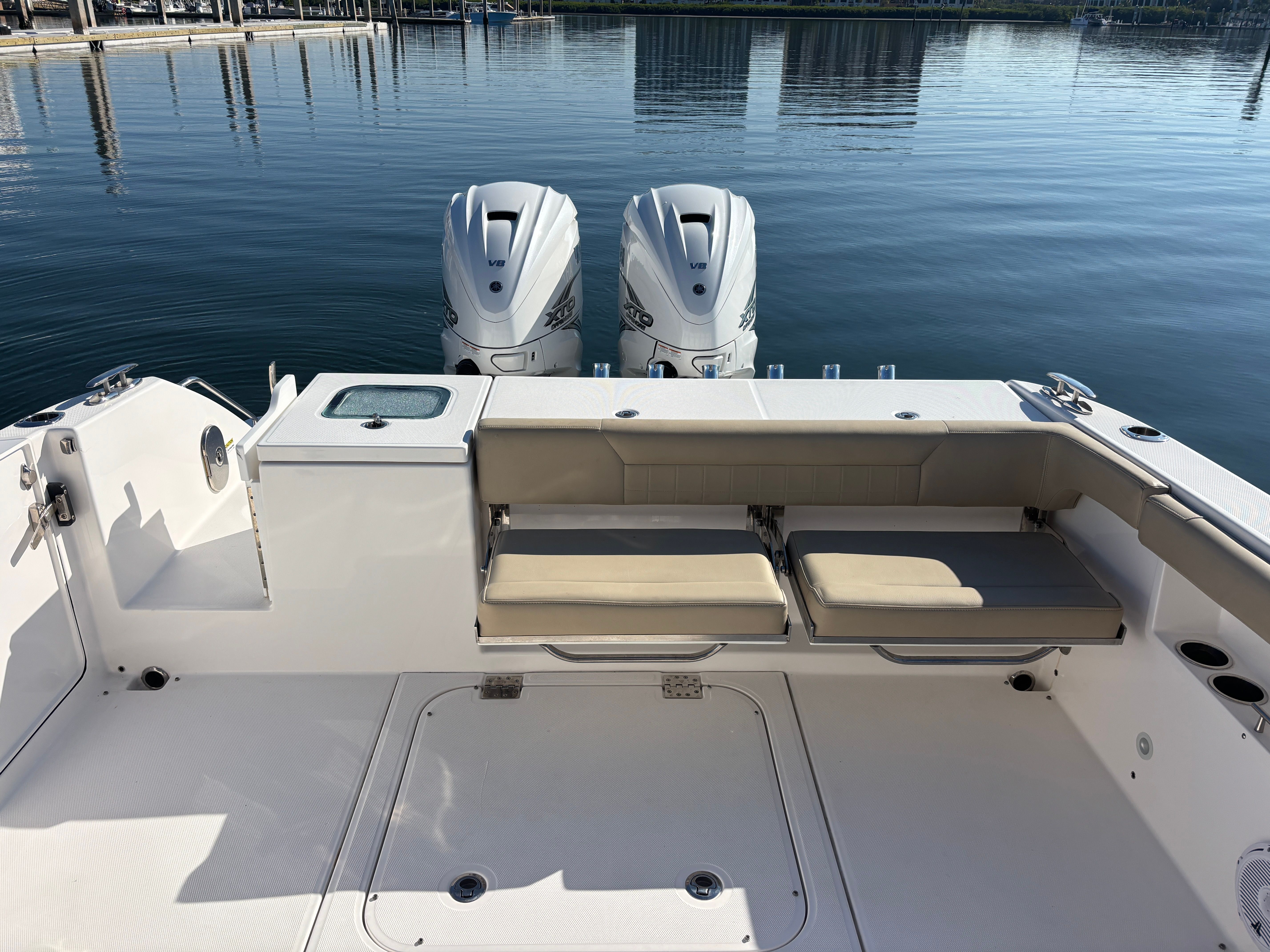 •Bow lounge with built in insulated cooler and removable table •Walk through transom door