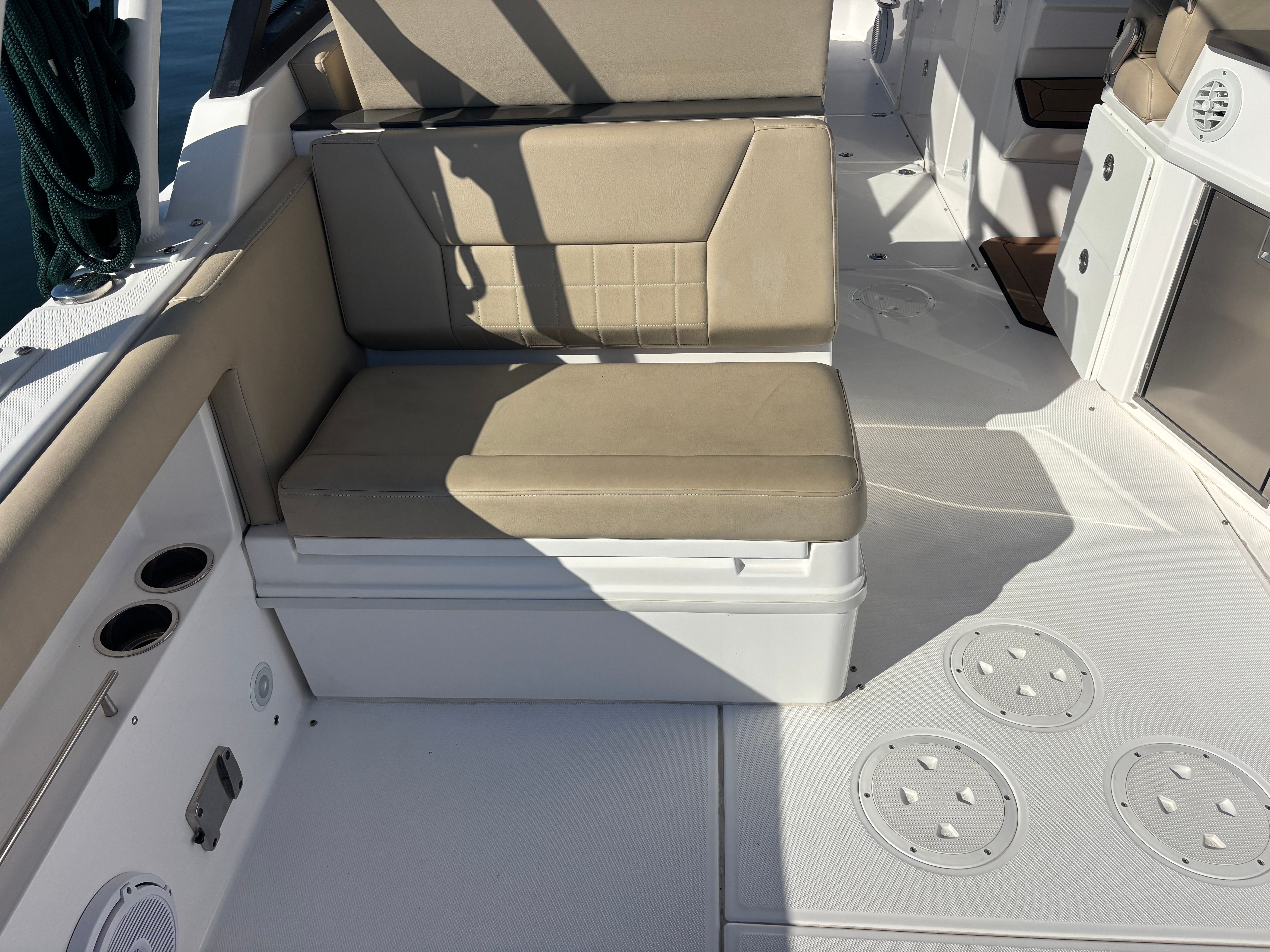 •Bow seating with FWD facing lounge cushions and backrests •Double wide helm seat to stbd