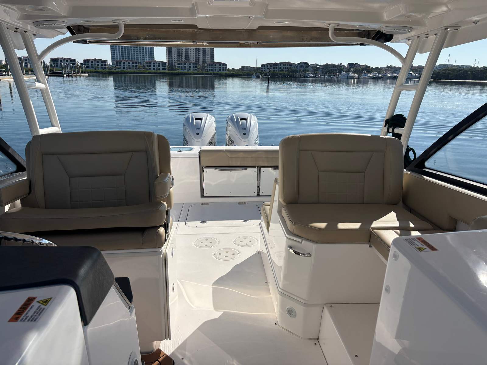•Fiberglass hardtop with powder-coated aft legs, includes LED lights, spreader lights, radio box and speakers