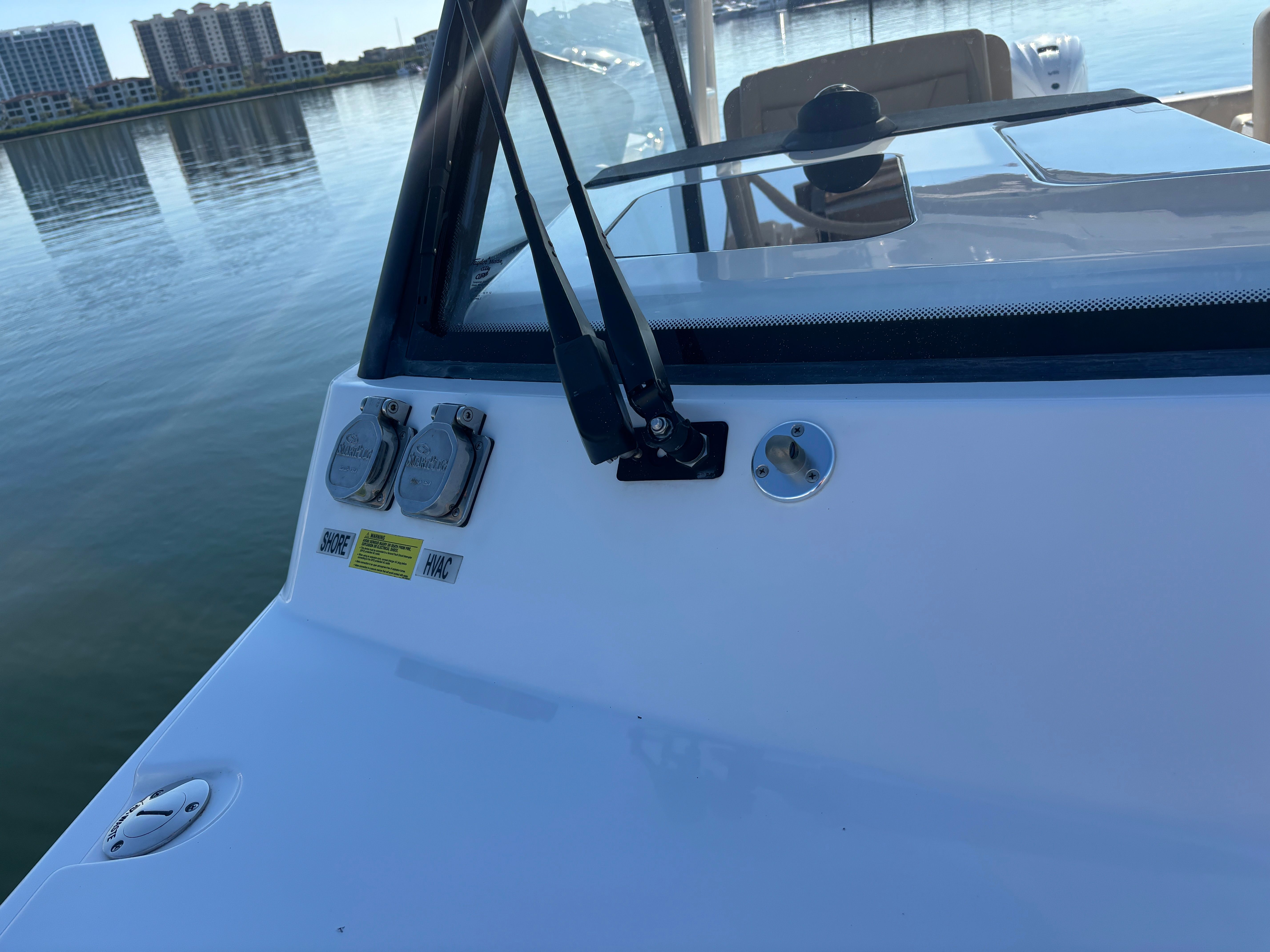 •Tempered glass windshield with powered center sliding panel and wiper and washer system at helm