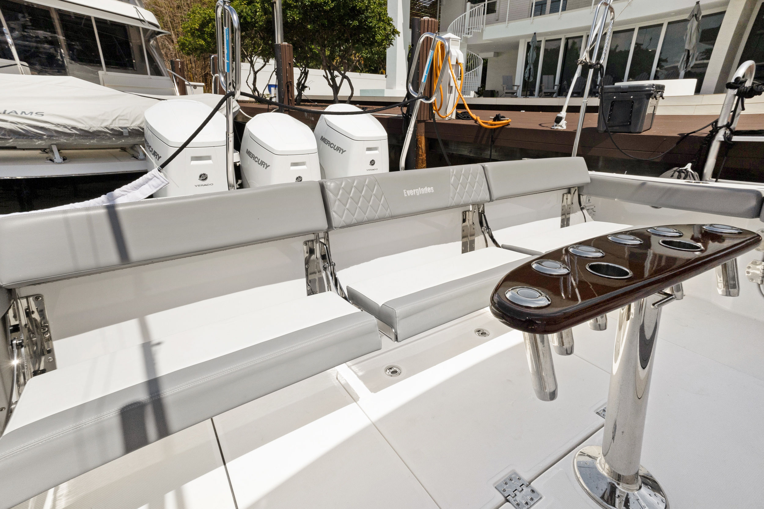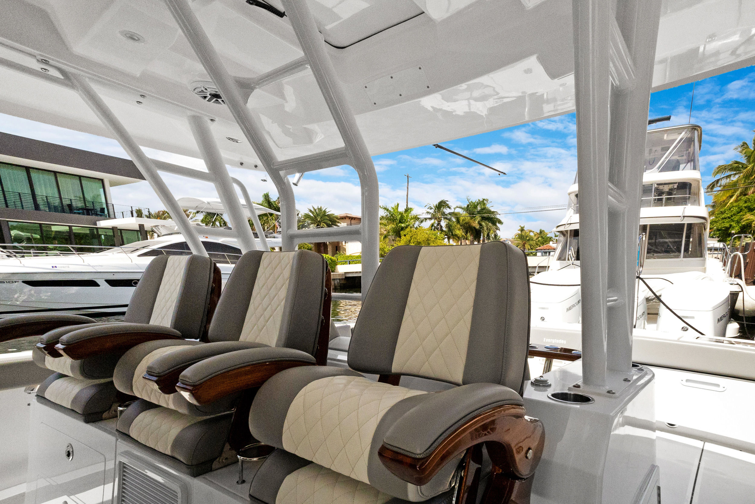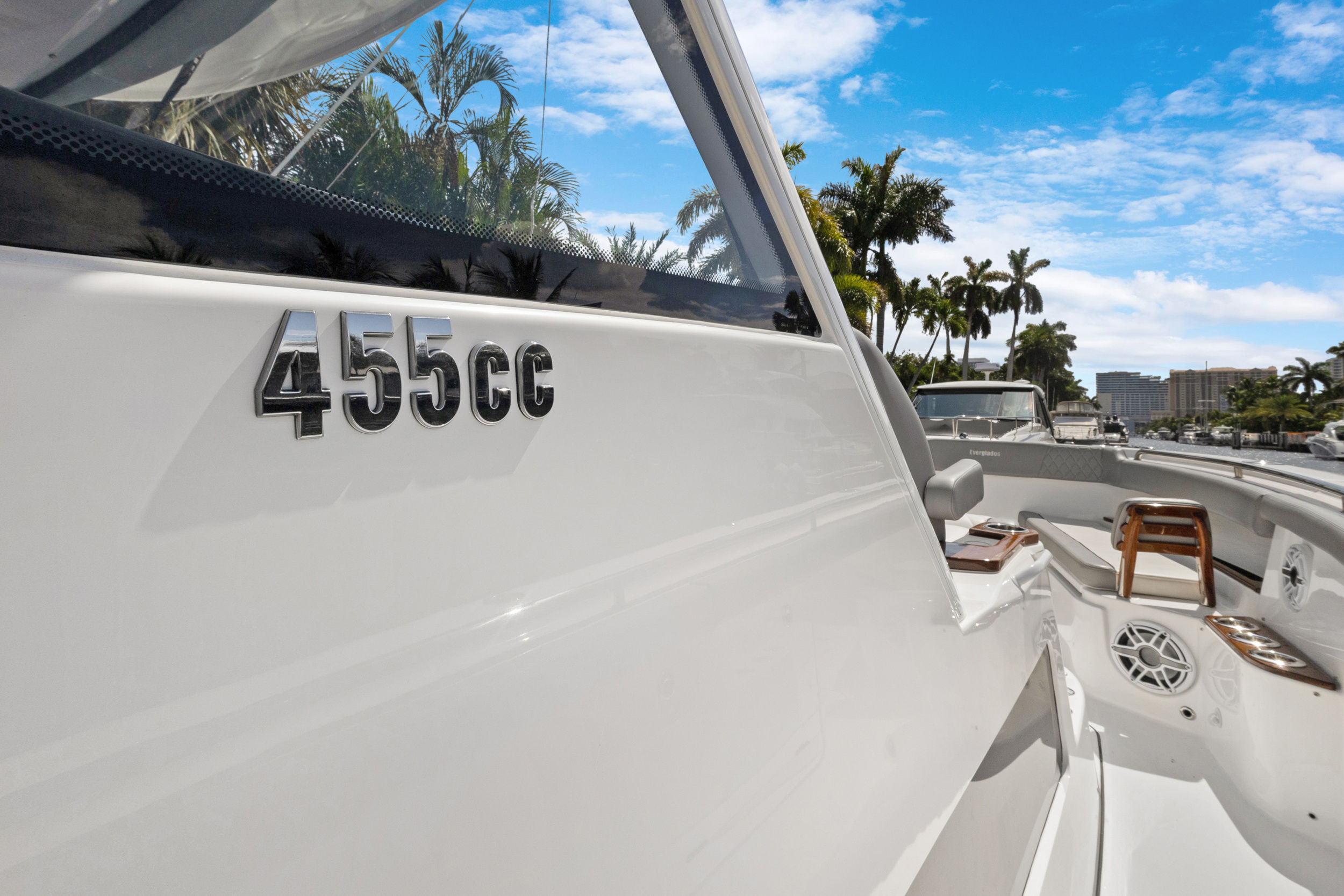 At the heart of the Everglades 455 CC are three powerful engines, delivering a combined 1800 horsepower. This impressive setup ensures exhilarating speed, smooth acceleration, and the ability to handle a variety of sea conditions with confidence. Whether you are cruising to your favorite fishing spot, island hopping, or simply enjoying a day on the water, the 455 CC’s triple-engine configuration provides the reliability and performance that serious boaters demand. The advanced hull design enhances stability and maneuverability, allowing you to navigate with ease and precision.