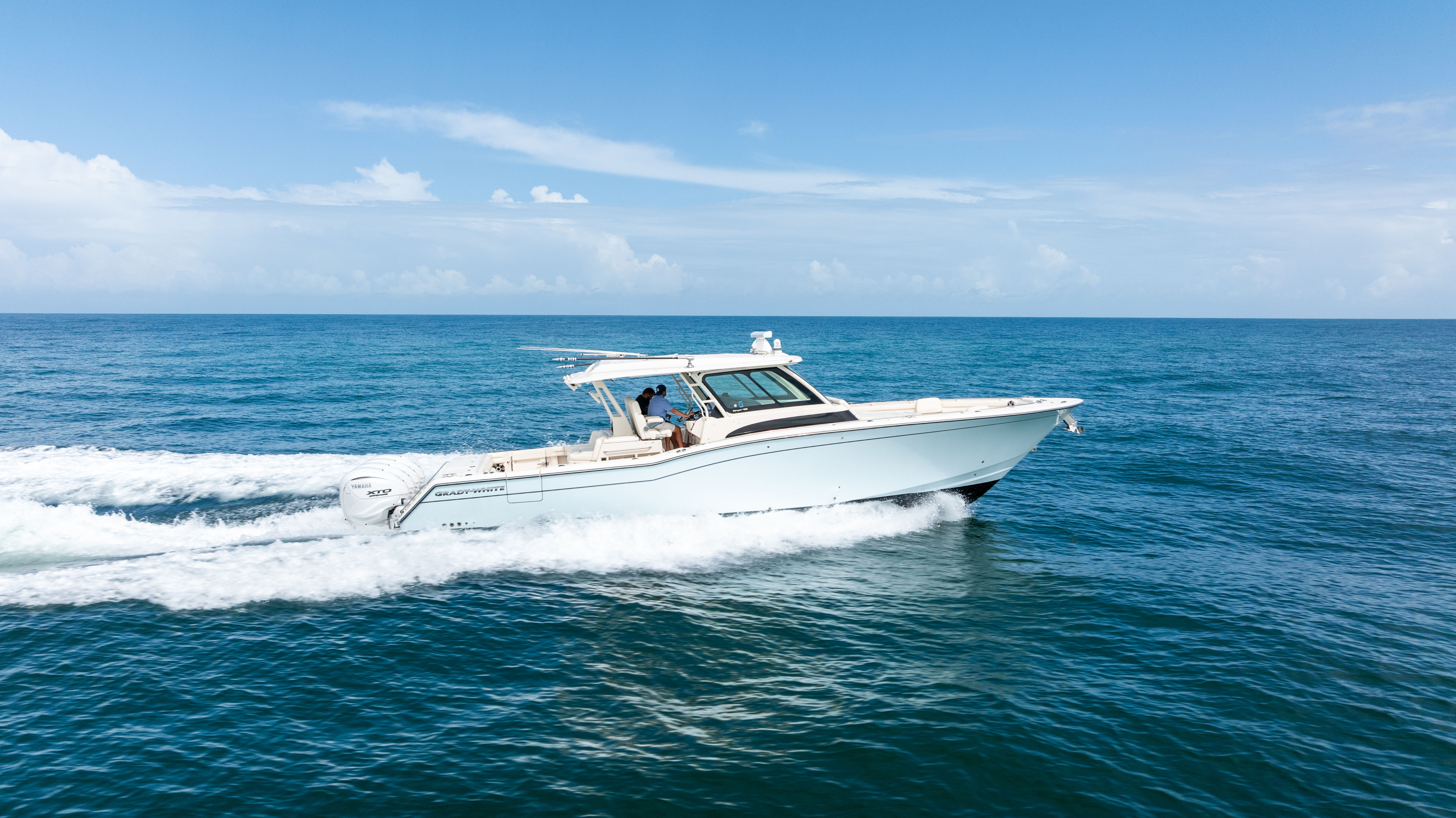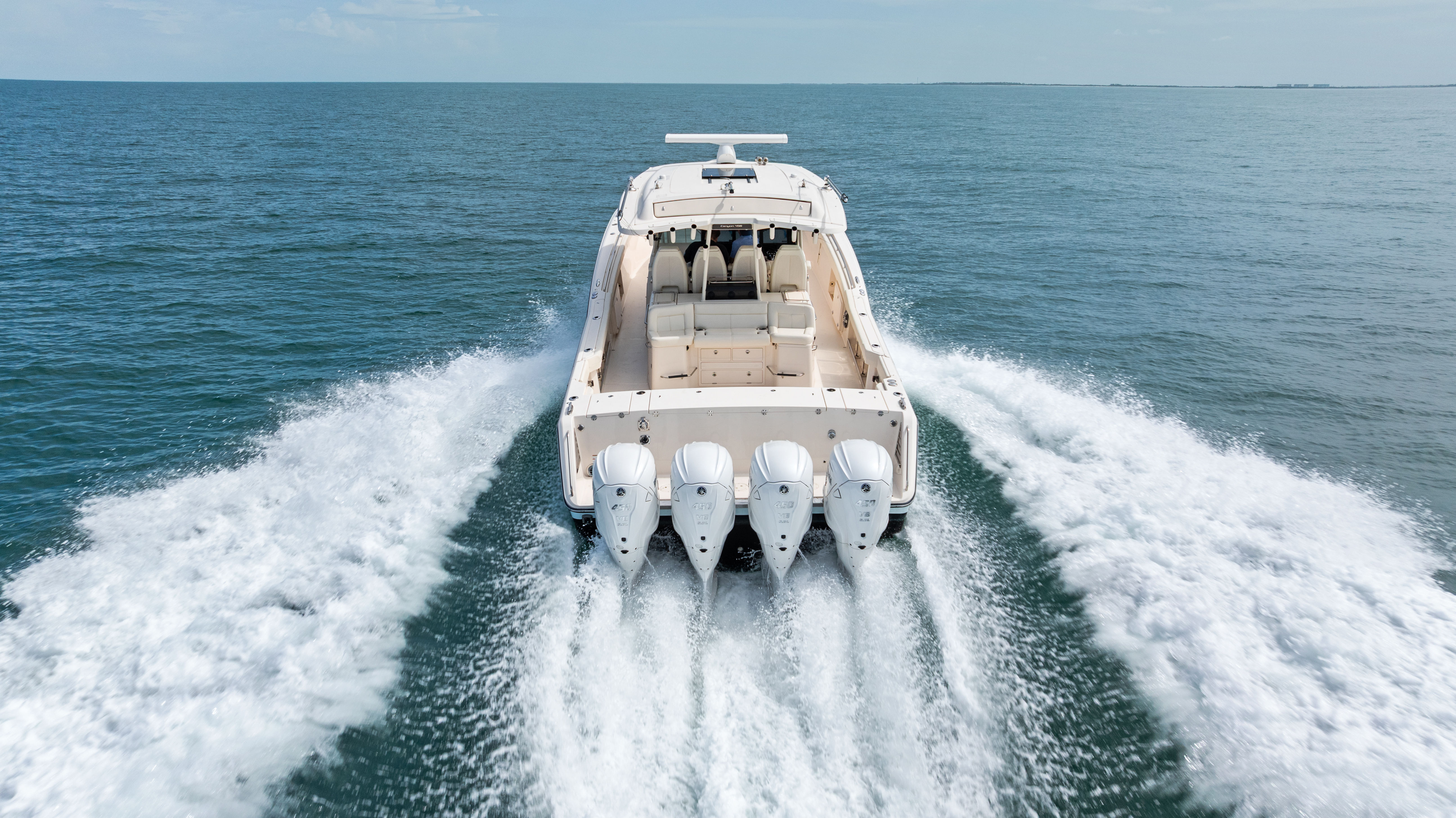 Topside, enjoy dual-zone air conditioning, premium seating with fold-away aft bench, an electric bow table, and an integrated retractable cockpit shade for ultimate comfort while entertaining or relaxing.