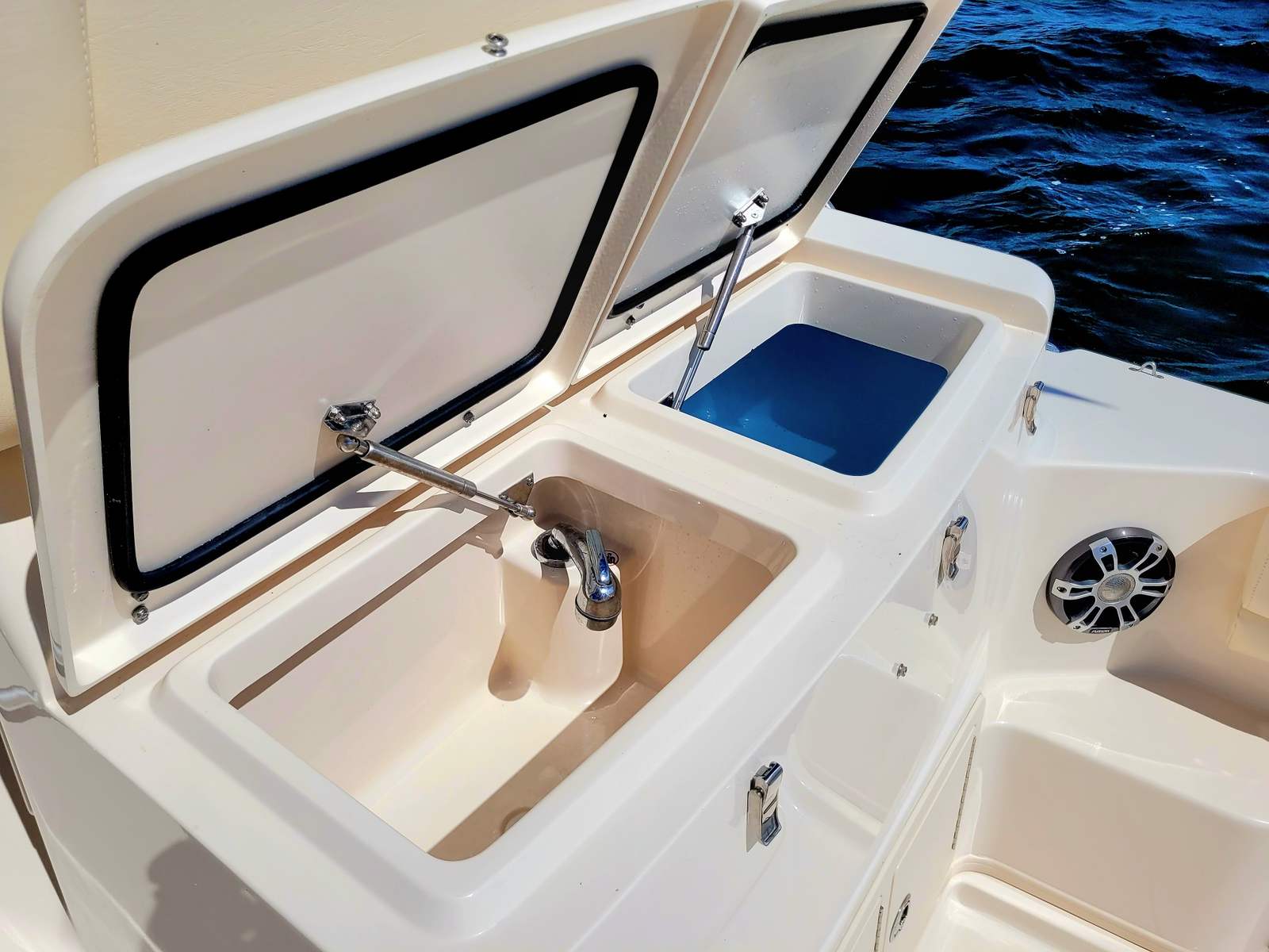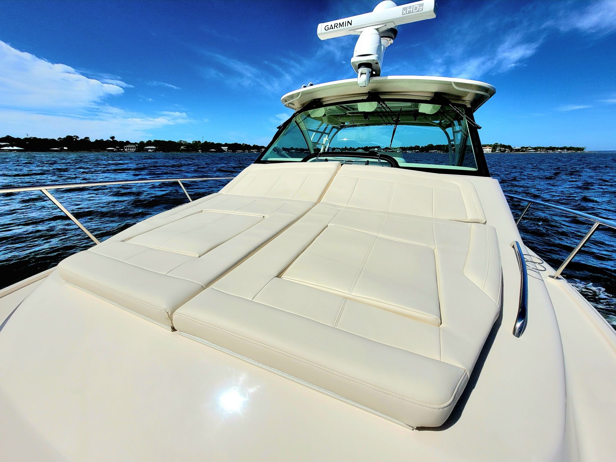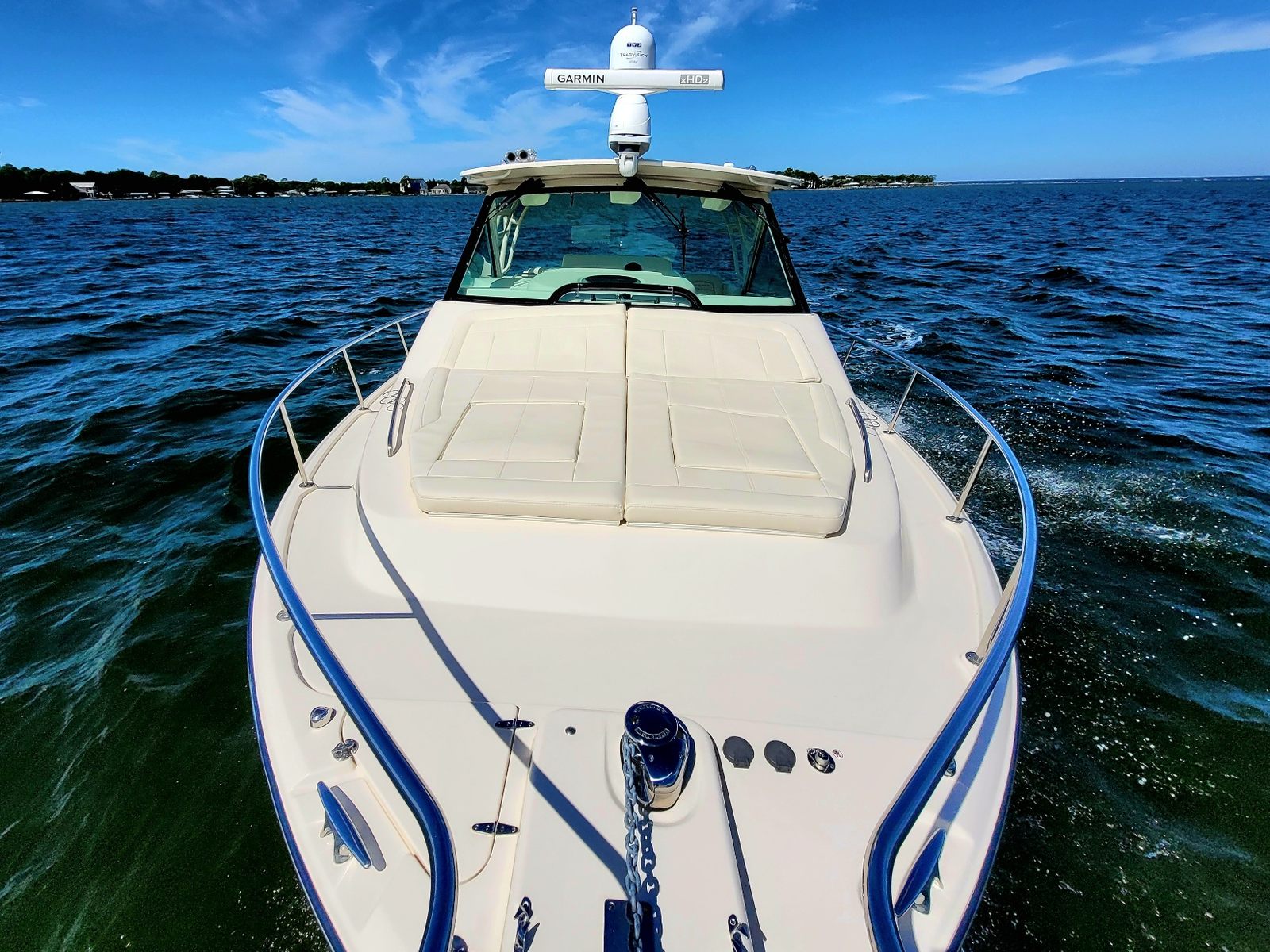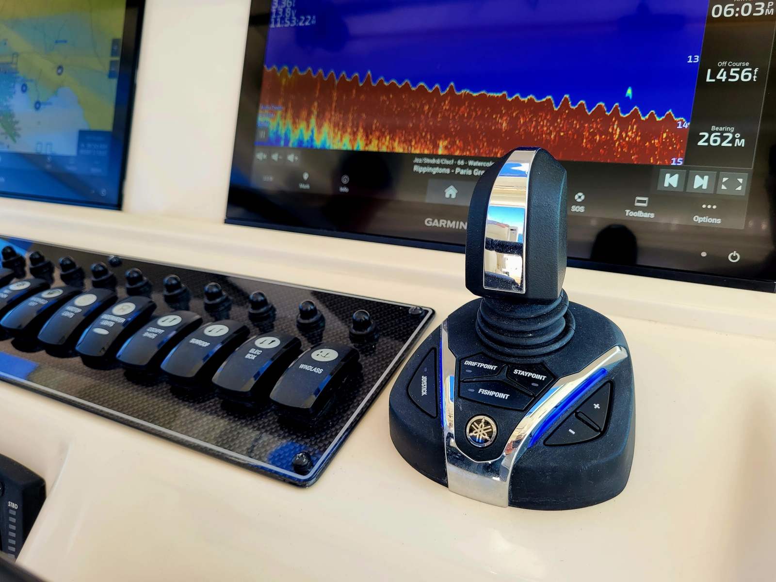 This model truly does do it all, its generous 13'2" beam affords an expansive cockpit and well appointed Helm area with extensive electronics including Garmin MFD's, Sea Keeper 5 Gyro, FLIR infra red camera and Tracvision Sat TV and Radar. Down below a grand cabin complete with galley to port and a convertible dinette area and enclosed head starboard. Then aft is a comfortable cabin. Options include: