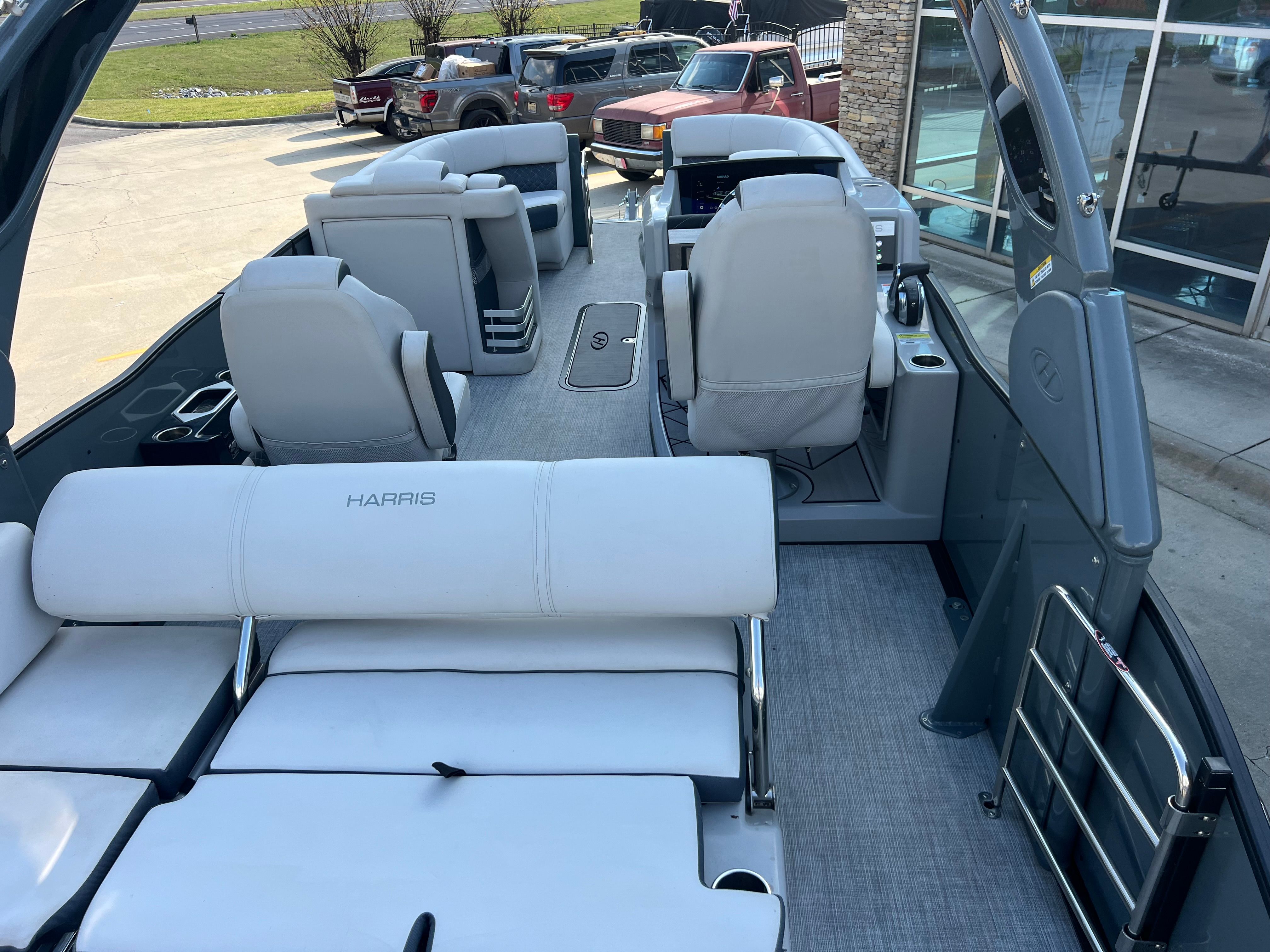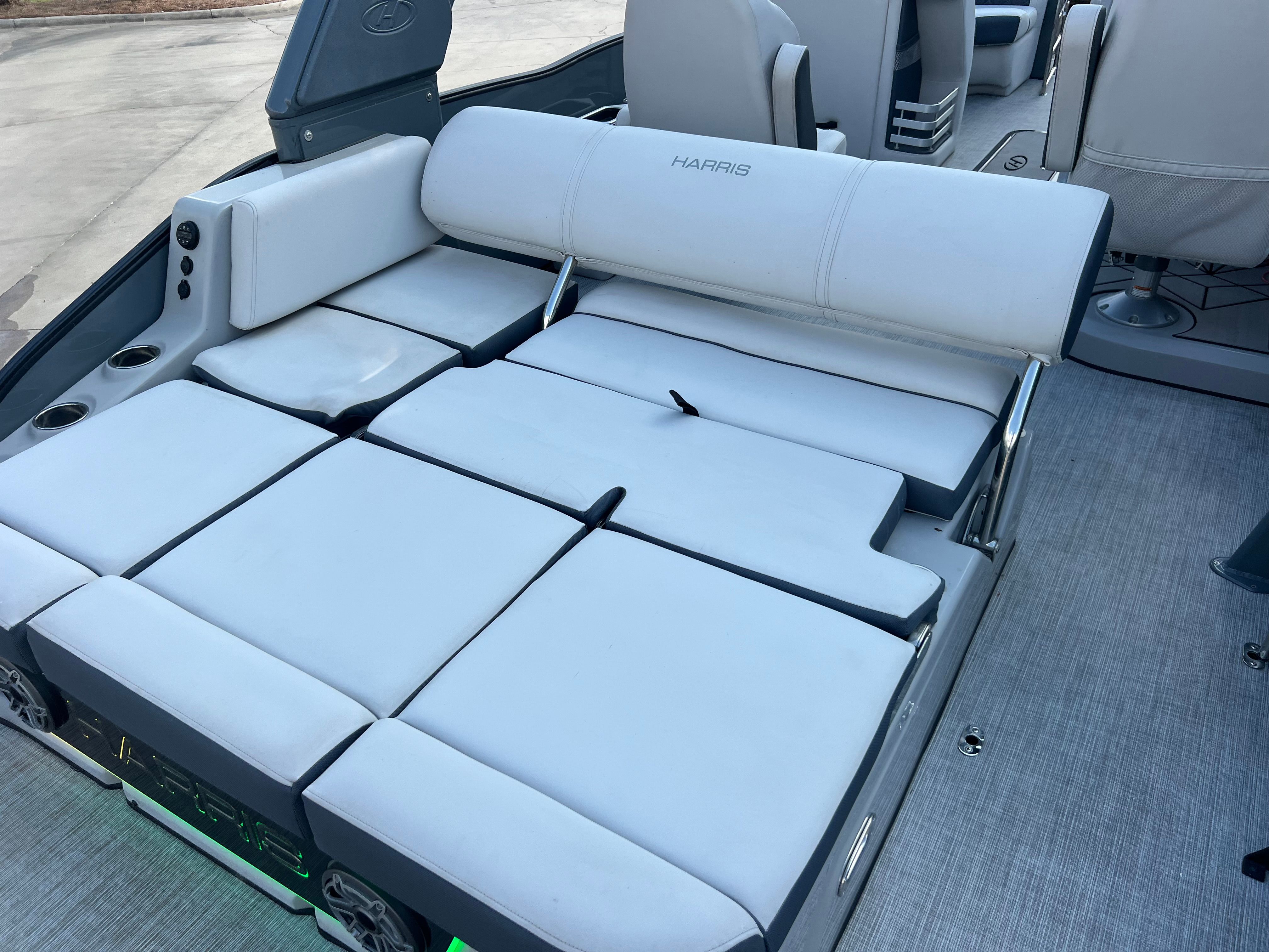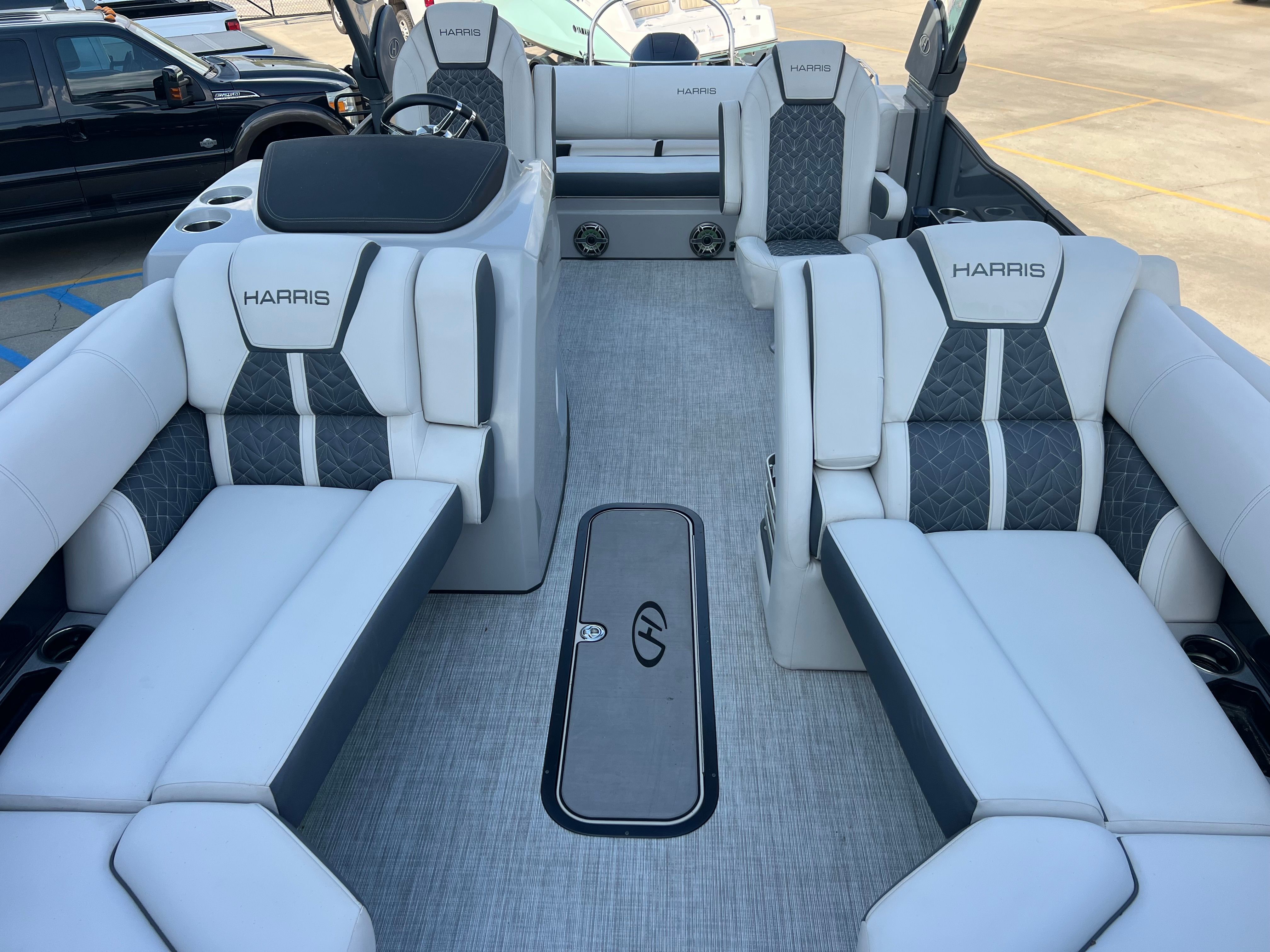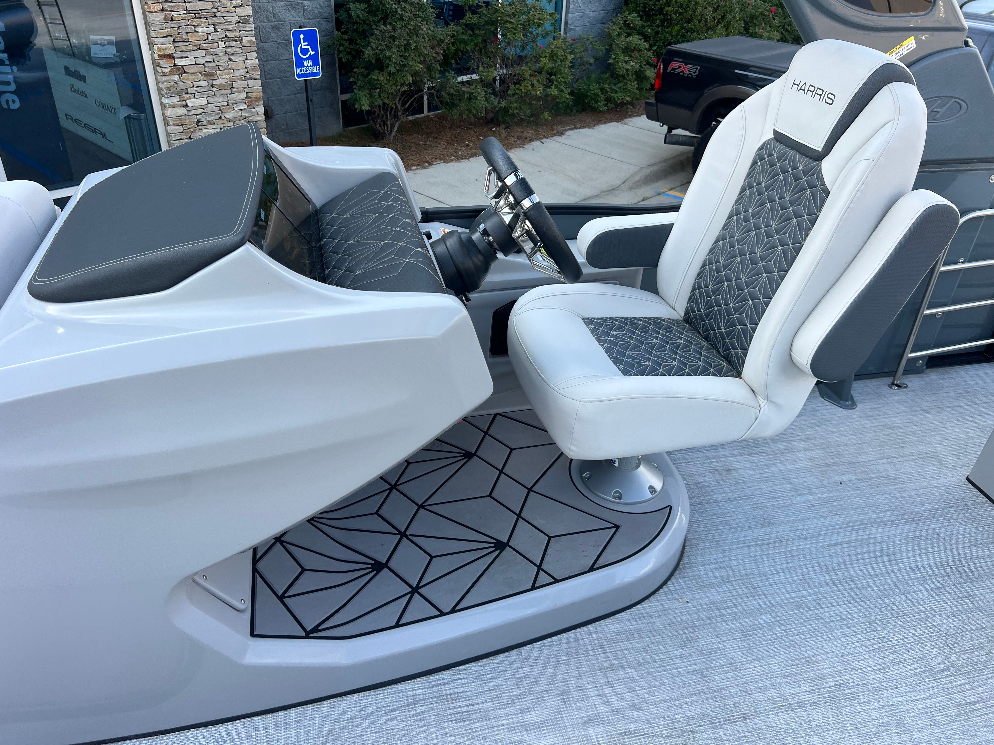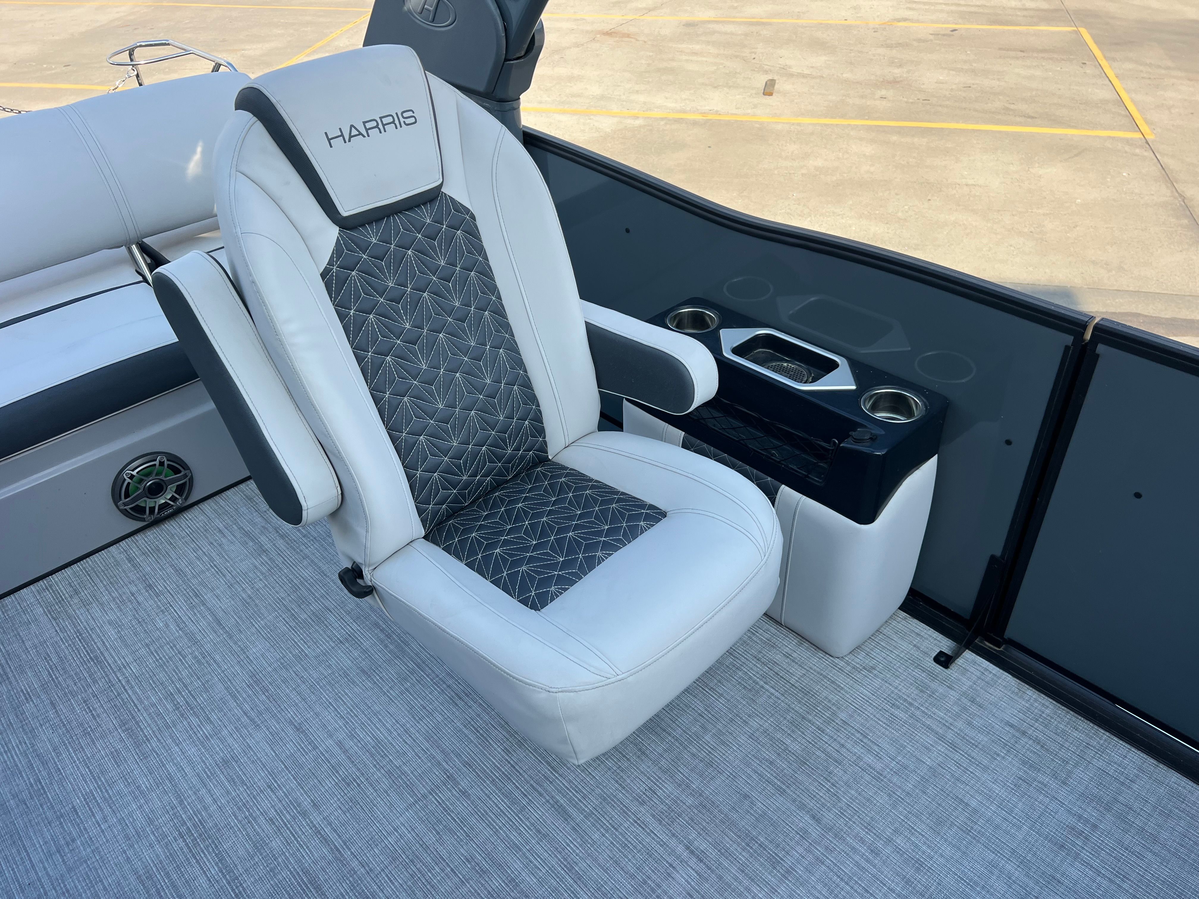 The 2022 Harris Grand Mariner 230 comes equipped with a range of features designed to enhance your time on the water. Its spacious deck layout provides plenty of room for guests to move about comfortably, while the plush seating invites you to sit back and unwind. The pontoon’s thoughtful design ensures that every inch of space is utilized efficiently, making it ideal for socializing, sunbathing, or enjoying a meal with loved ones. The high-quality construction and attention to detail are evident throughout, from the durable flooring to the stylish railings and fixtures. With its generous length and well-planned layout, this Harris boat for sale offers both functionality and elegance.