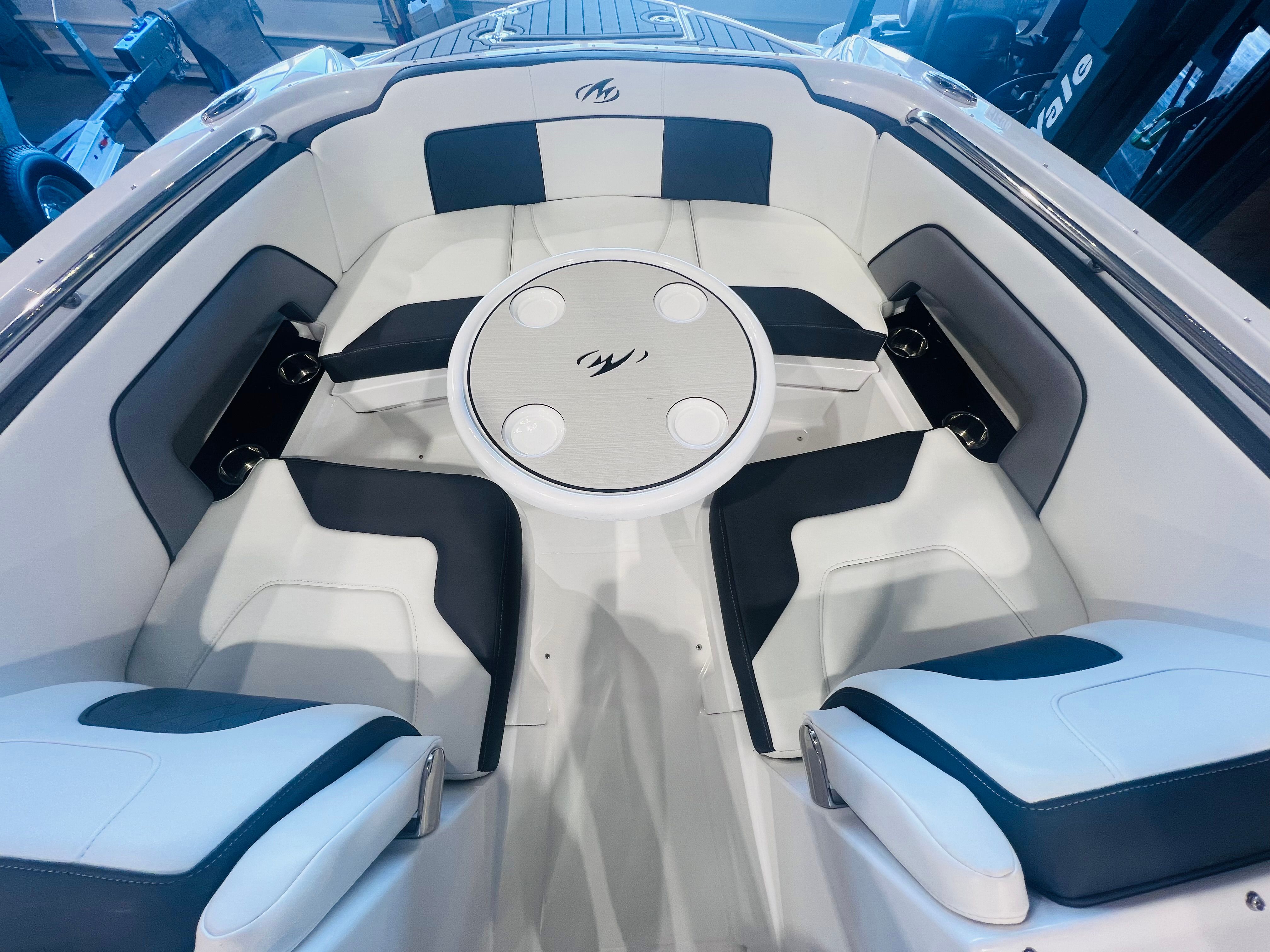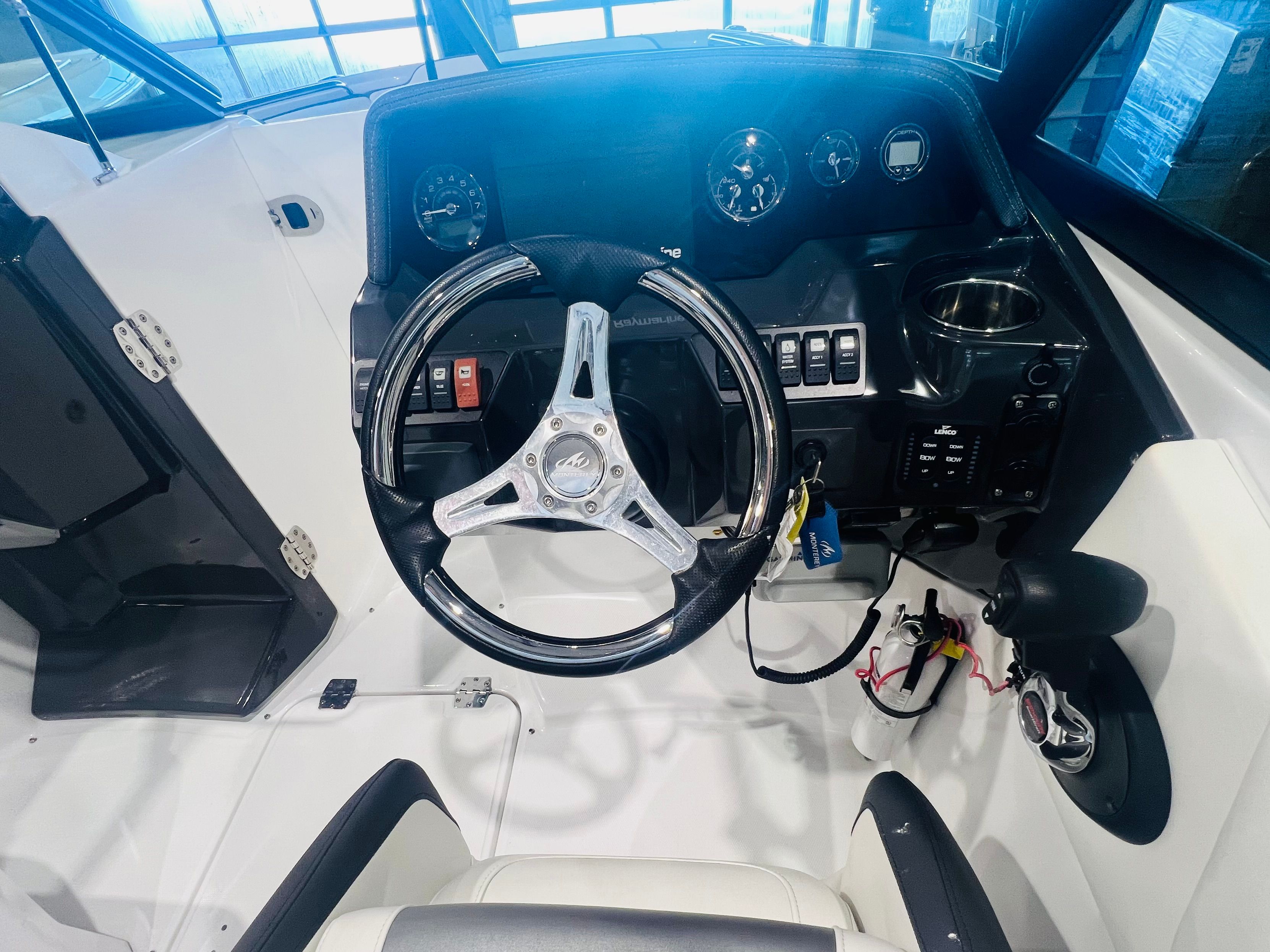 The Monterey M-65 Bowrider is designed to maximize comfort, convenience, and enjoyment on the water. Its spacious layout offers ample seating for family and friends, making it perfect for entertaining or relaxing in style. The open bow area provides plenty of room to stretch out and soak up the sun, while the thoughtfully arranged cockpit ensures everyone has a comfortable spot to enjoy the ride. Premium materials and finishes throughout the boat create a luxurious atmosphere, and the ergonomic helm station puts all controls within easy reach for the captain.With a length of just over 29 feet, the M-65 offers generous storage options for all your gear, water toys, and essentials. The smart use of space means you can bring everything you need for a day on the water without feeling cramped or cluttered. The boat’s design also makes it easy to access the water for swimming, snorkeling, or boarding watercraft, adding to its versatility and appeal.