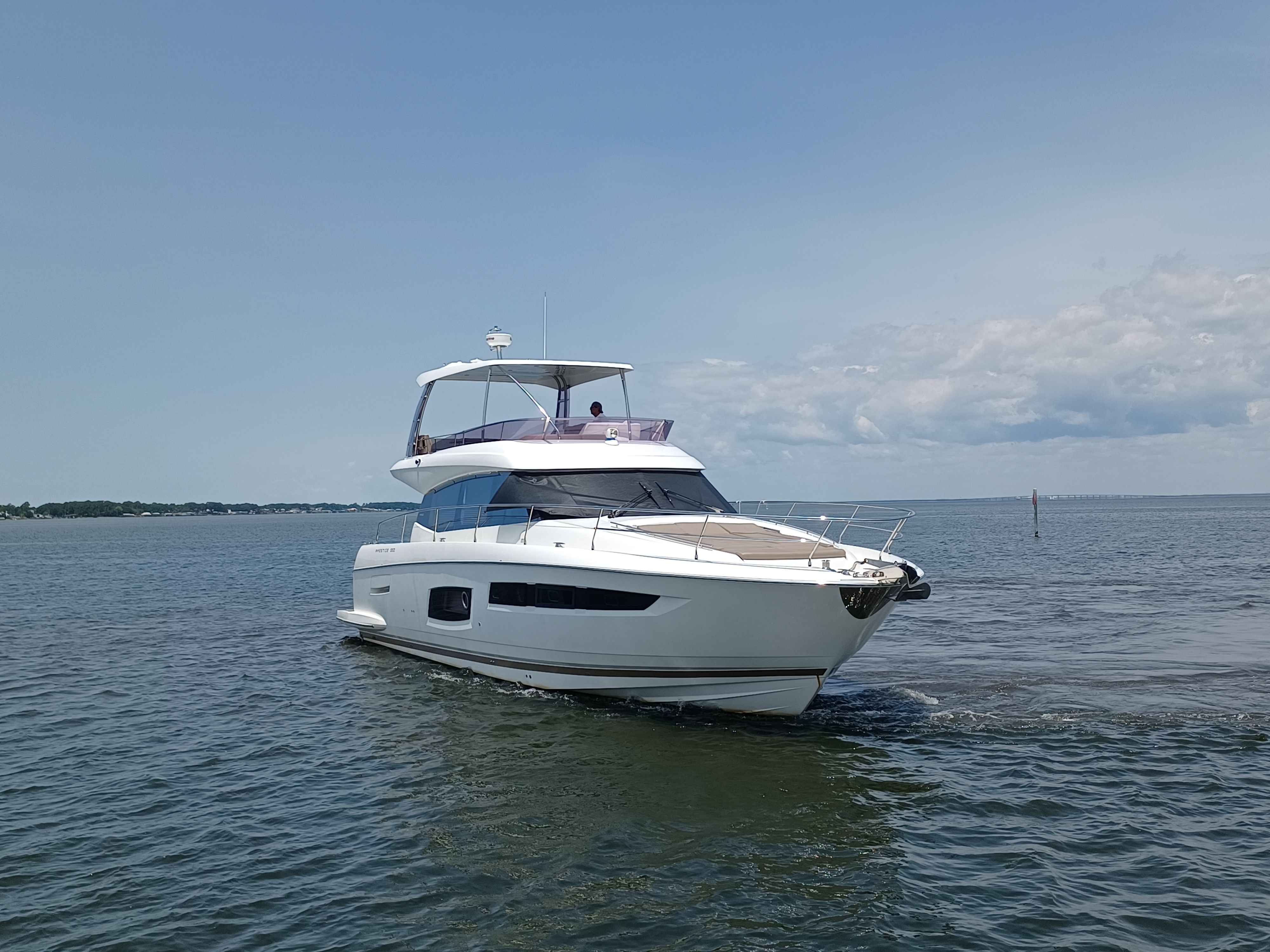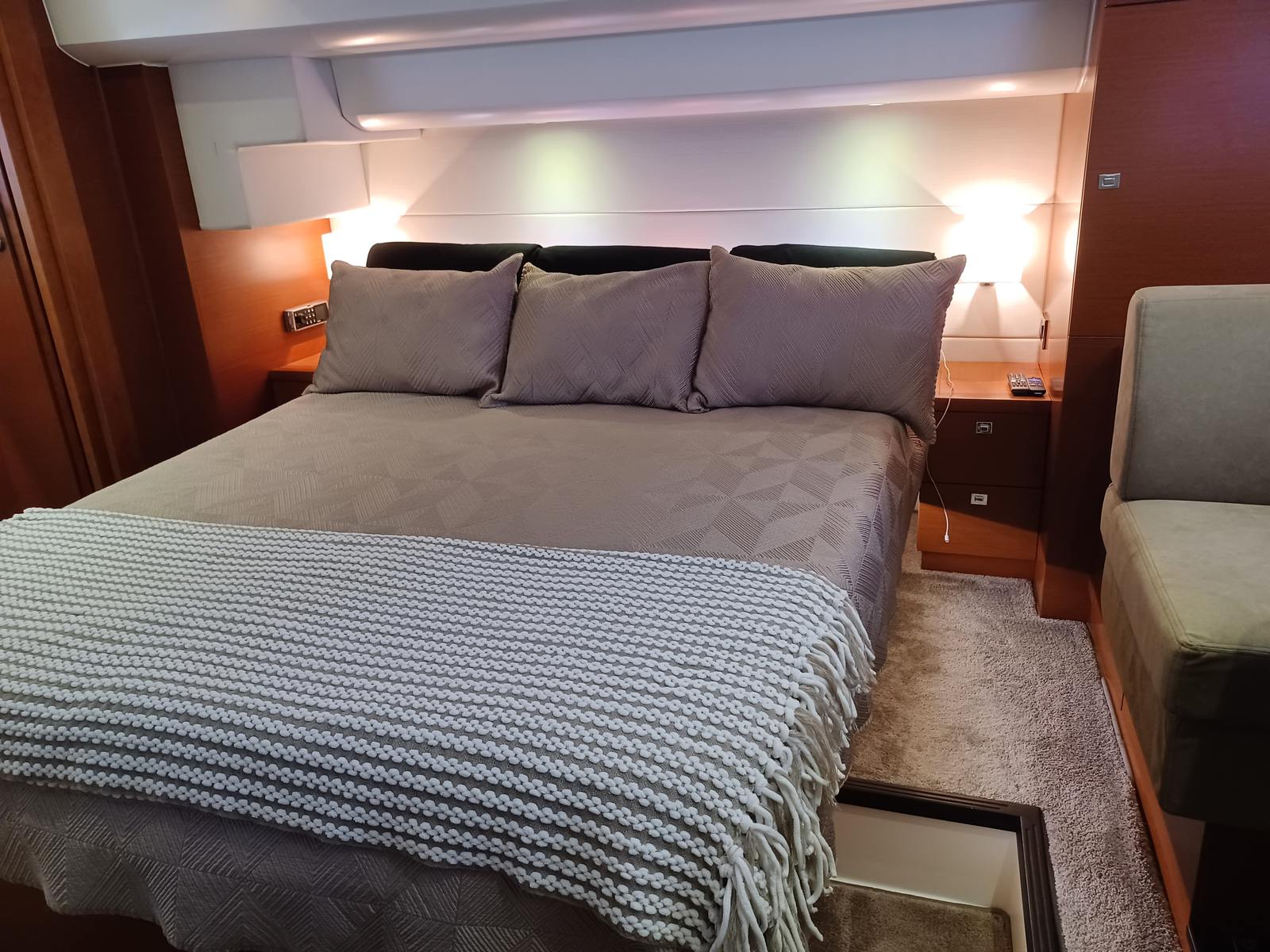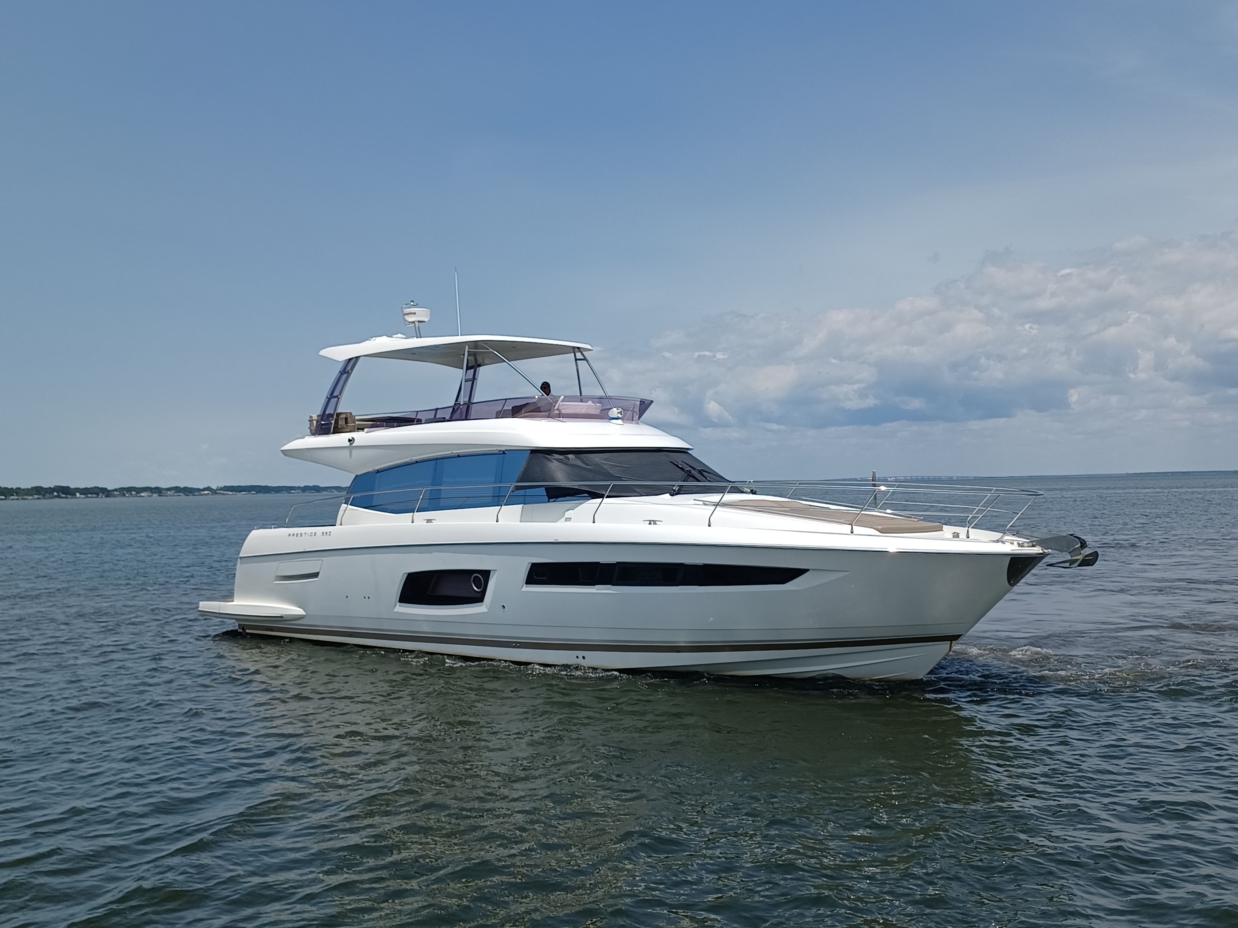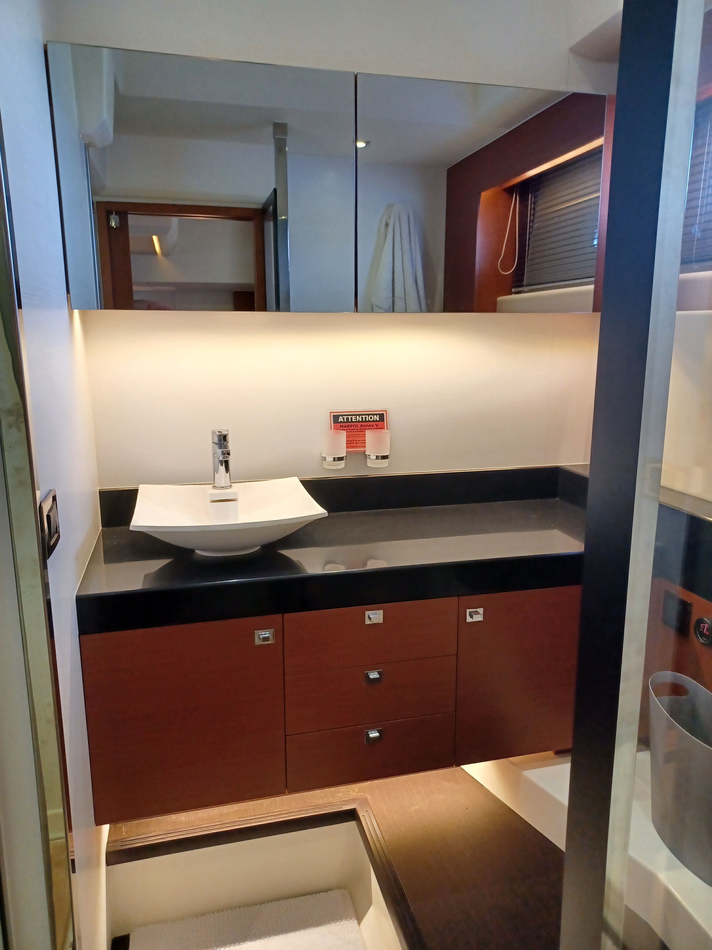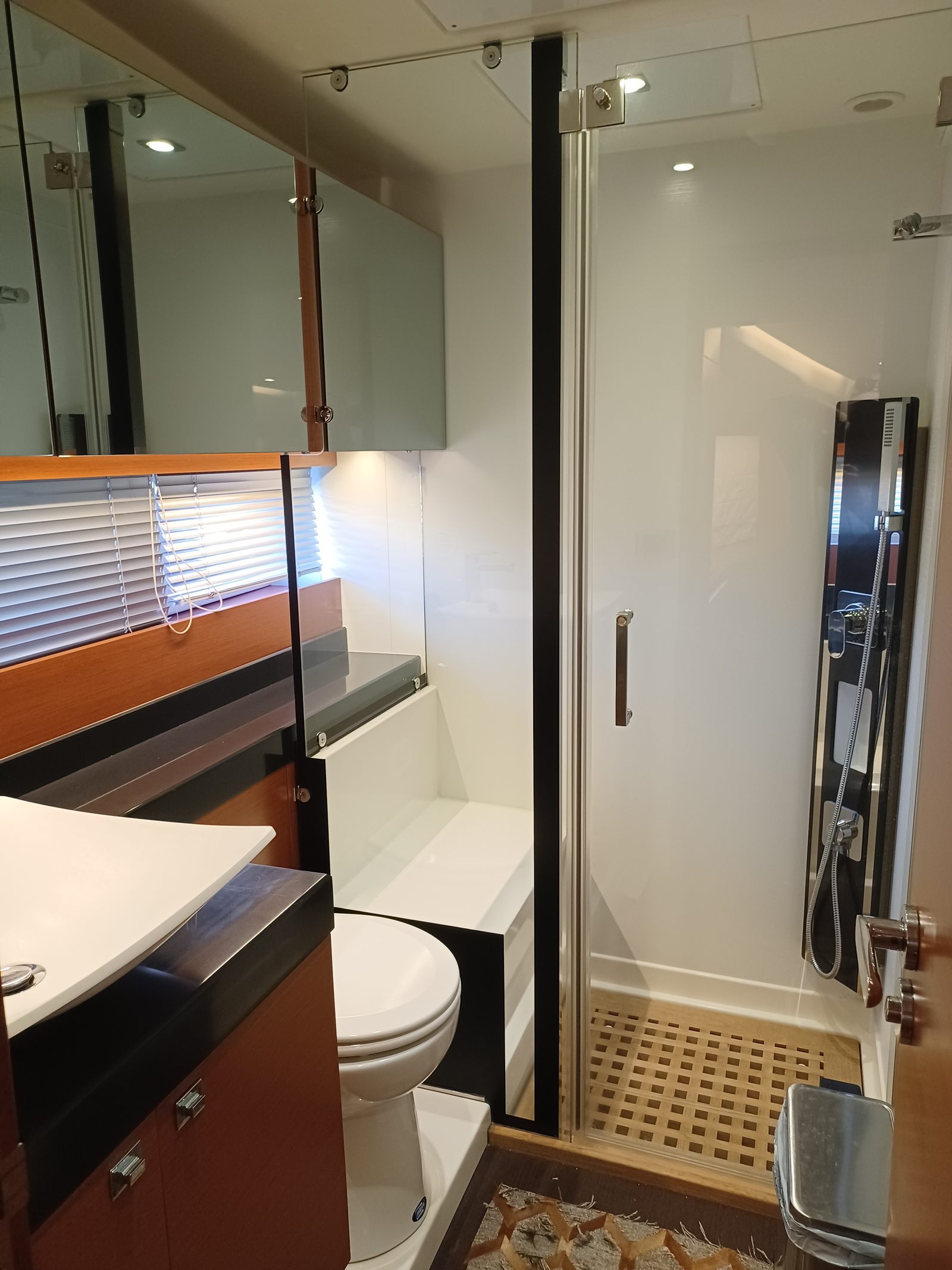 The Prestige 550 Flybridge is a 3-stateroom, 2-head layout with a private master suite amidships with a private entrance from the guest quarters. The master has a spacious ensuite head with separate stall shower and a walk-in closet. There is a spacious VIP stateroom forward and a third guest stateroom with side-by-side single berths. These share the guest/day head which is equipped with a separate stall shower and electric freshwater flush head. Additionally there is a separate crew cabin and head accessible from the transom.