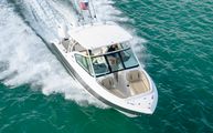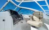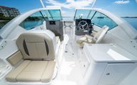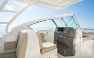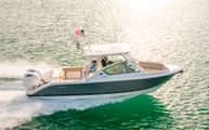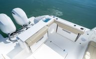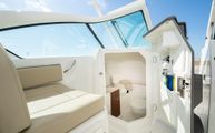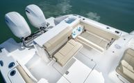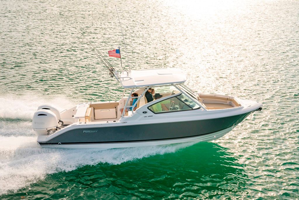 Pursuit’s award-winning dual console boat line includes the DC 266. All the versatility and innovation of the DC 365 – in a style that is unmistakably Pursuit. Featuring a fiberglass hardtop, tempered glass windshield engineered with a vacuum infused fiberglass frame with roomy walkthrough and plenty of storage, the DC 266 dual console boat has an LOA of 27' and is powered by dependable twin Yamaha Outboards. The adjustable helm seat allows for excellent access to the instrumentation and controls as well as the optional Garmin electronics. The exterior seating is complemented by the open bow design that has full wrap around seating with plenty of room for family and friends. Add the sunpad option and the social zone quickly converts to a private oasis. A head and sink allow for freshening up dockside. Foldaway seating quickly transforms a social venue to a wide-open, fish-ready cockpit with 20 gallon livewell, gunwale mounted rod holders and transom fish-box. Whether you’re looking for family time, cruising or casual fishing, the versatile DC 266 dual console boat is ideal for any experience on the water.