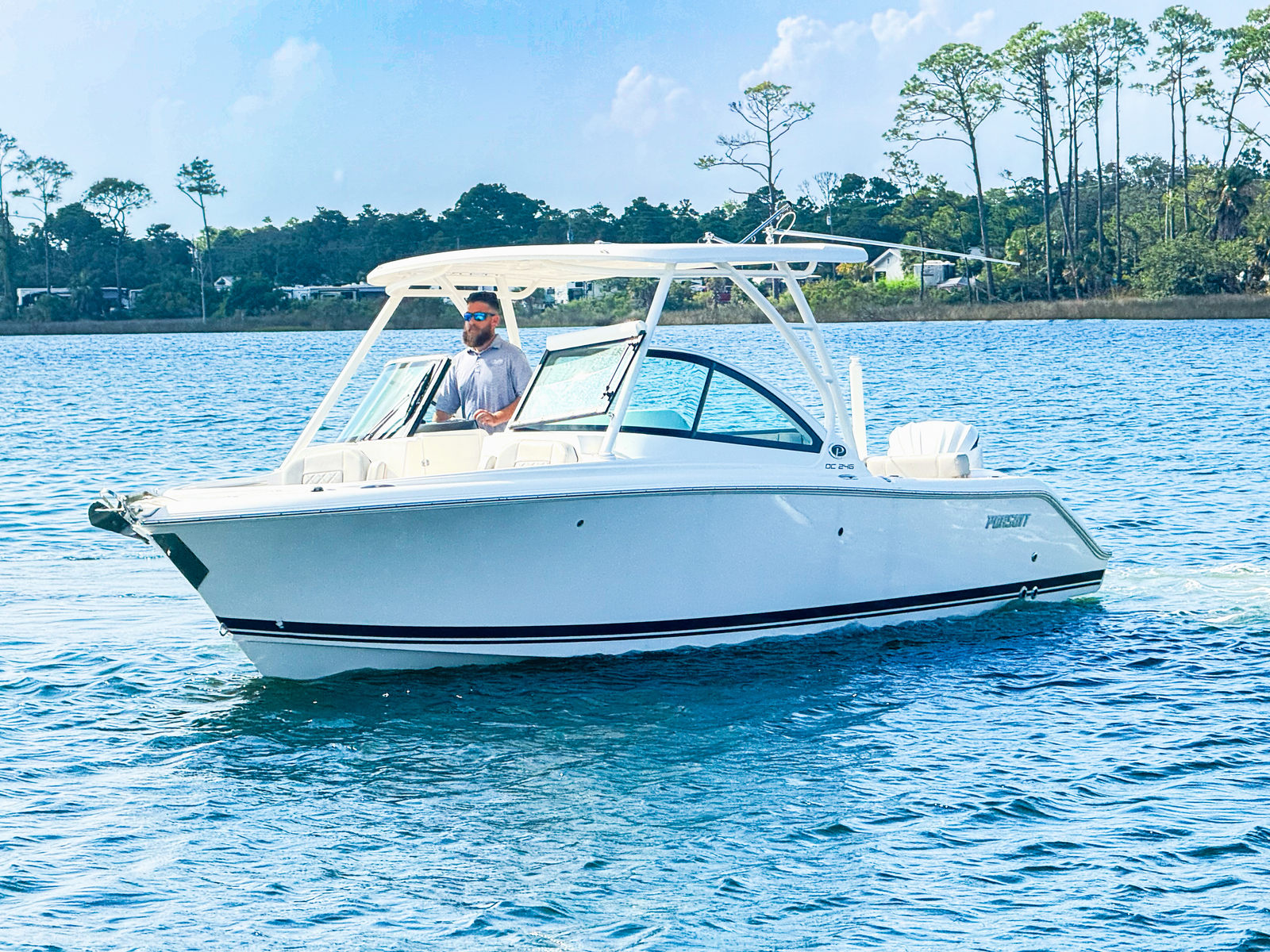 The Pursuit DC 246 truly shines in a variety of scenarios, making it a versatile choice for any boating enthusiast. For families, the spacious layout and comfortable seating provide the perfect setting for weekend outings, picnics, and water sports. Anglers will appreciate the stability and performance of the dual console design, as well as the ample space for casting and reeling in the catch of the day.If you are seeking a luxurious getaway, the DC 246 offers all the amenities you need for a relaxing escape, from the sun pad and sunshade to the elegant interior and convenient fresh water head. Whether you are exploring new coastlines, entertaining friends, or simply unwinding on the water, this Pursuit boat for sale is designed to meet your every need.